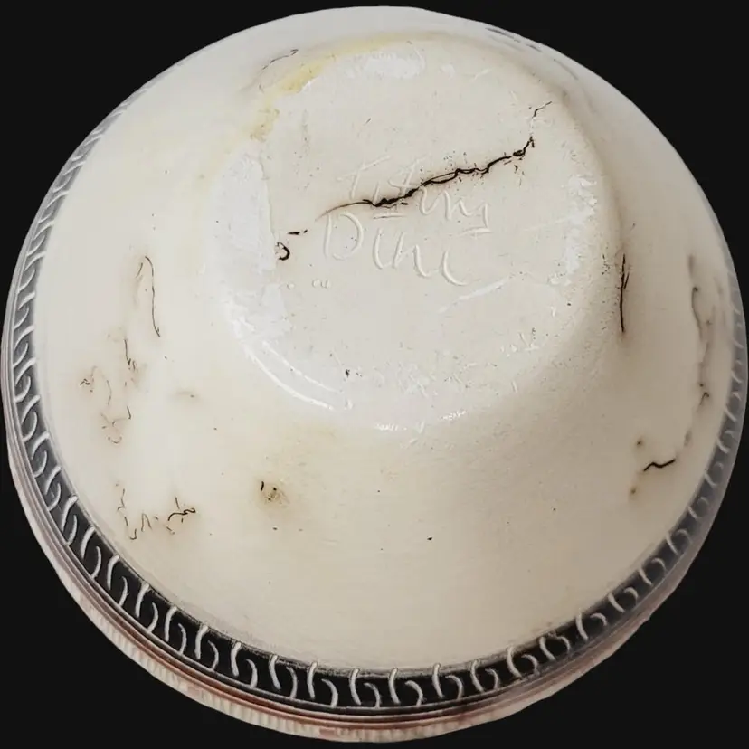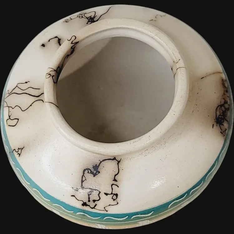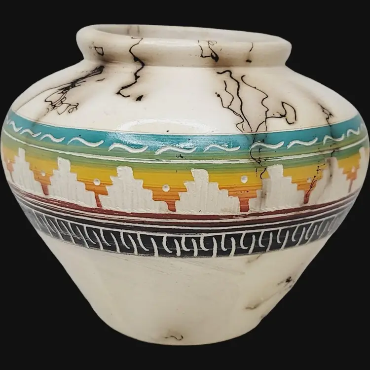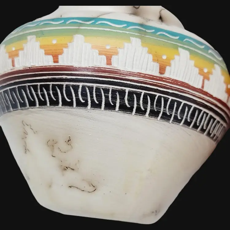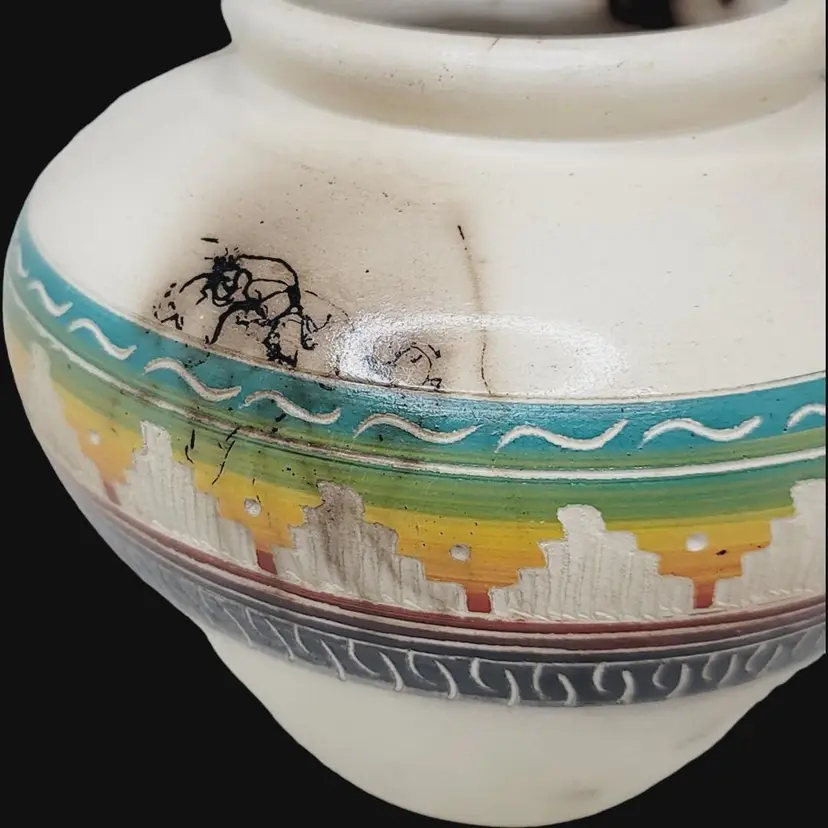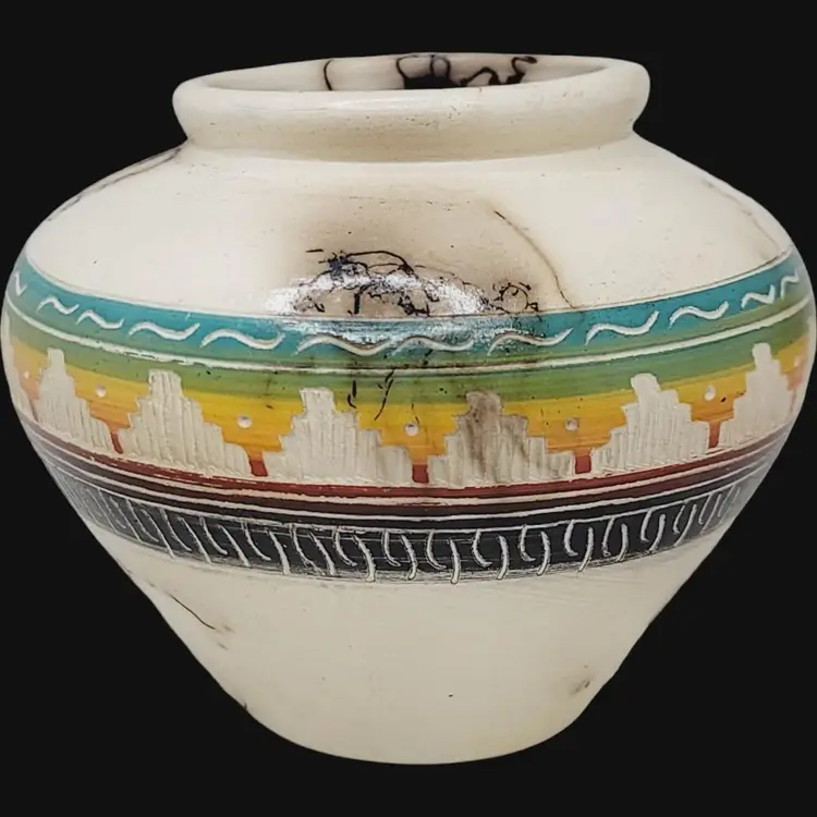 Native American Navajo Pottery 4" Etched Horse Hair Rainbow Vase Signed