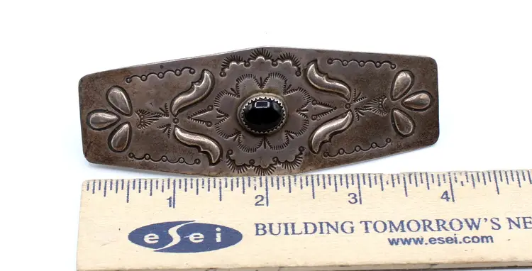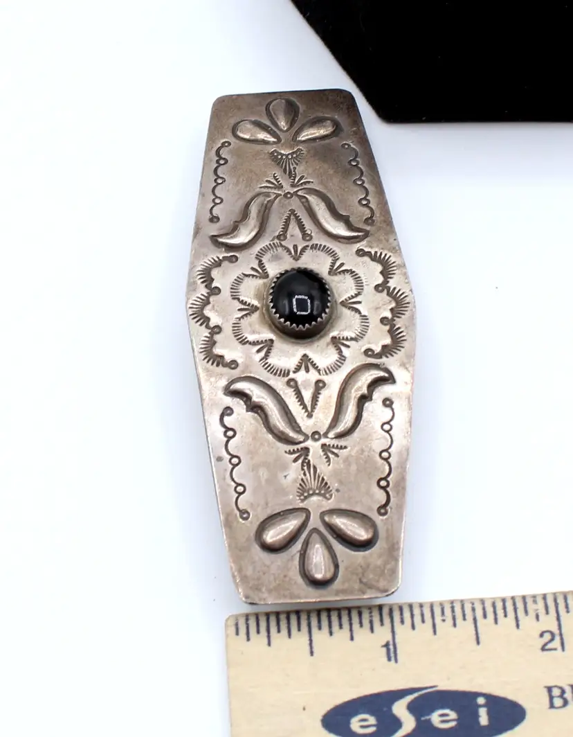 Beautiful barrette signed W sterling T. Possible a Wilson Tsosie. Fantastic hand stamp and repousse' work. Single onyx set in a saw tooth bezel set in the middle of the flower design. Measures 4" x 1.5"