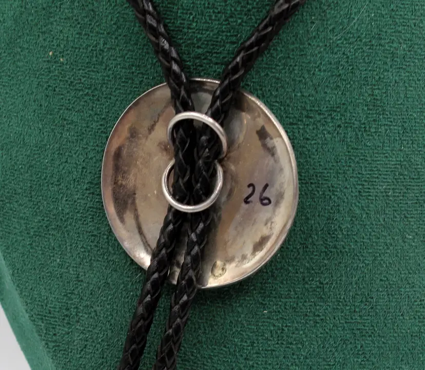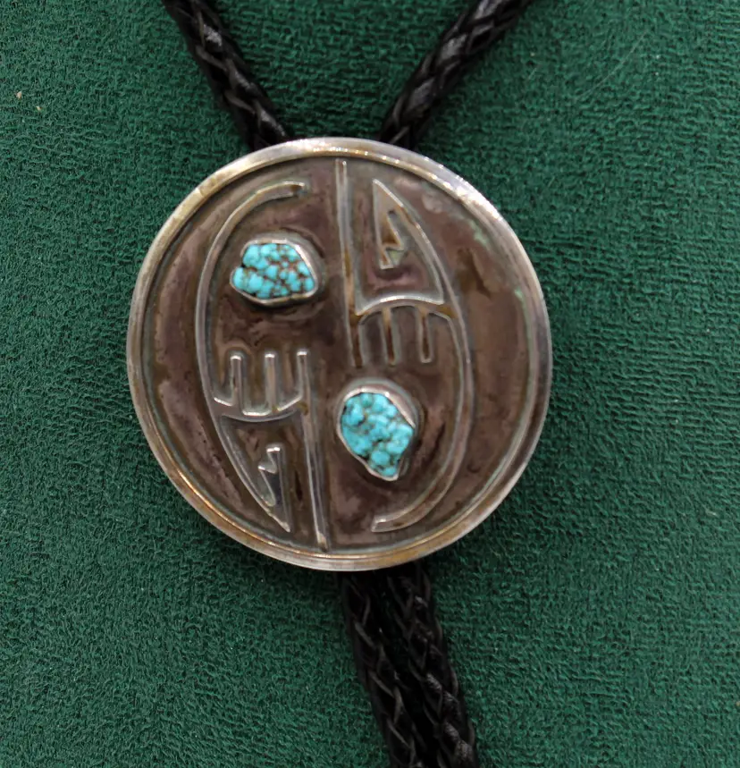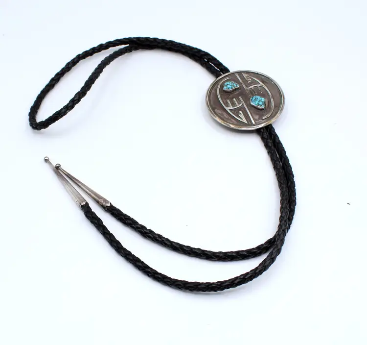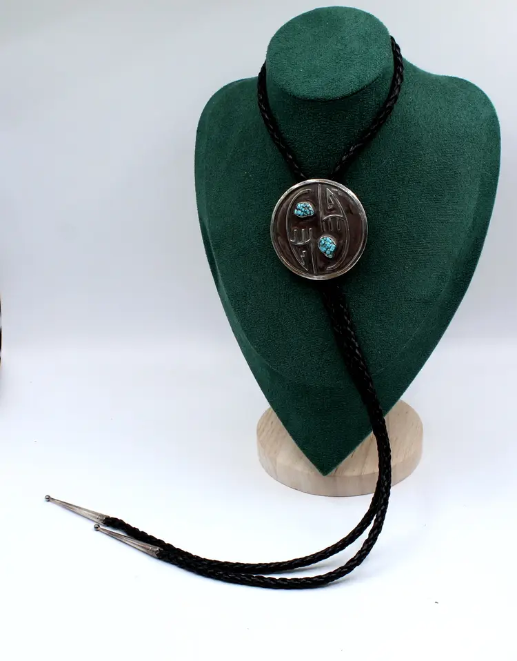 Fantastic unsigned overlay two turquoise nuggets set in a smooth bezel, somewhat of a ying yang design bolo. Soft leather tie with sterling tips. Pendant measures 2.25". This certainly could be used just as a pendant or scarf slide as well