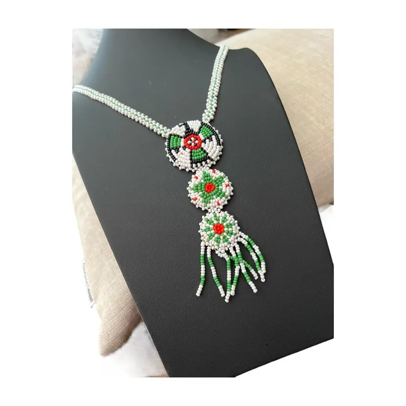 Native Thunderbird Beaded Necklace With Green Red And White Accents