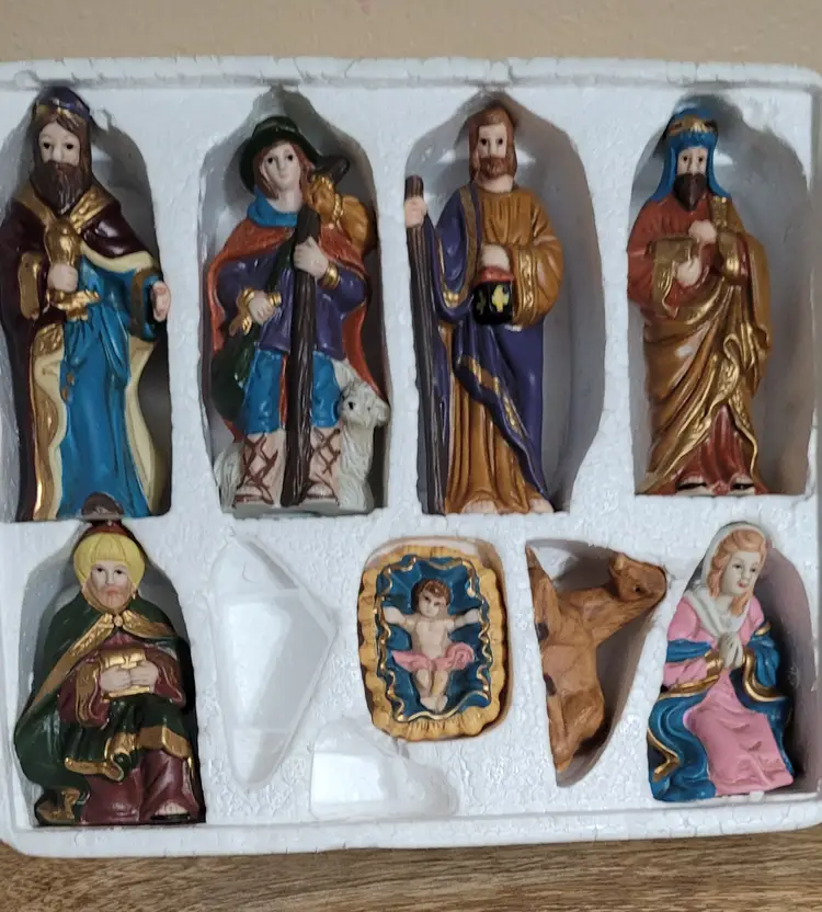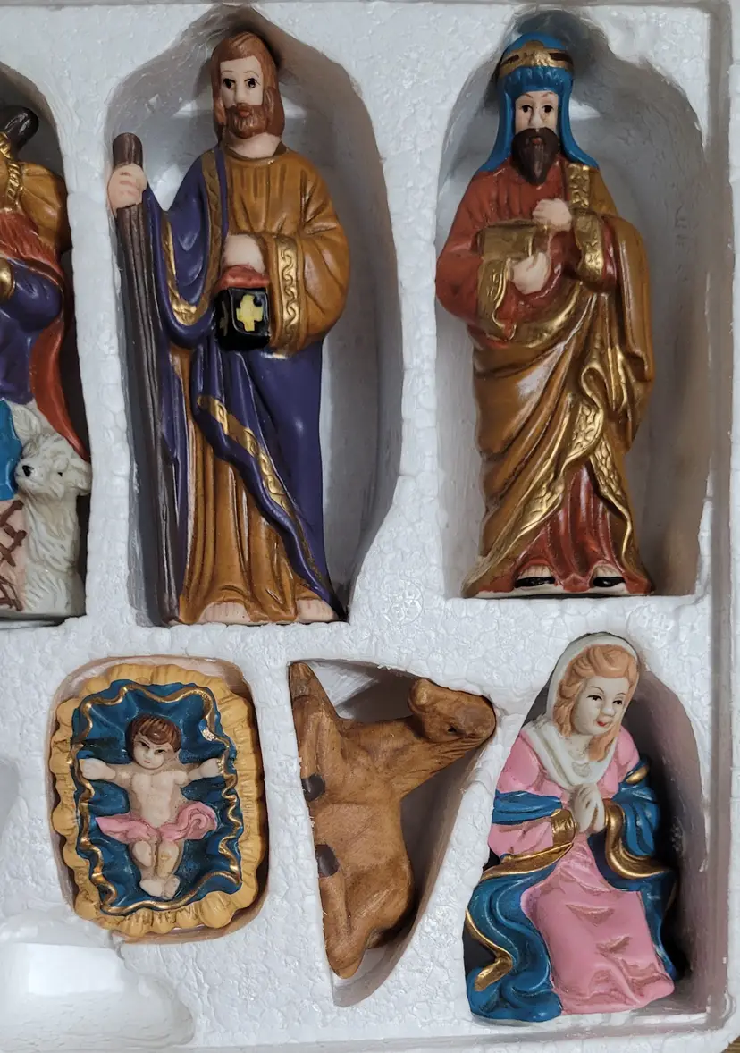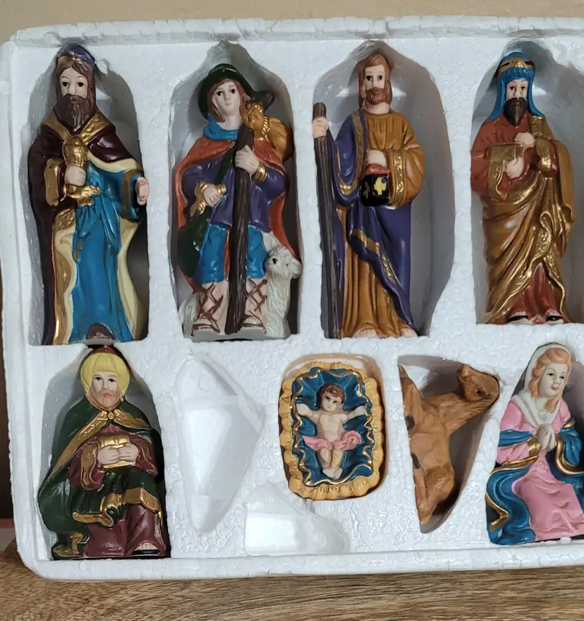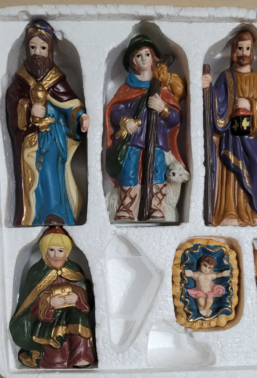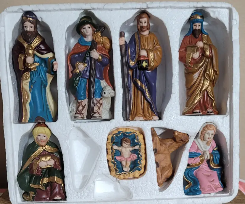 This set of 8 ceramic figurines features characters from the Nativity scene, perfect for collectors or those looking to add a festive touch to their holiday decor. Each piece is crafted from high-quality ceramic, adding a touch of elegance and tradition to any display. This Nativity figurine set is a charming addition to any holiday collection, bringing the story of the Nativity to life through beautifully crafted pieces.