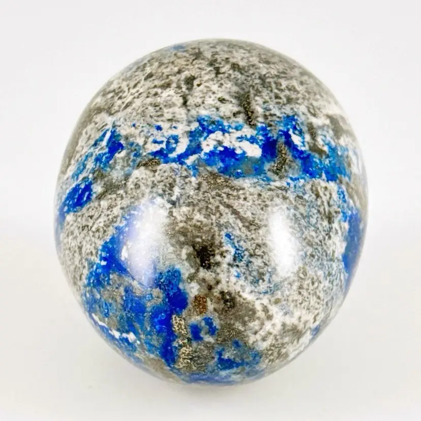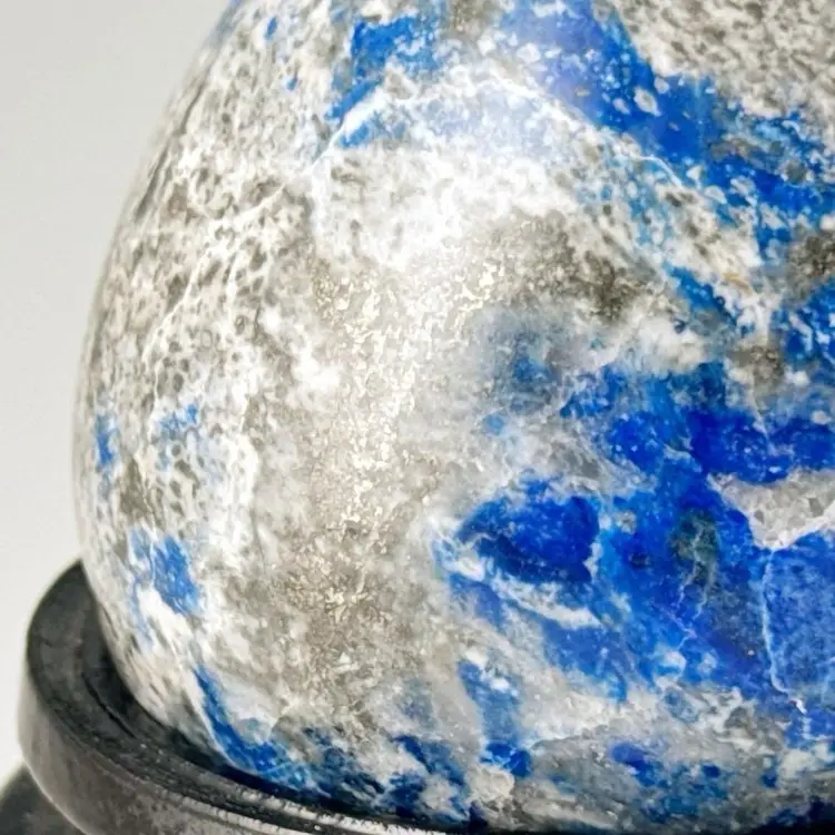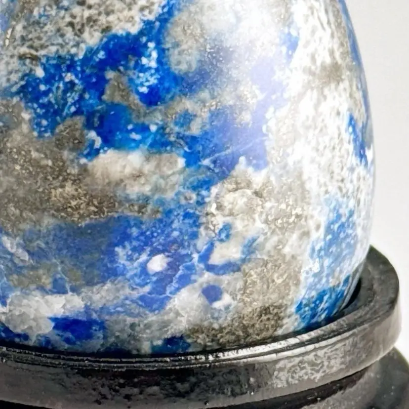 • Lapis lazuli rock egg on wooden stand • Blue, gray, gold & white • Vintage • No issues found
