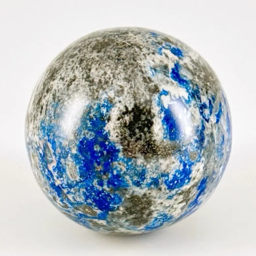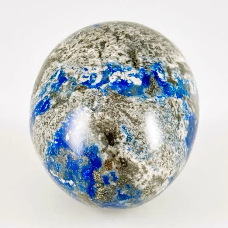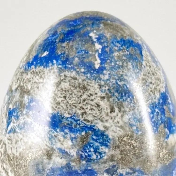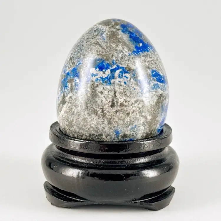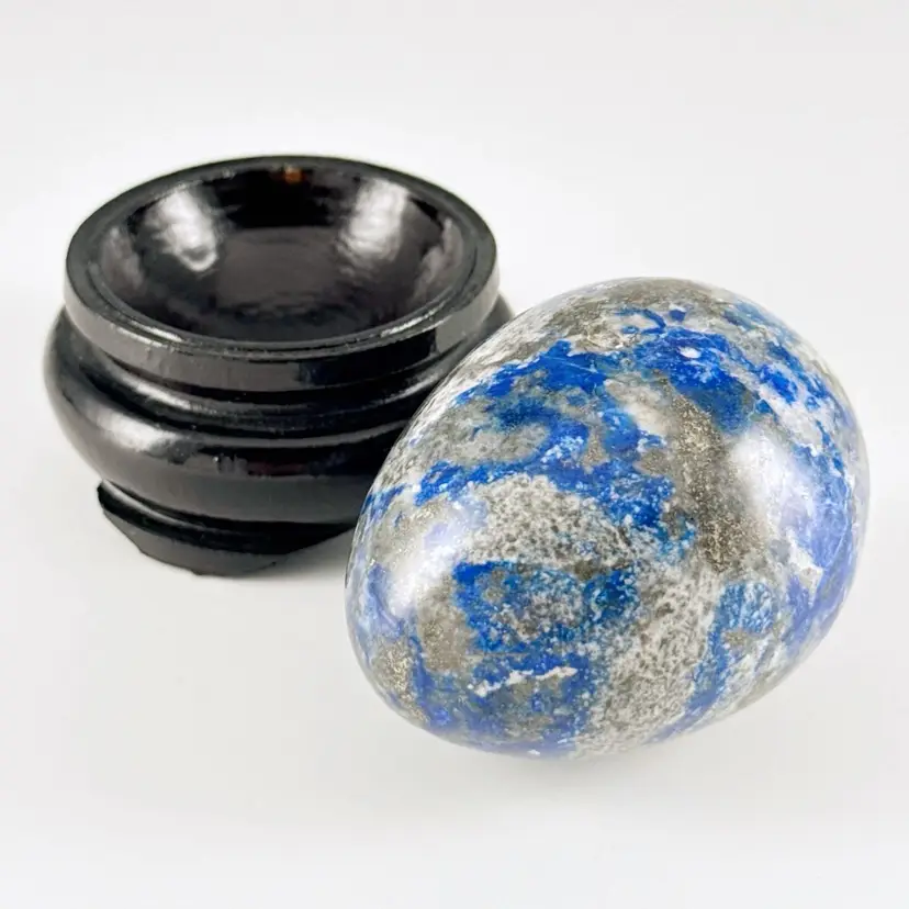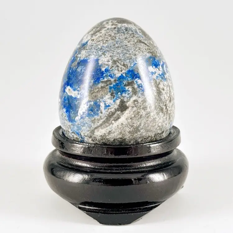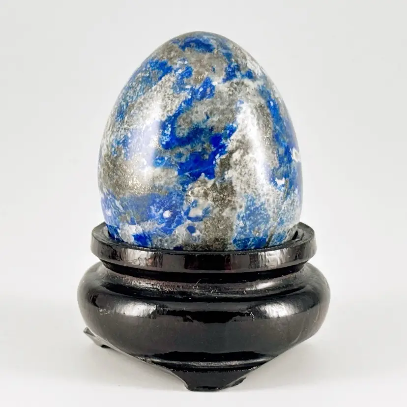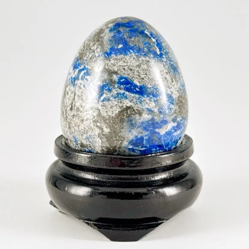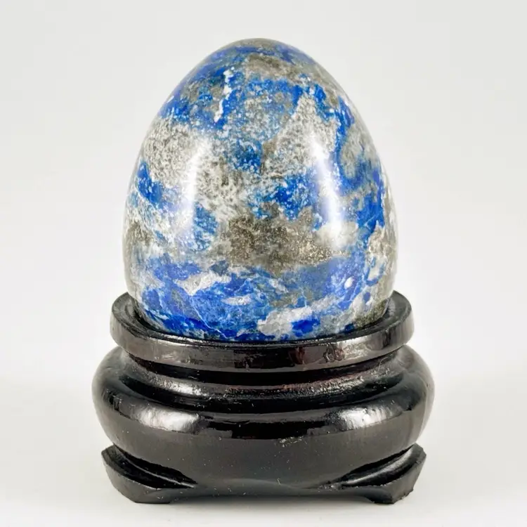 Beautiful, natural lapis lazuli 62mm carved egg, smoothly polished to highlight the veins of calcite and pyrite (fool's gold) deposits! It displays beautifully on the included lacquered and footed wood base.