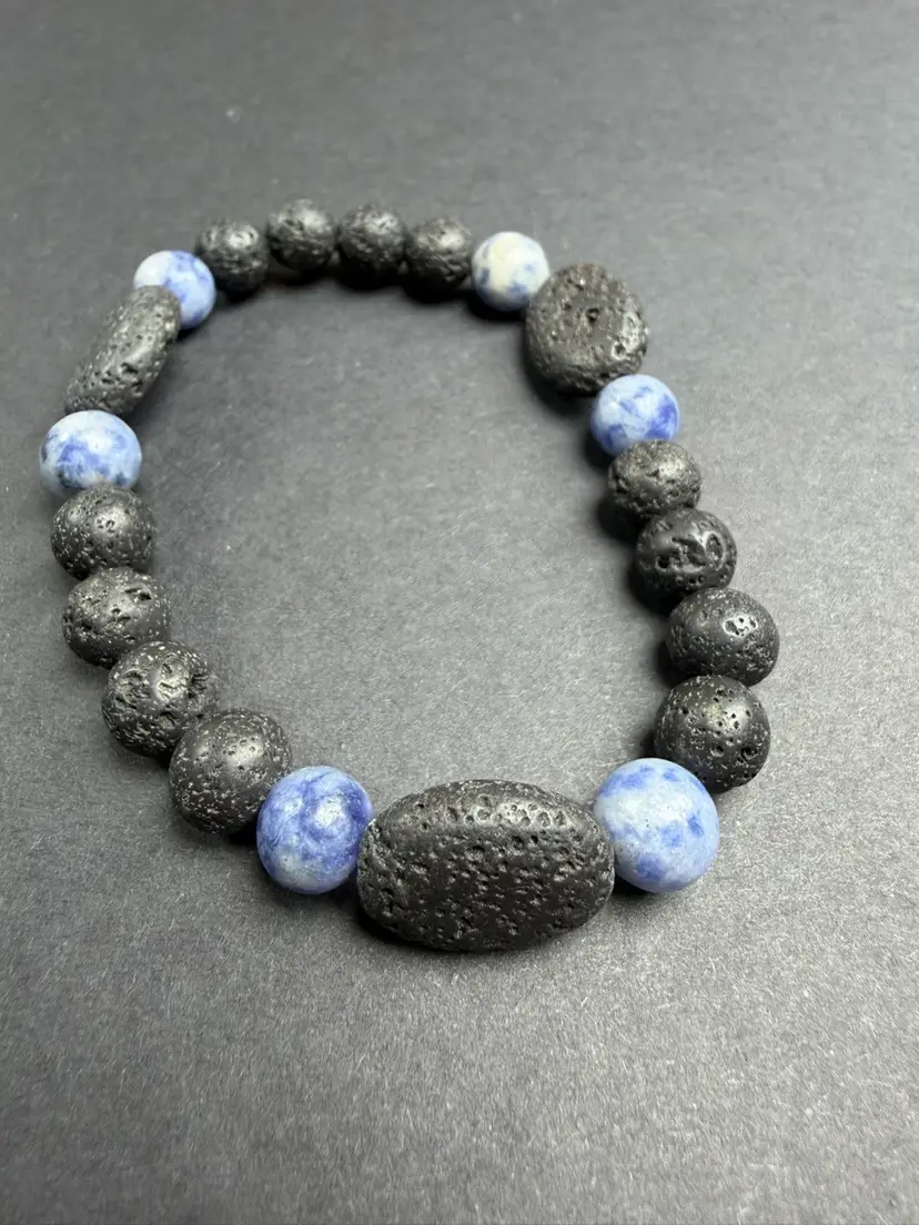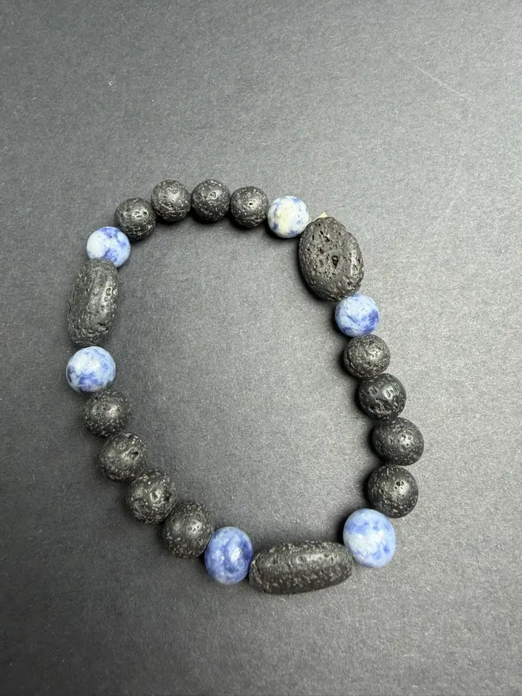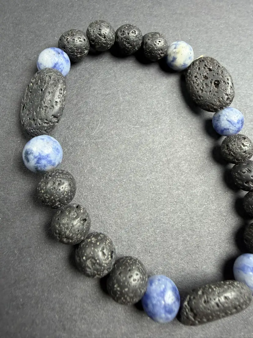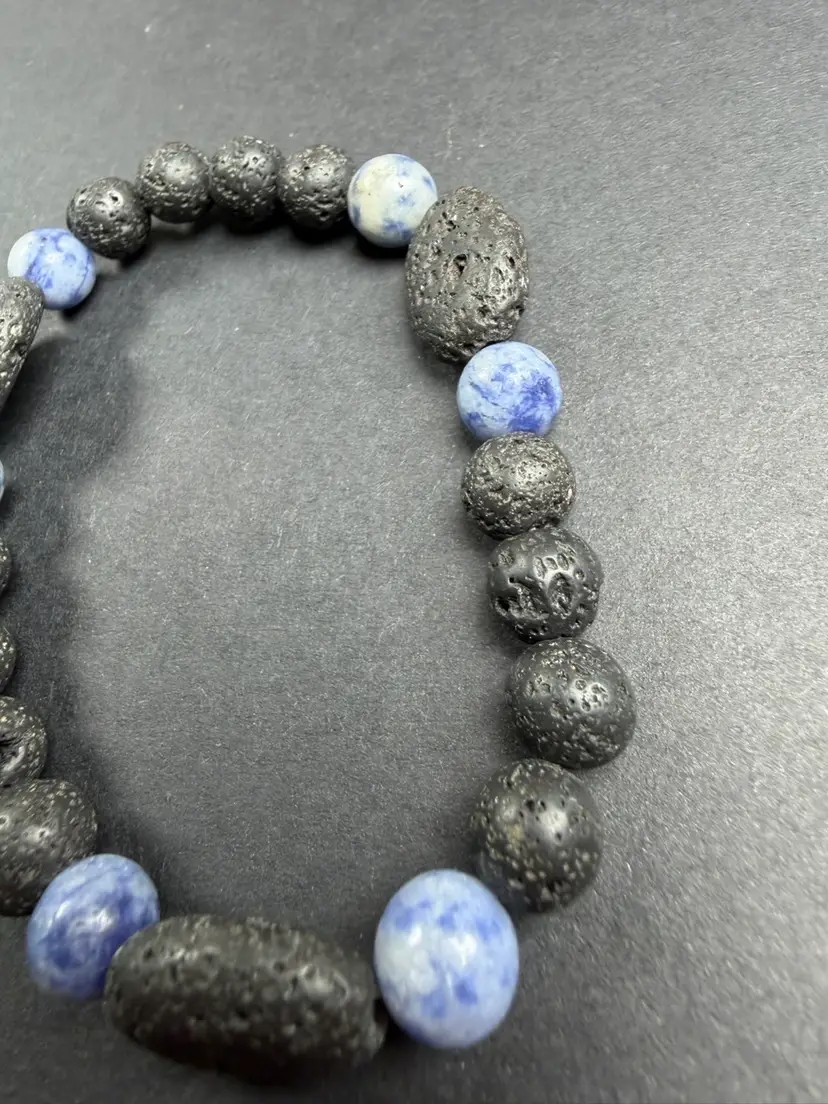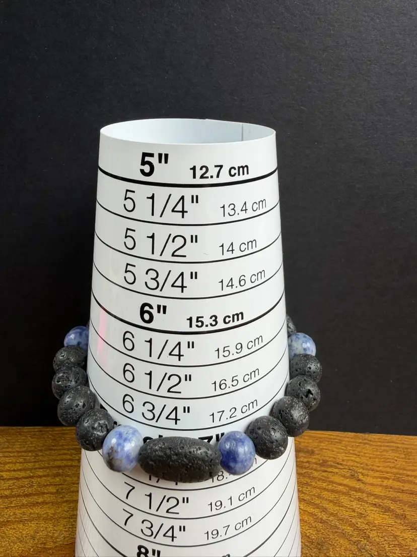 This bracelet is in new condition. It has Lava Rock & Sodalite 9mm beads, the bracelet is a stretch that can comfortably fit 7-7.25" wrist. You will receive the exact bracelet shown.