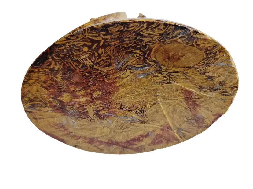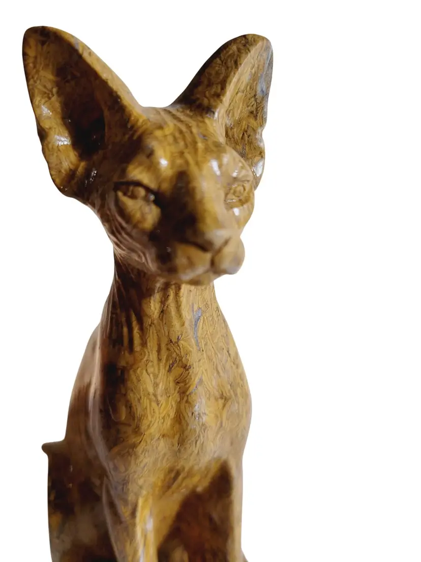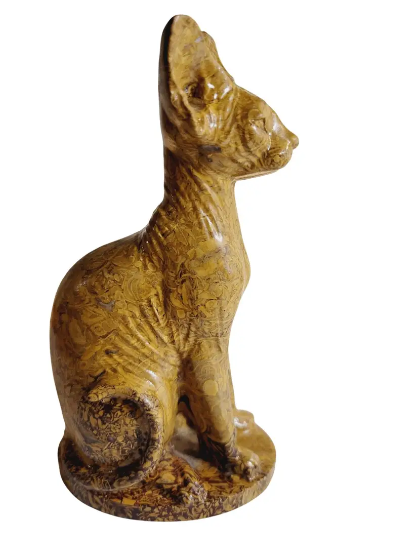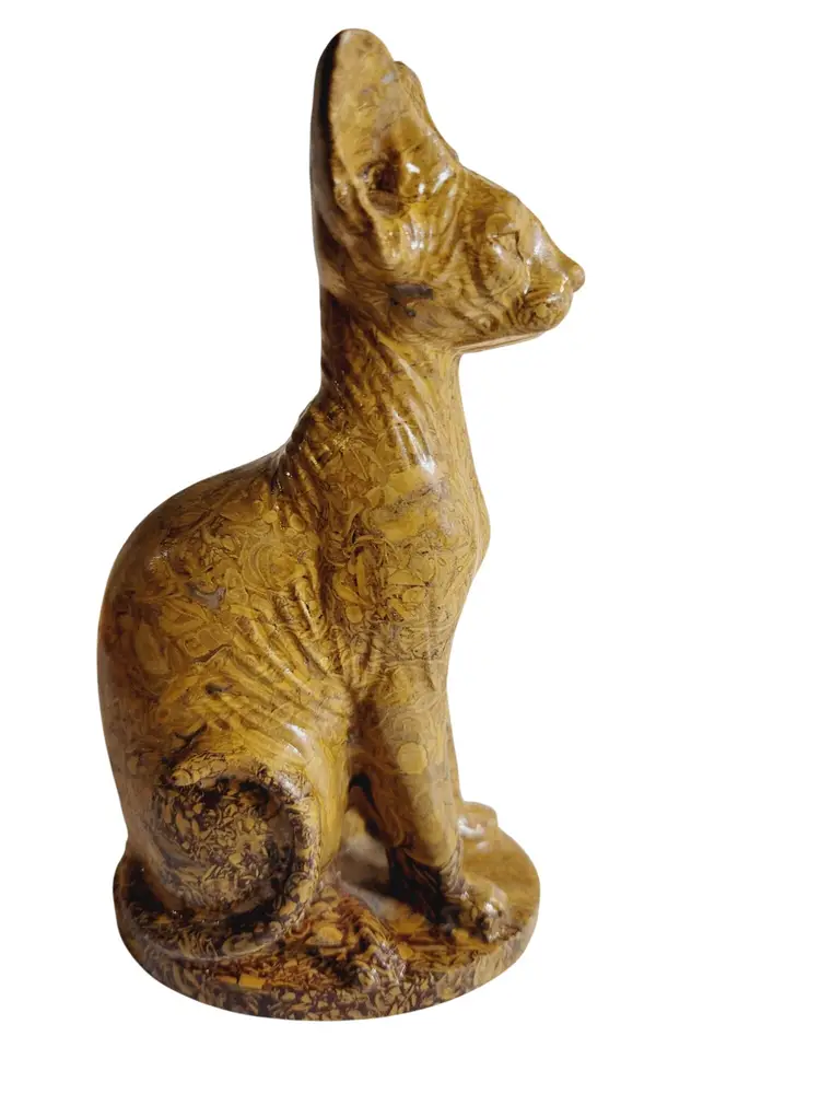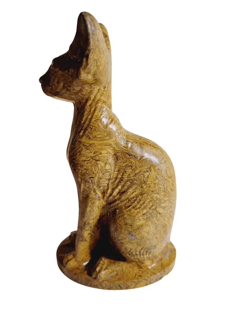 This exquisite hand-carved figurine depicts an Abyssinian cat, reminiscent of ancient feline sculptures. Crafted from natural Mariam Jasper, the intricate patterns and textures highlight the artisan's skill. At 6 inches tall, this piece serves as an elegant addition to any collection, evoking a sense of timeless charm and mystique.