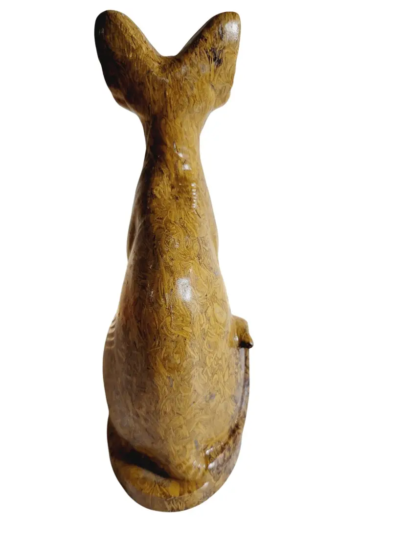 • Hand-carved from natural Mariam Jasper • Detailed craftsmanship with unique patterns • Stands 6 inches tall • Depicts an Abyssinian cat design Excellent condition, no chips or cracks.