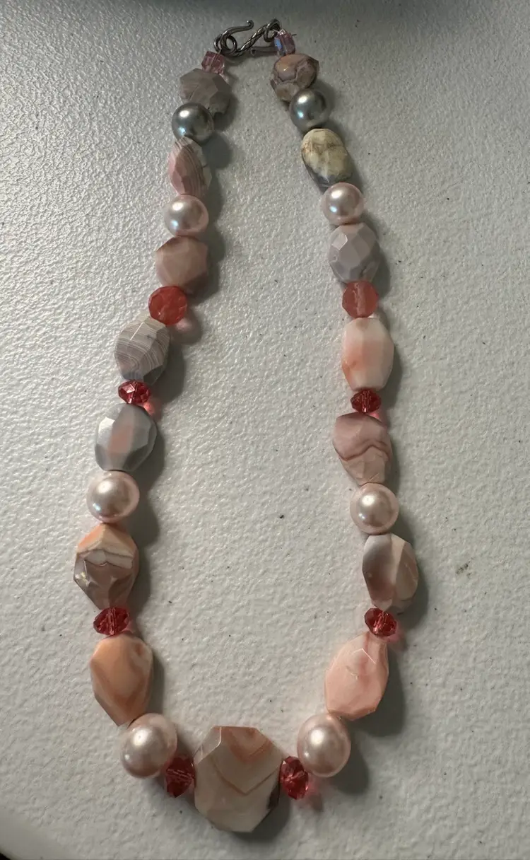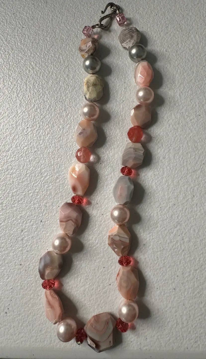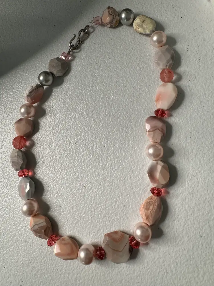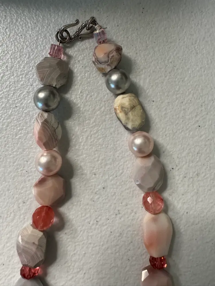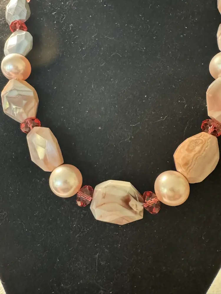 Beautiful pink, natural stone and glass bead necklace. Has full pearls and a beautiful hook closure. Very rare. Excellent condition. Measures 16 inches.
