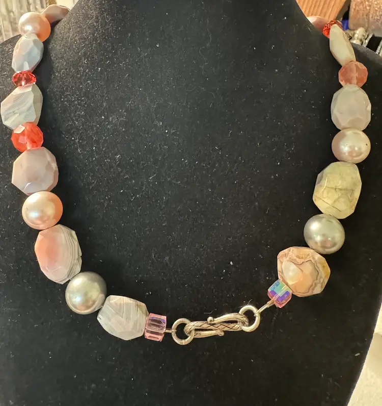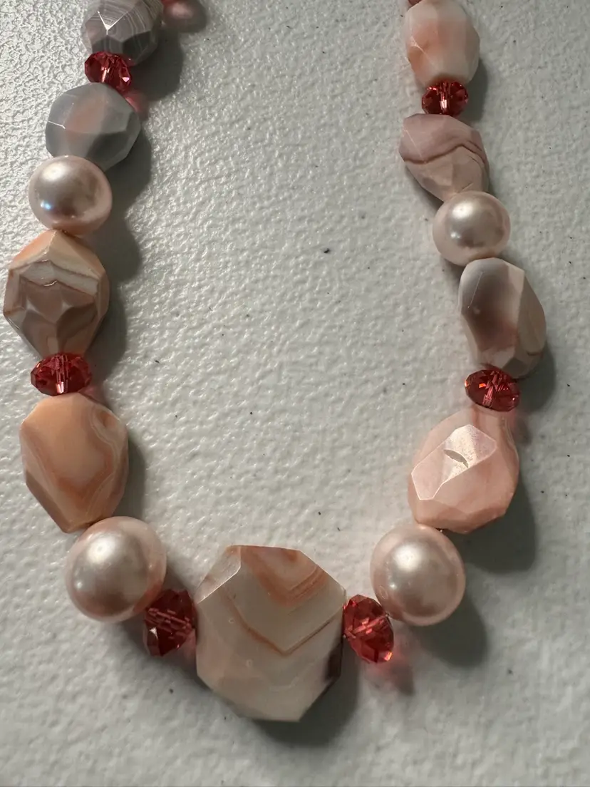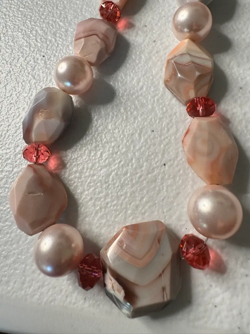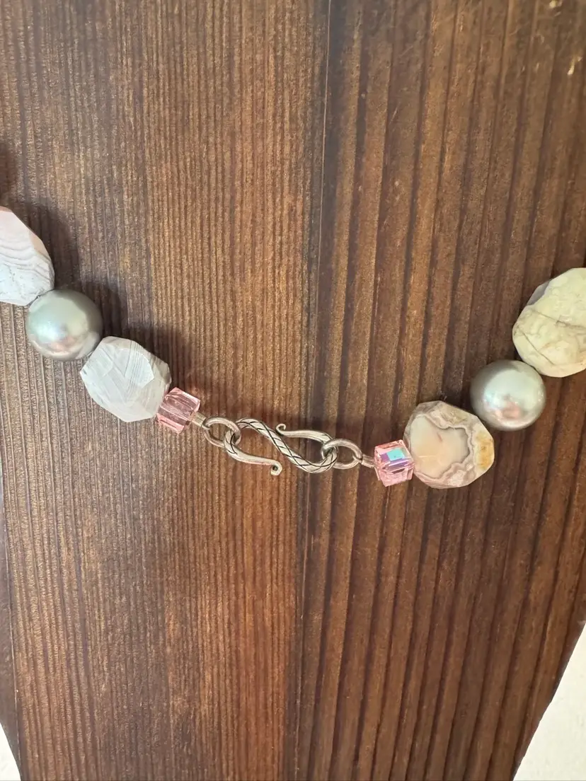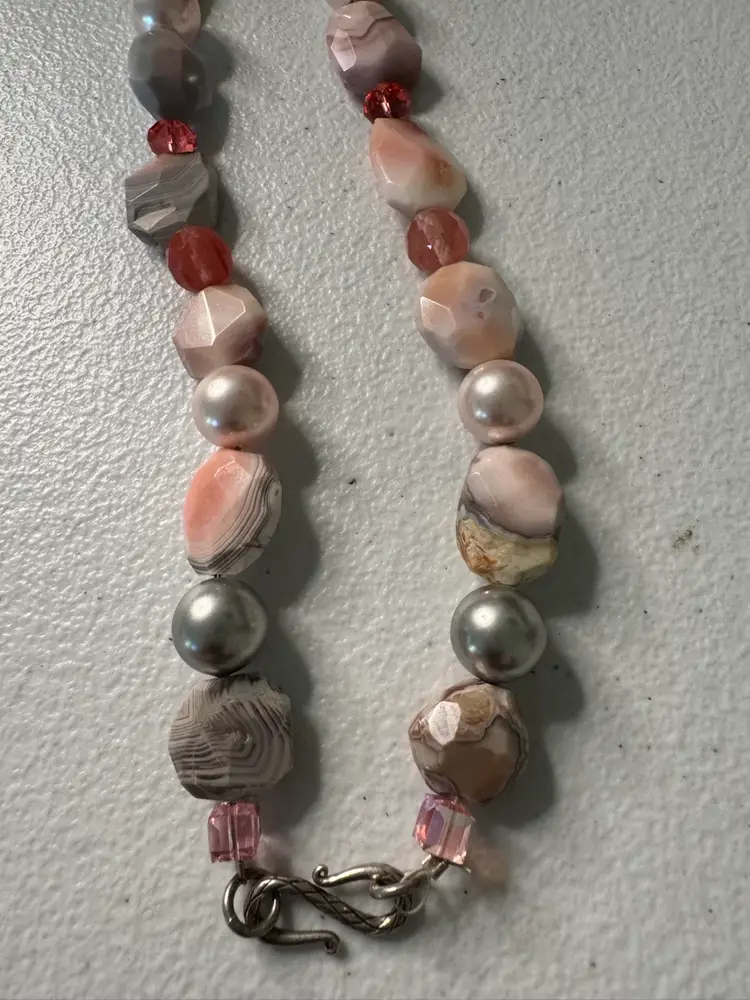 Beautiful pink, natural stone and glass bead necklace. Has full pearls and a beautiful hook closure. Very rare. Excellent condition. Measures 16 inches.