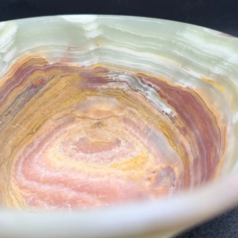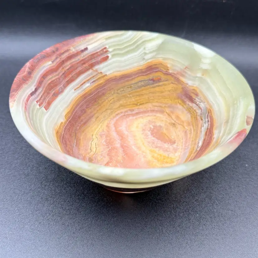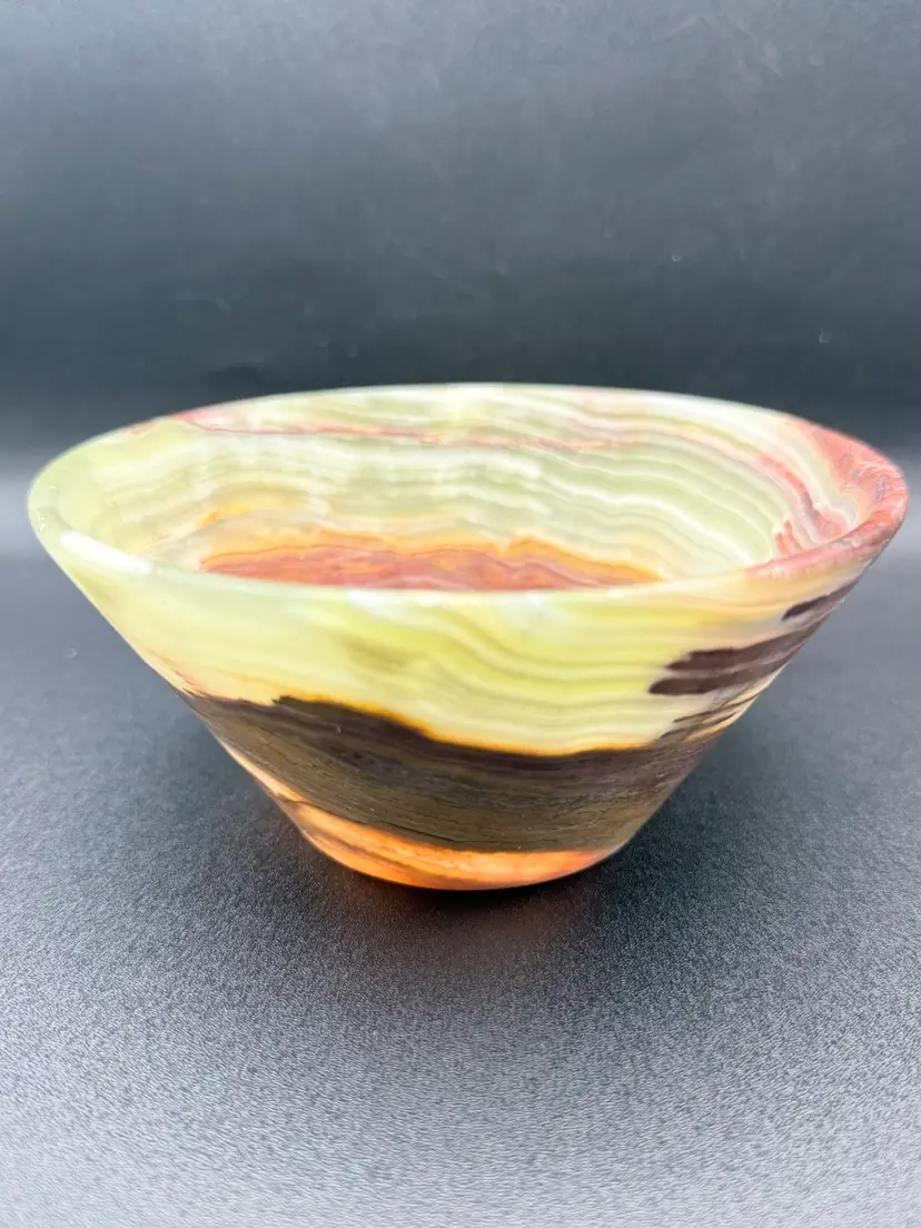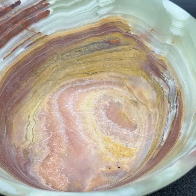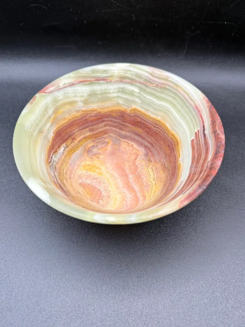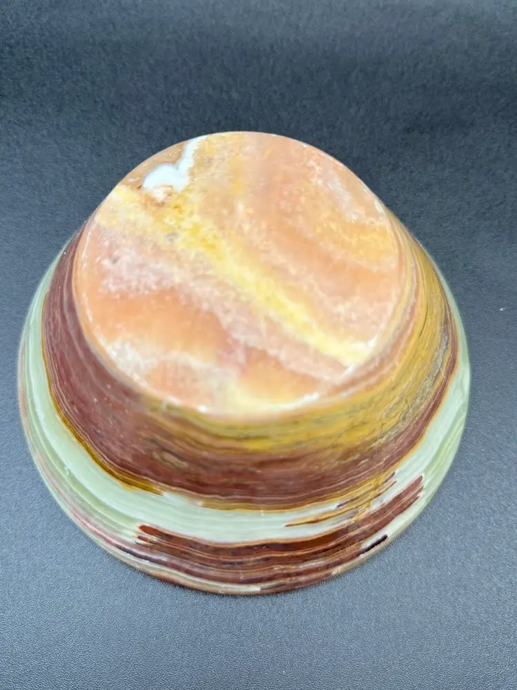 Multiple use banded onyx stone bowl . Beautiful Earthy colors. No chips or cracks 2-1/2” H 5-1/4” diameter