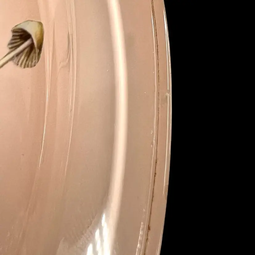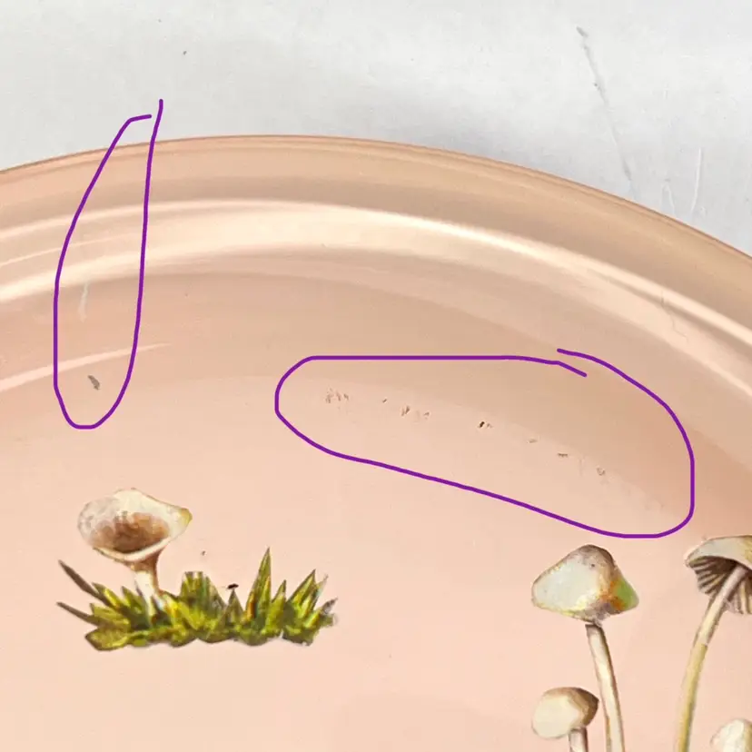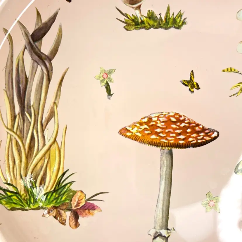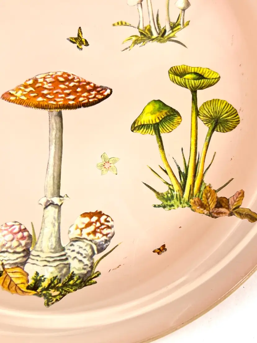 Nature Theme Mushrooms & Butterflies Looks Handmade with Stickers placed on reverse side 8-3/4โ x 3/4โ Glass Plate Pink Background Orange painted on reverse Weighs over 1 pound Condition: -Some areas have paint loss on reverse which shows on the front (see photos with purple circles areas) -Very minor edge wear, no cracks in glass. See last 2 photos of edges