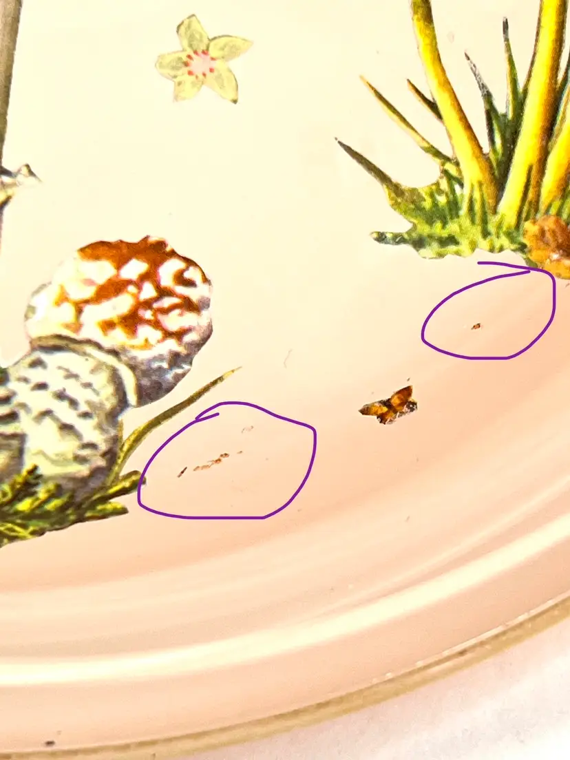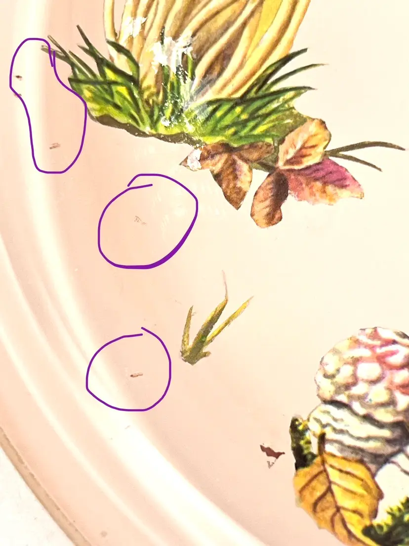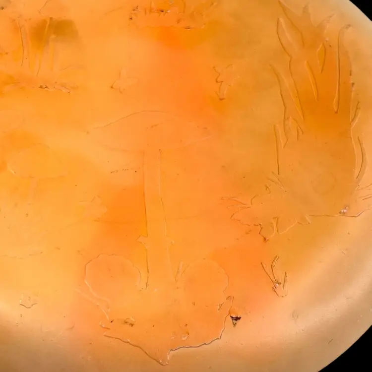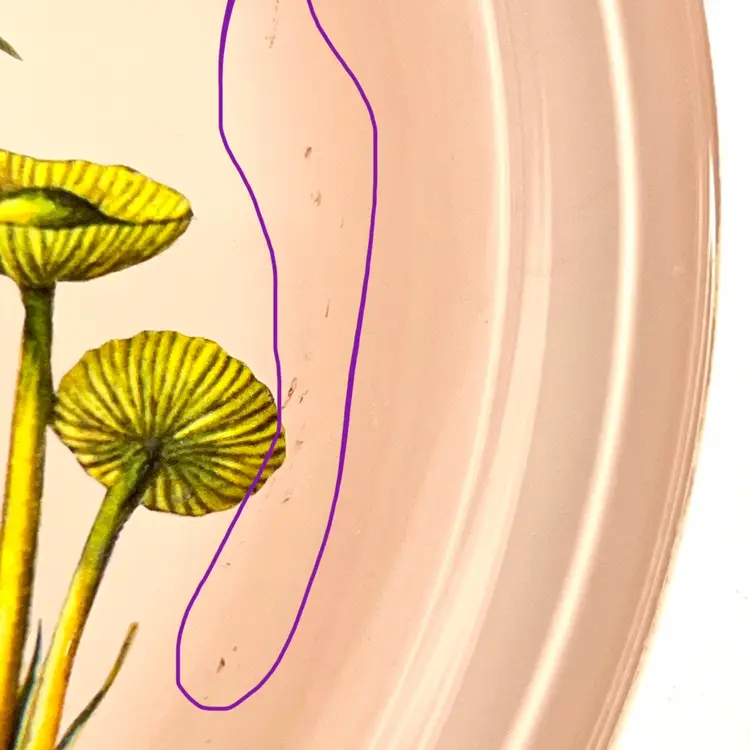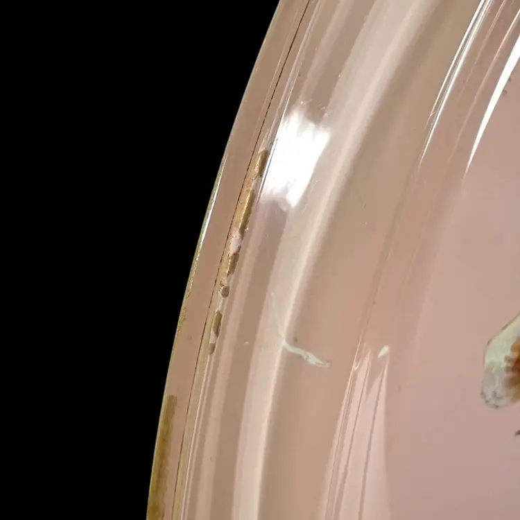 Nature Theme Mushrooms & Butterflies Looks Handmade with Stickers placed on reverse side 8-3/4โ x 3/4โ Glass Plate Pink Background Orange painted on reverse Weighs over 1 pound Condition: -Some areas have paint loss on reverse which shows on the front (see photos with purple circles areas) -Very minor edge wear, no cracks in glass. See last 2 photos of edges