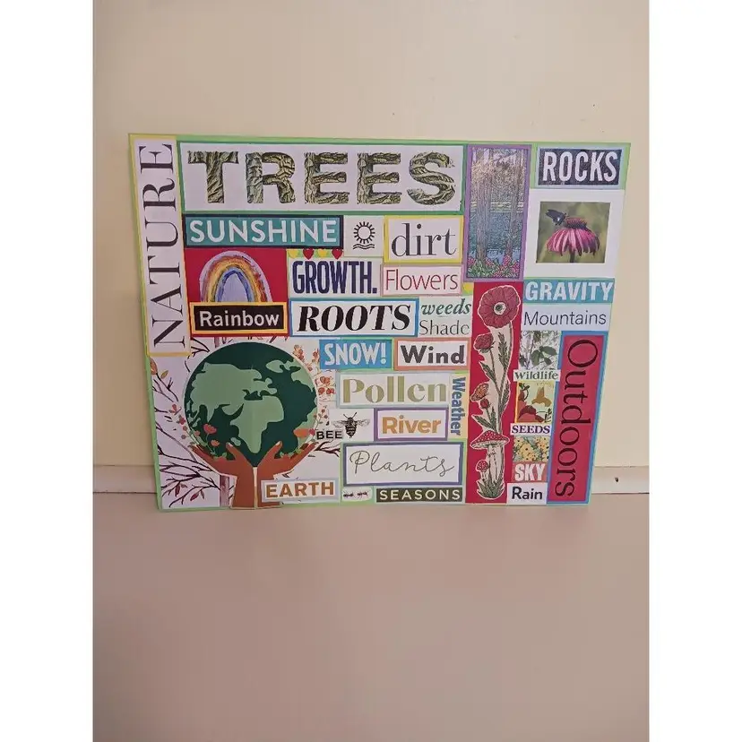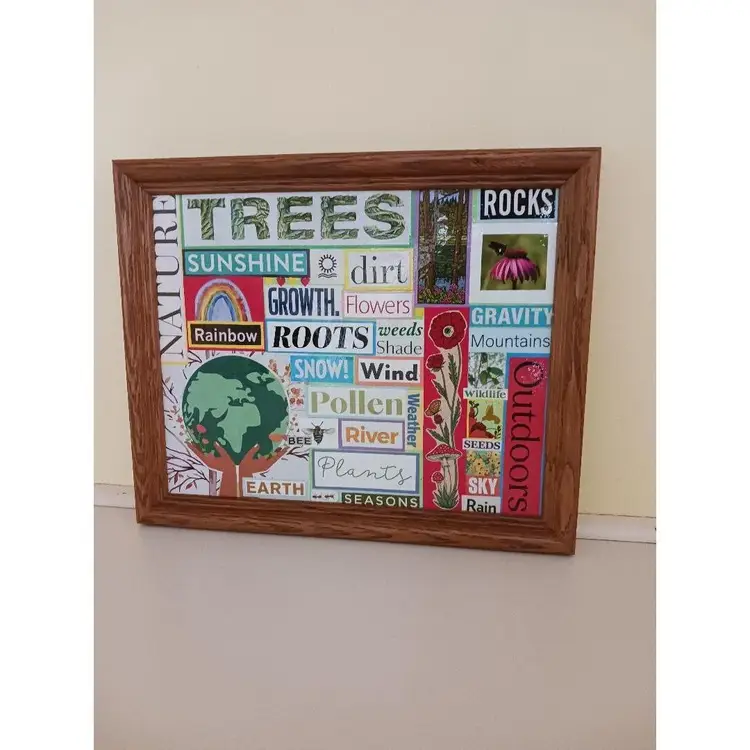 Made from words and pictures cut from salvaged magazines dating from the 1940s to the present and recycled frame. Frame measures 11 1/4" wide by 9 1/4" tall.