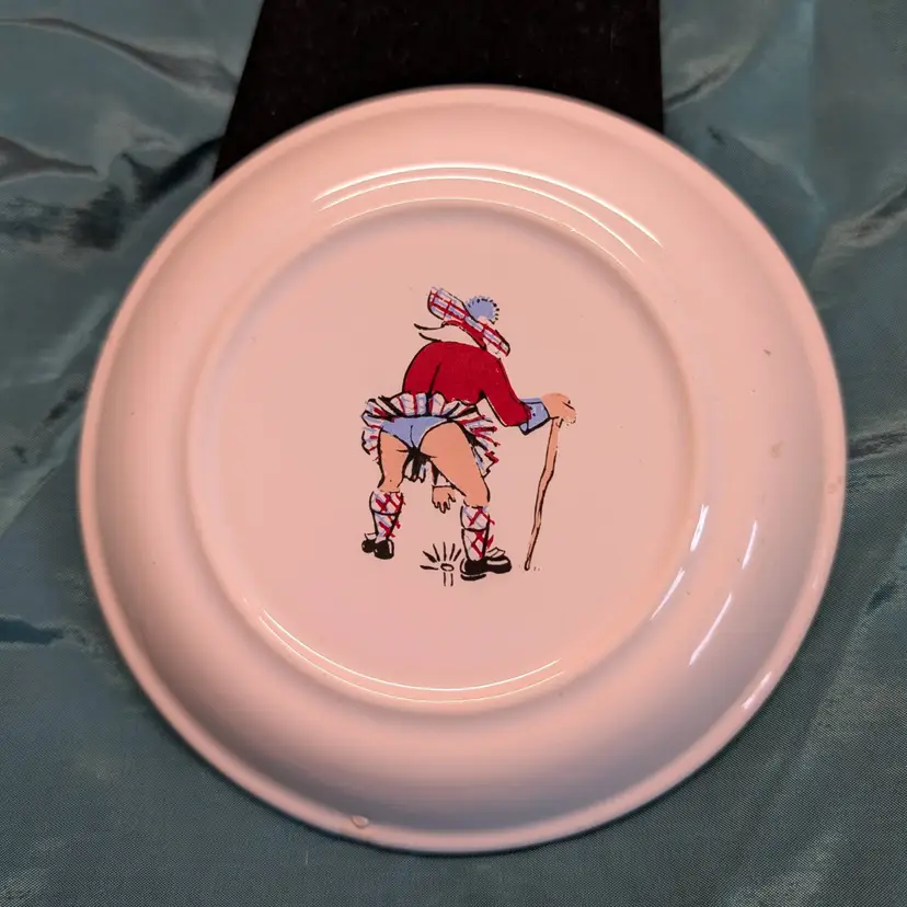 Measuring 5.5 inches diameter, this naughty Scot dares you to lift the plate and see if it's "trew" about a man's kilt and what is worn underneath. Please see pictures as they are part of the description.