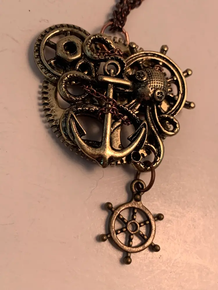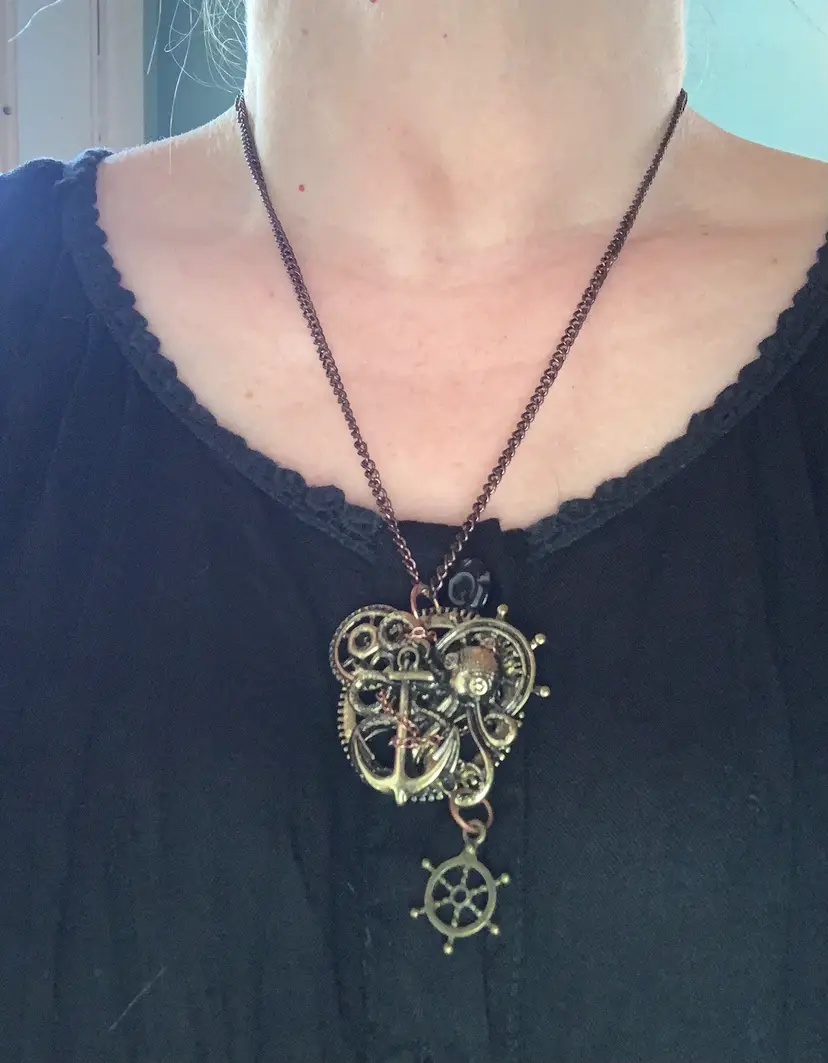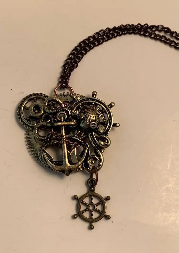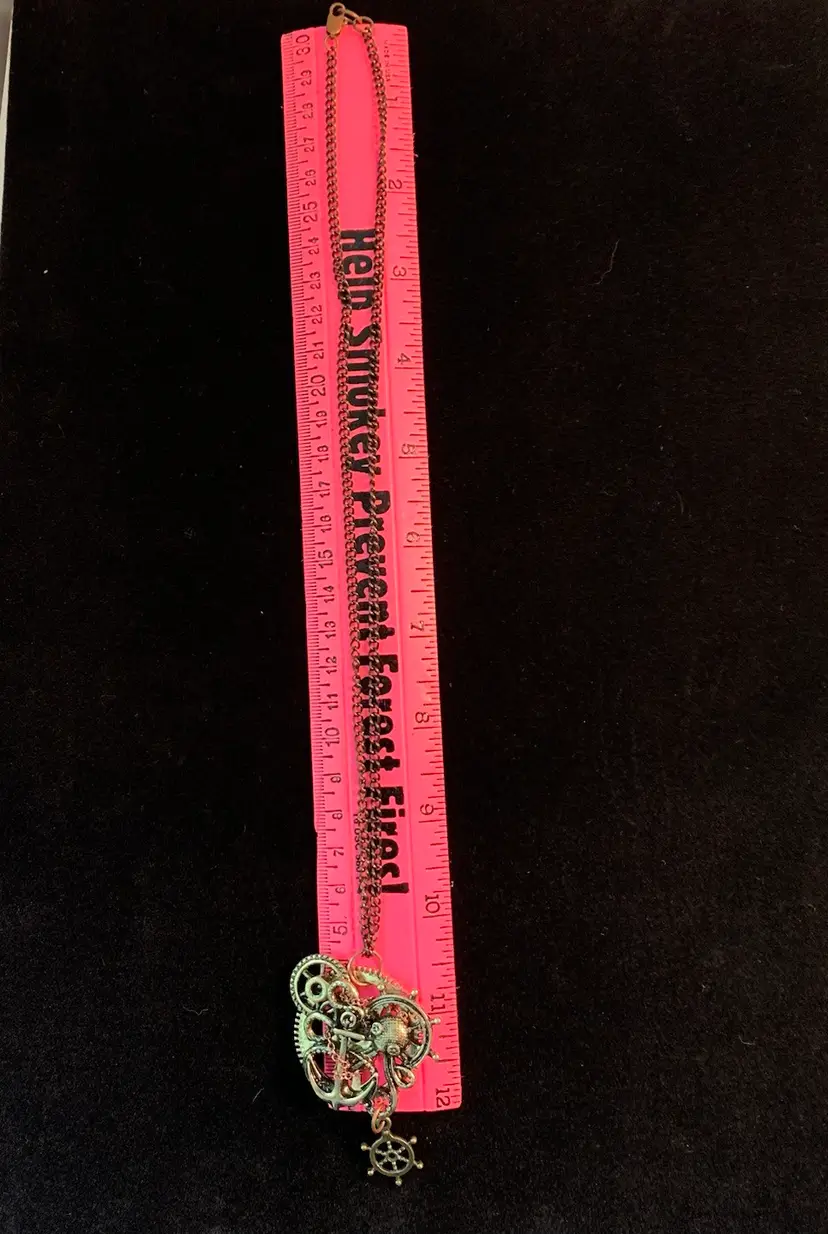 Steampunk antique finish gears and a nautical octopus charm wrapped together with a copper finish chain, reinforced with a little jewelry glue. On a 10 1/2” wearable length of copper finish chain. Total wearable length is about 12 1/2”.
