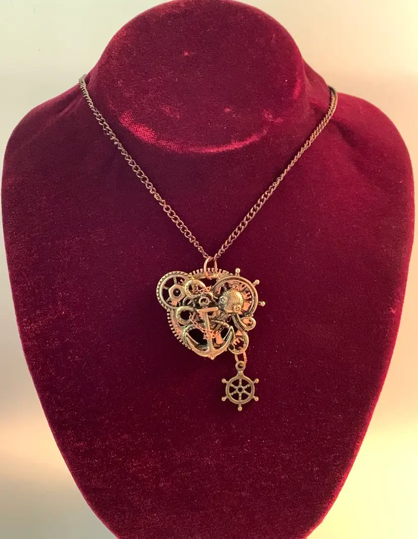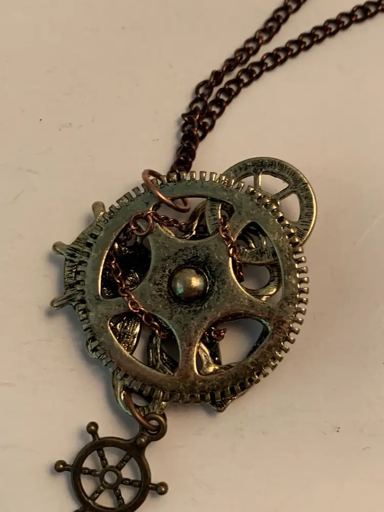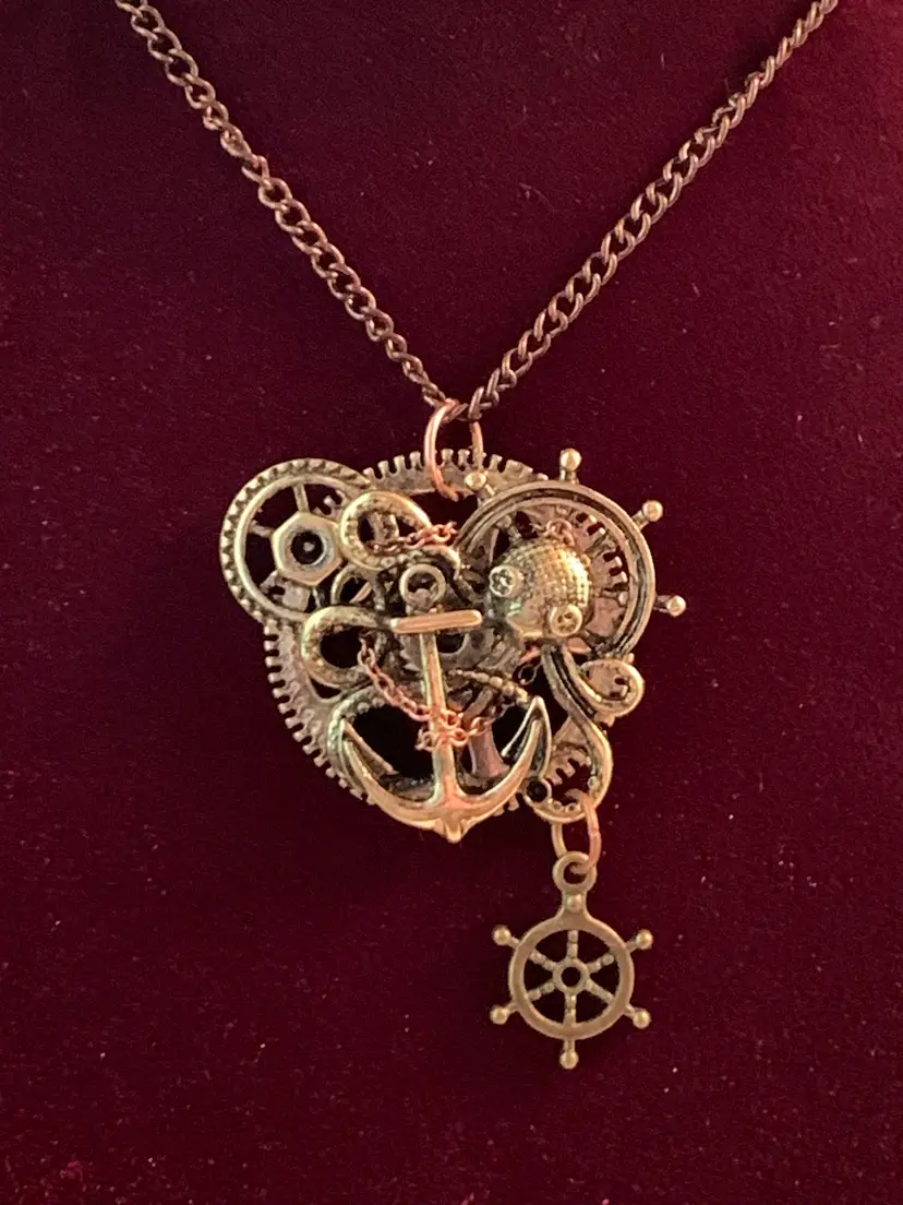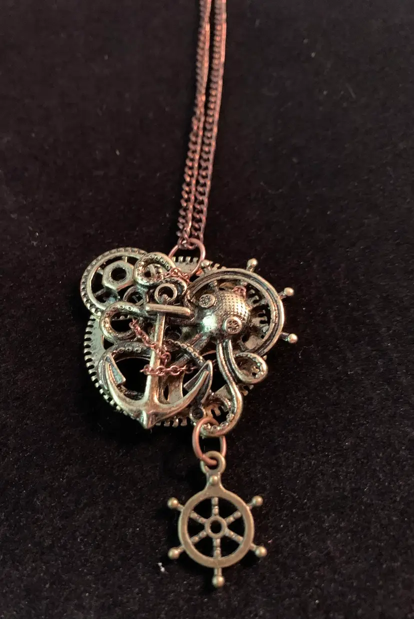 Steampunk antique finish gears and a nautical octopus charm wrapped together with a copper finish chain, reinforced with a little jewelry glue. On a 10 1/2” wearable length of copper finish chain. Total wearable length is about 12 1/2”.