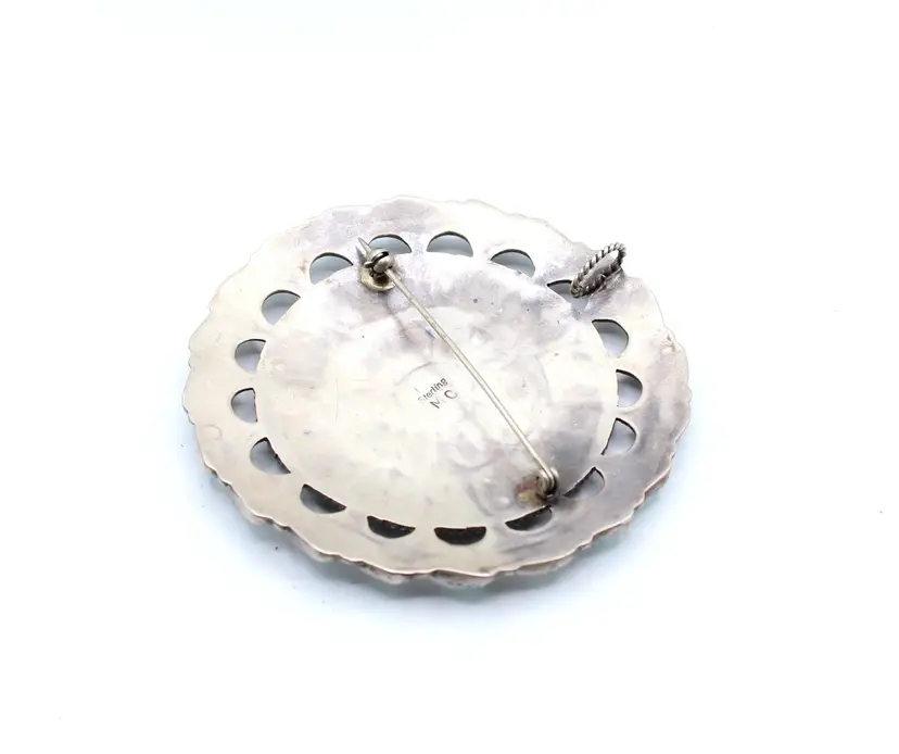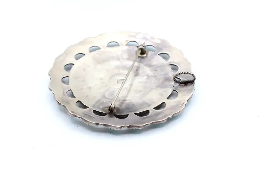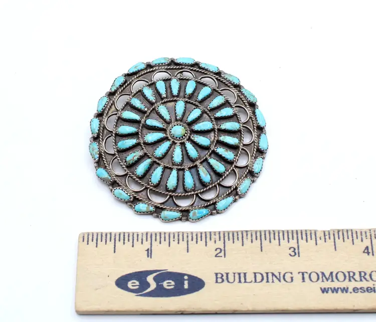 Beautiful signed unknown artist MC brooch. Fifty two turquoise stones set in saw tooth bezels, adorned with twisted wire. All set in a flower shape. Measures 2.75" Added wire for pendant.