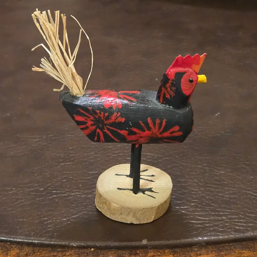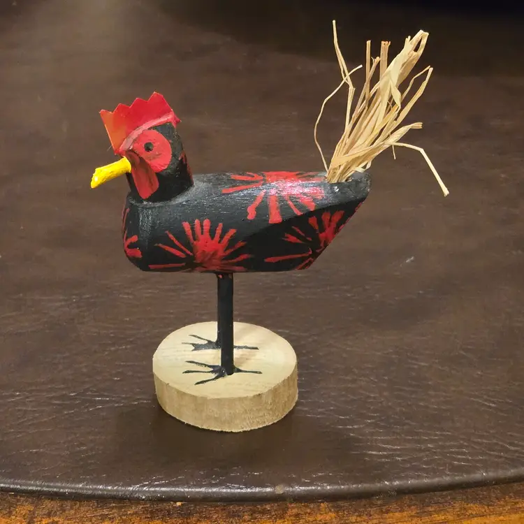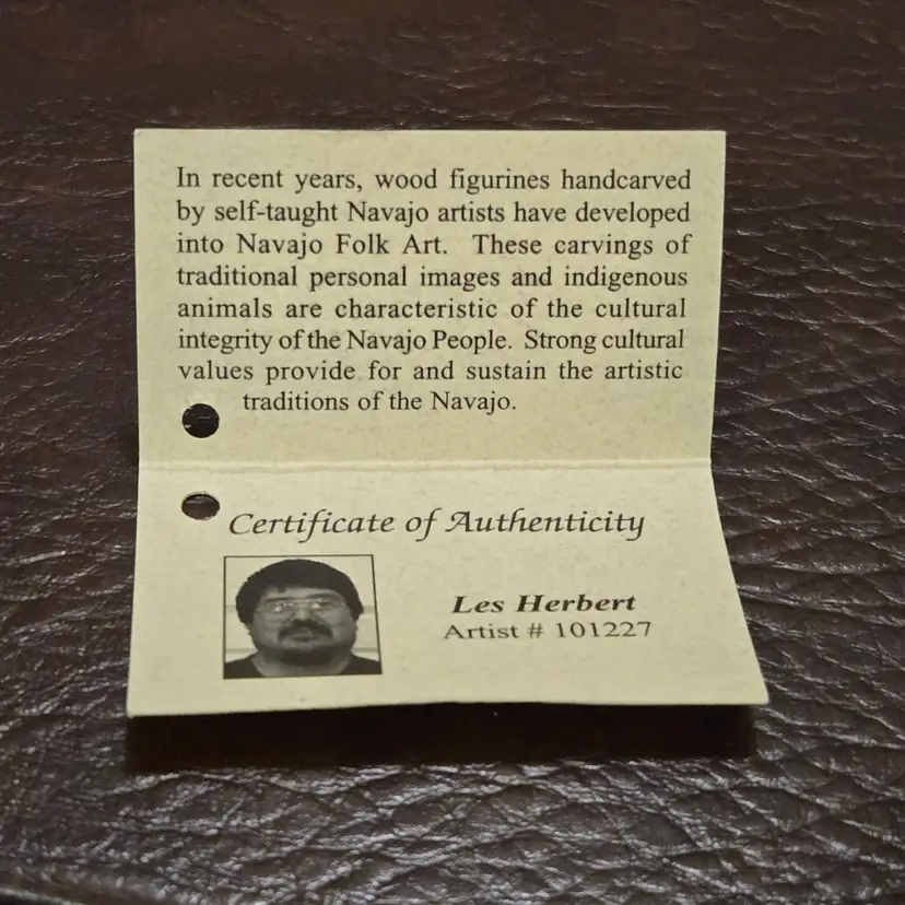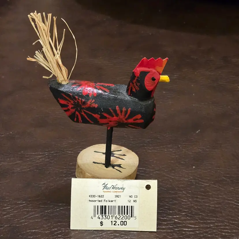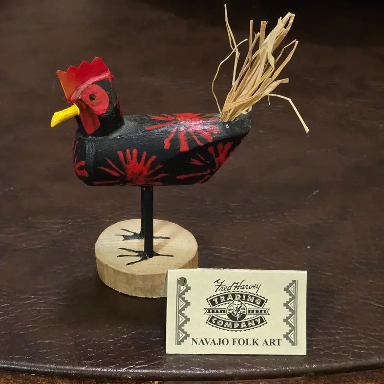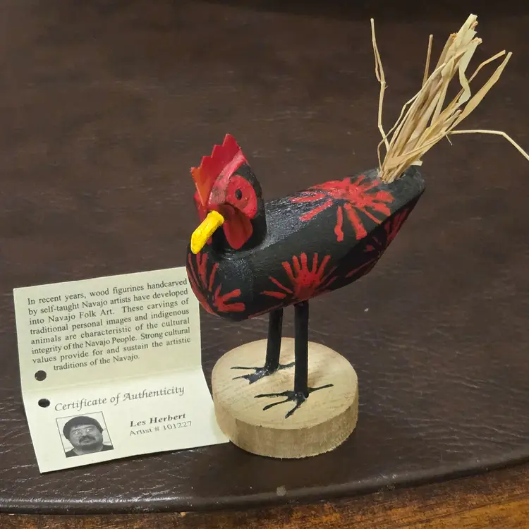 Navajo Folk Art Chicken by Les Herbert Native American 3¾” with Ephemera Unsigned. From Fred Harvey with small piece of paper as artist description. Used condition with small flakes of missing paint, straw tail has creases, folds, bends, etc. along with artist flaws. Please view all the photos and read the entire item description and please ask any questions prior to purchase when possible.