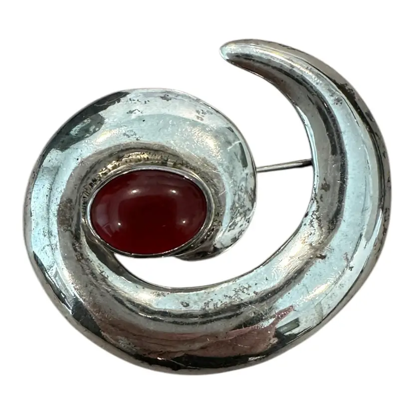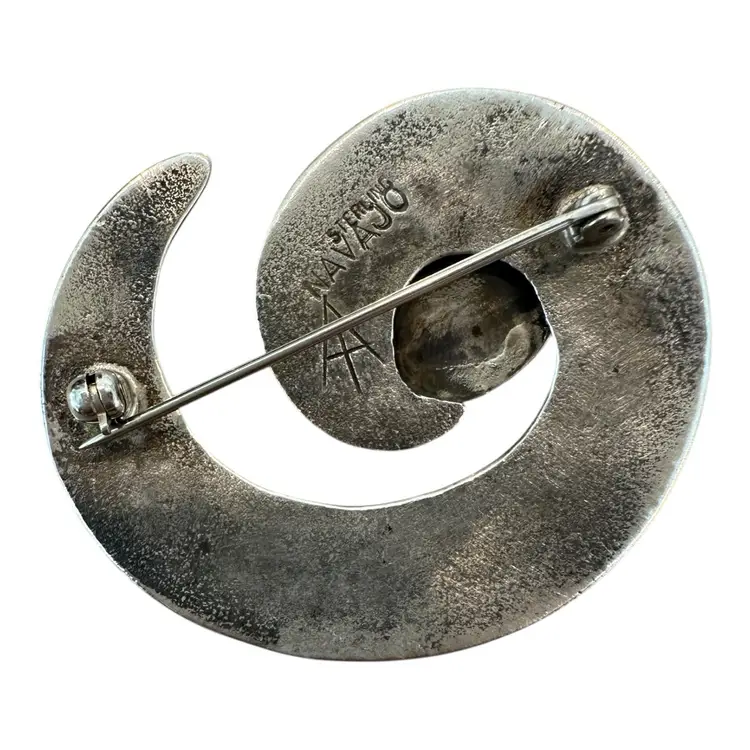 Swirl pan measures one and three-quarter inches and consist of an oval shaped, bezeled Amber Stone. The weight is 21.80 g.