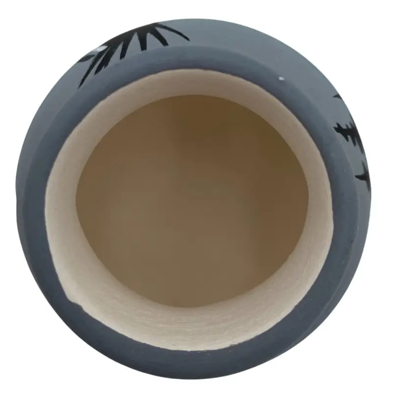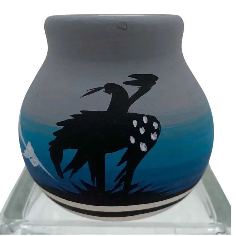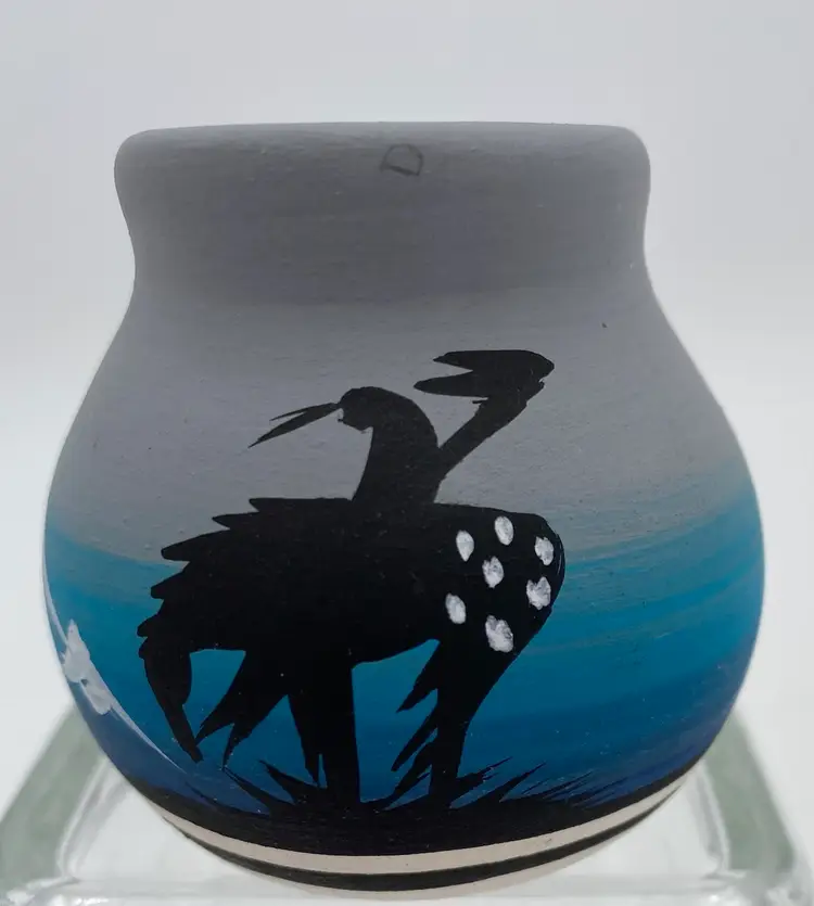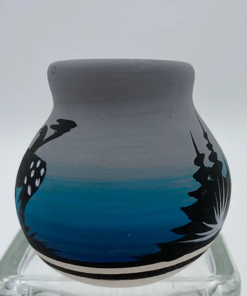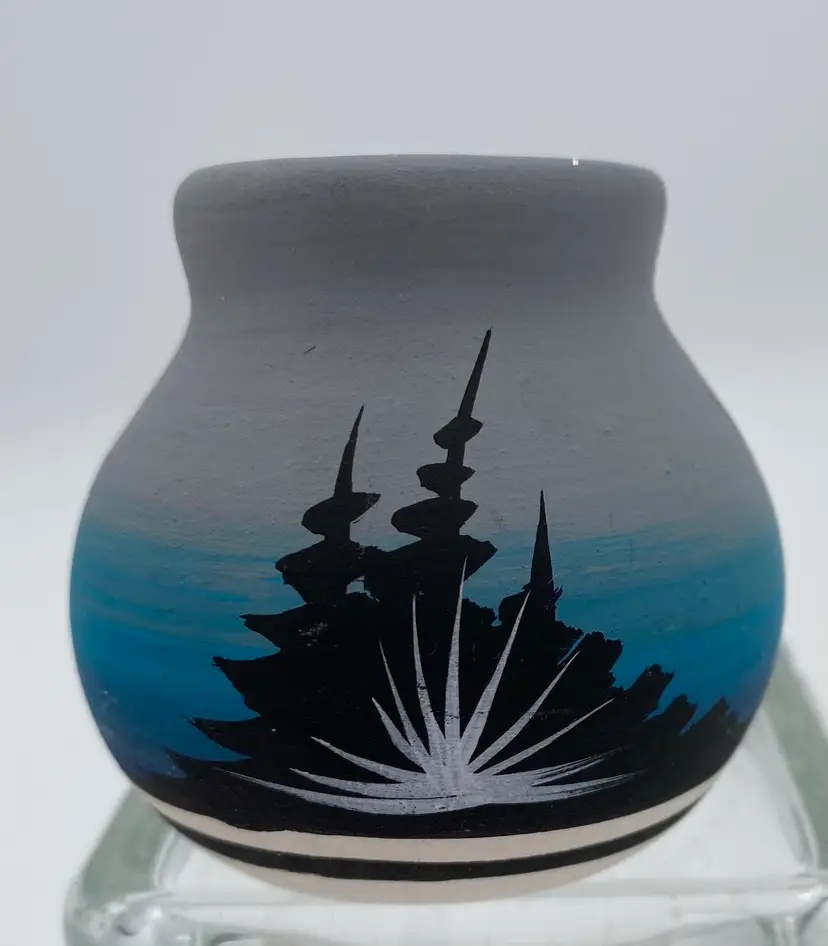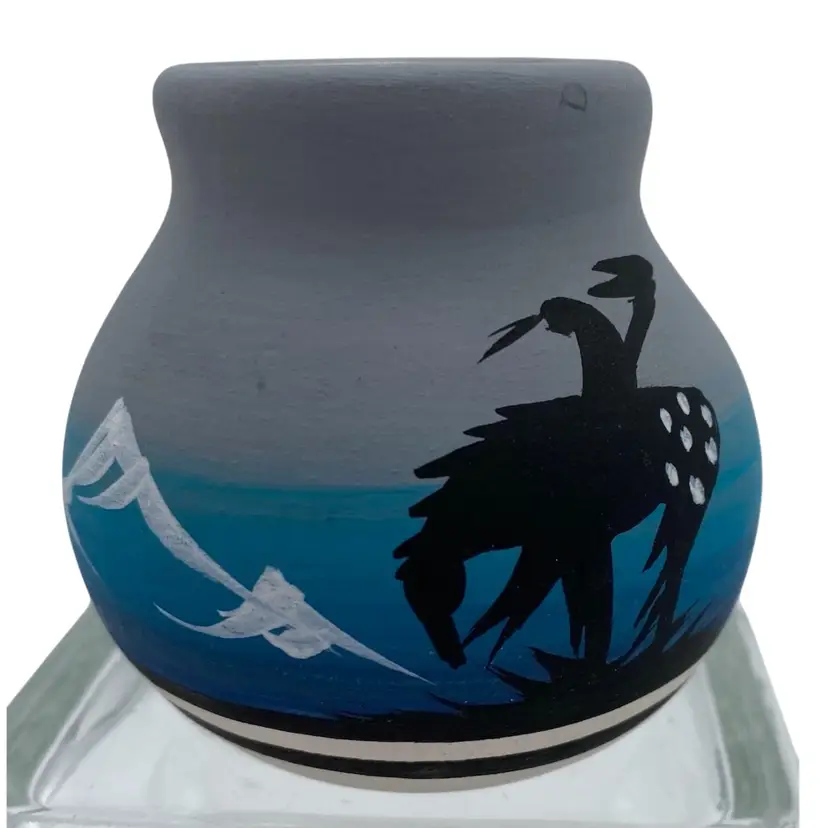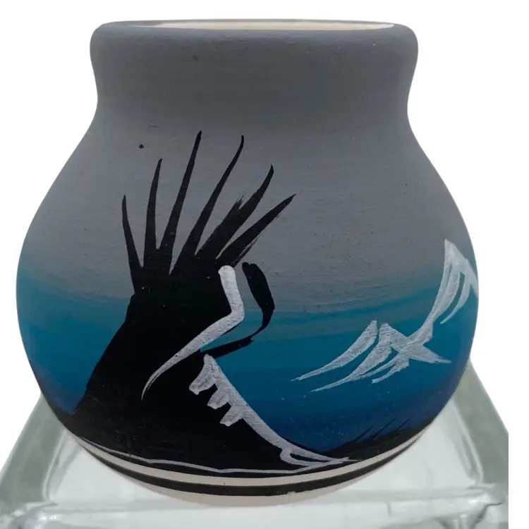 This exquisite piece of Native American pottery from the Navajo Nation features a warrior on horse and is signed by artist Black Horse. Measuring at 2.5 inches in height and width, this small yet intricate piece is a true reflection of Navajo culture and craftsmanship. The pottery is handmade and features a scene where the warrior is in front of a mountain range, returning to his tepee and fire. The piece weighs 3.6 ounces and is a beautiful representation of the Navajo tribe's rich history and tradition.