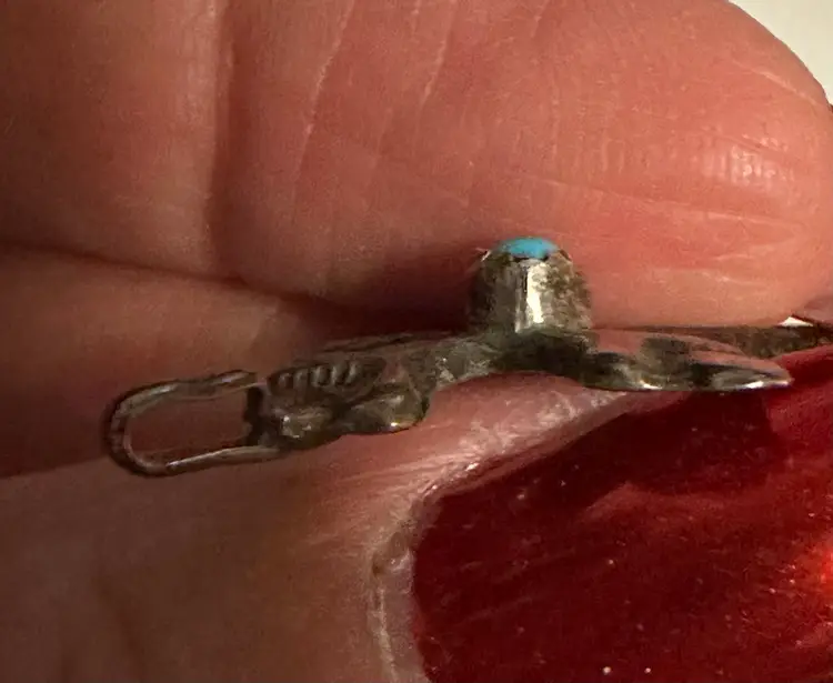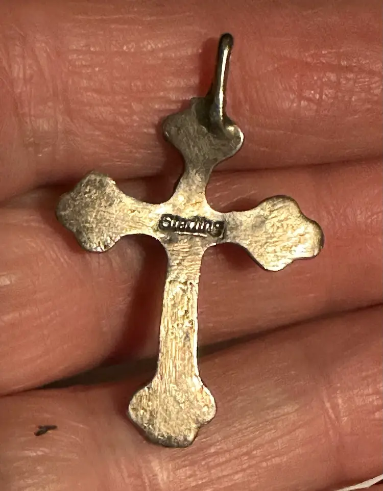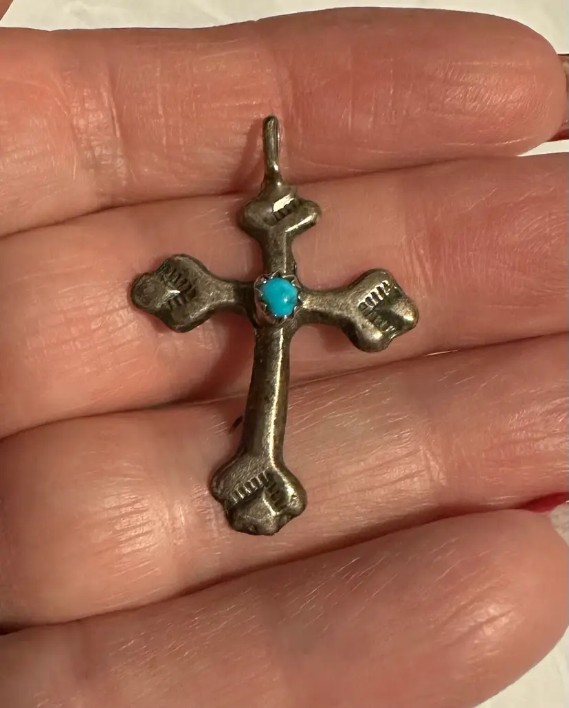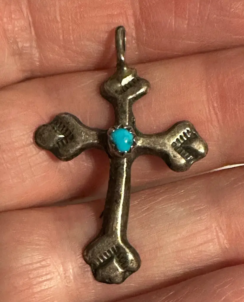 Very nice handcrafted Navajo cross pendant. It is sterling and turquoise. 1” x 1.5”. Very good condition.