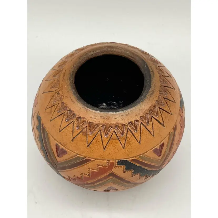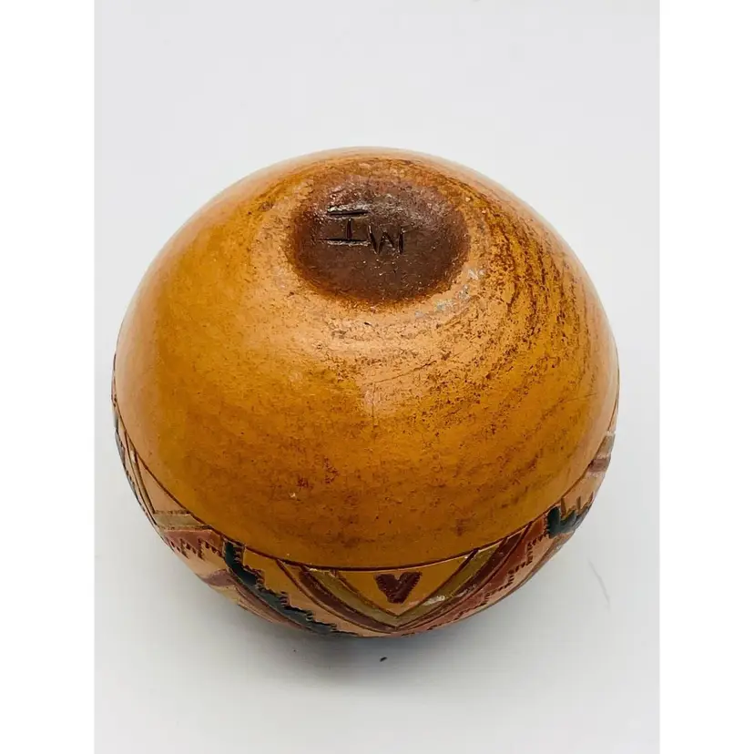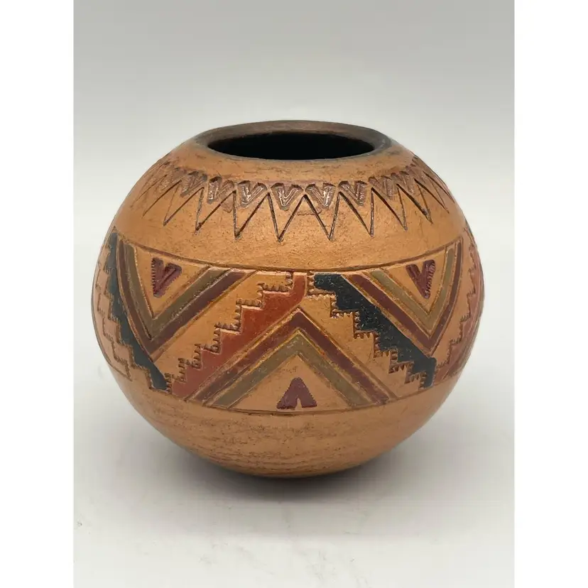 Contemporary Navajo Potter Irene White Native American Handcrafted Pottery. Seed Pot Medicine Bowl clay earthenware panted with a southwestern design. Signed IW. Measures 3.5” diameter, 3” tall.