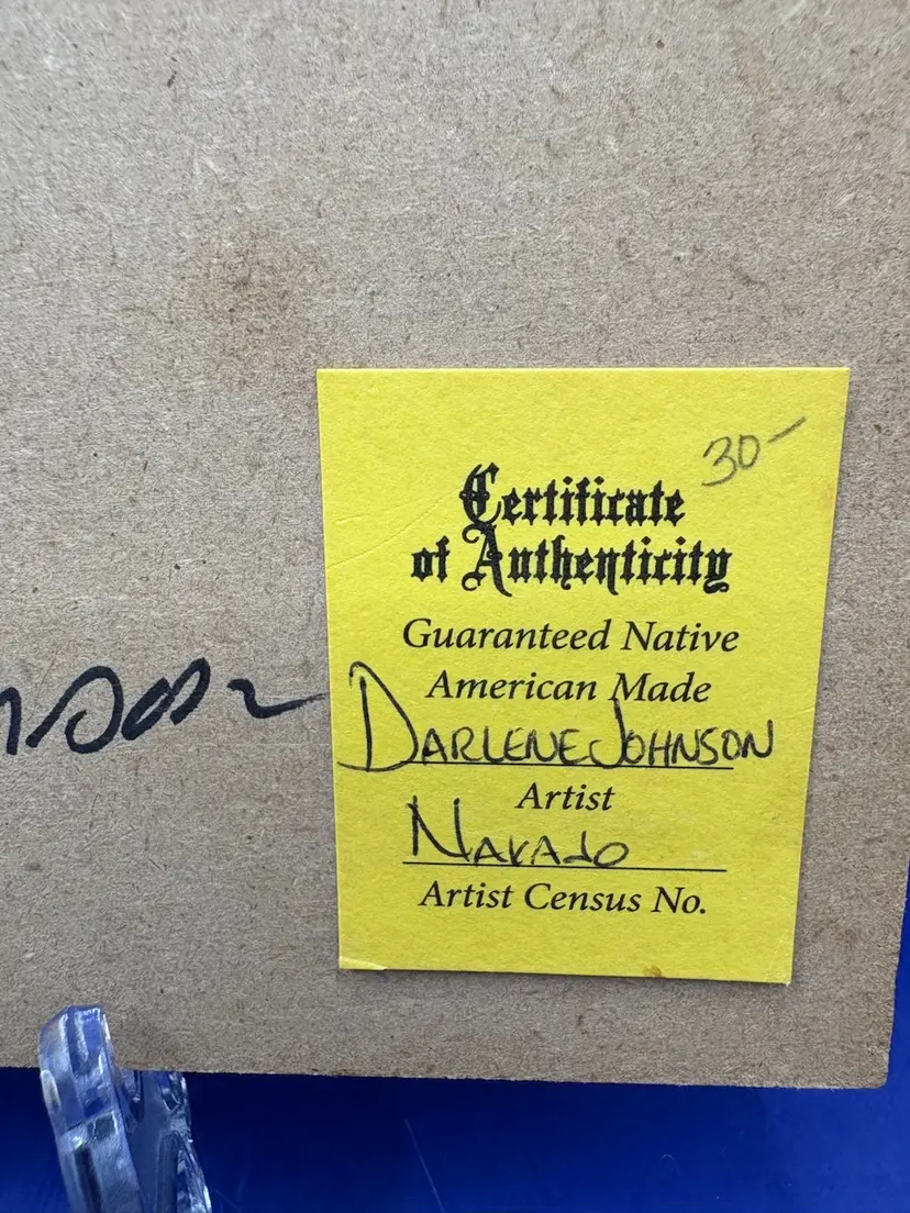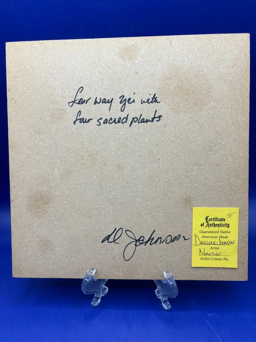 Navajo Sand Painting Signed by Artist Darlene Johnson Certificate of Authenticity Measures 8 inches by 8 inches Design is 4 way yei (Holy People) with 4 sacred plants There is discoloration on front bottom and on back