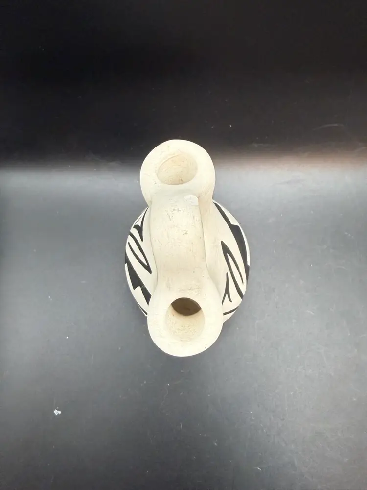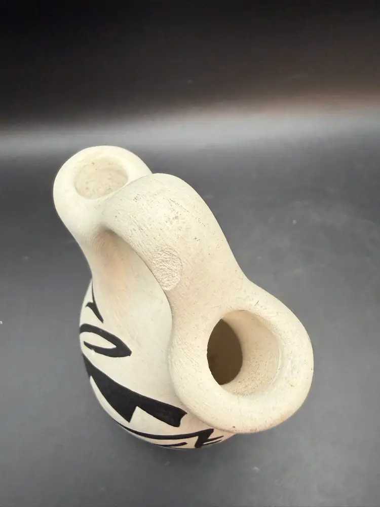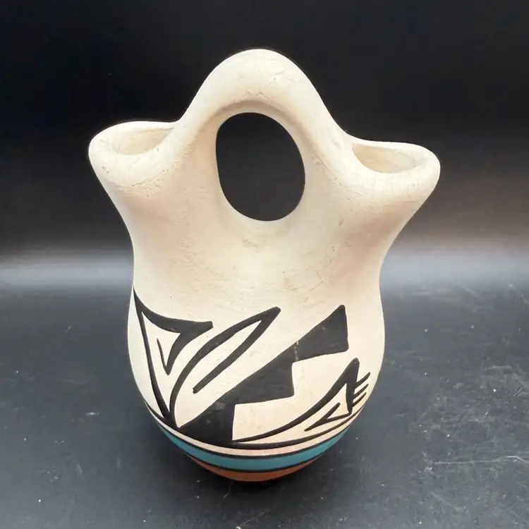 Wedding vases are a significant tradition within many Native American cultures, particularly among Pueblo peoples and Navajo communities. These vases are traditionally given to a couple at their wedding, symbolizing their union and the joining of two families. The two spouts represent the couple, and the connecting handle signifies their bond, with the central opening representing their home.