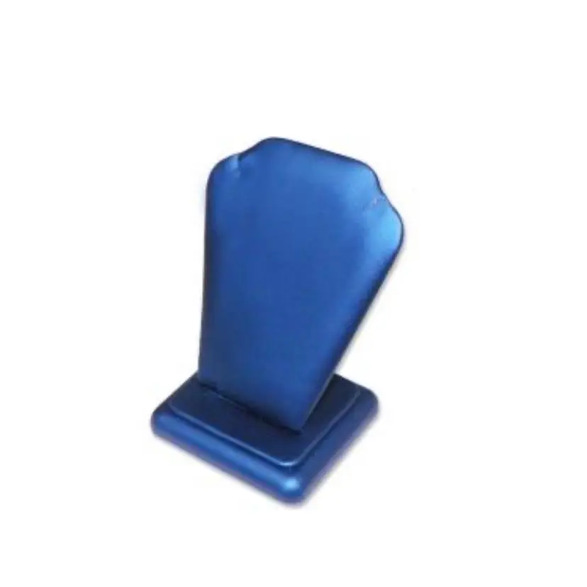 Size: L:3.25 ∗ W:3.00 ∗ H:4.00 inches Category: Navy Blue Leatherette Jewelry Displays Material: Leatherette Description: Blue leatherette pendant display stand that has a back pocket to hold your necklace.