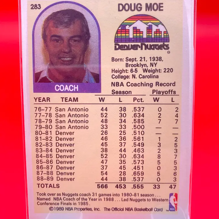 You are purchasing one Denver Nuggets Doug Moe Trading Card #283 from the 1989 NBA Hoops line. This card is in near mint condition, see images for a closer look.