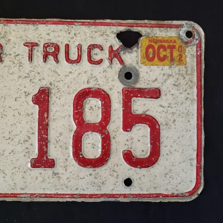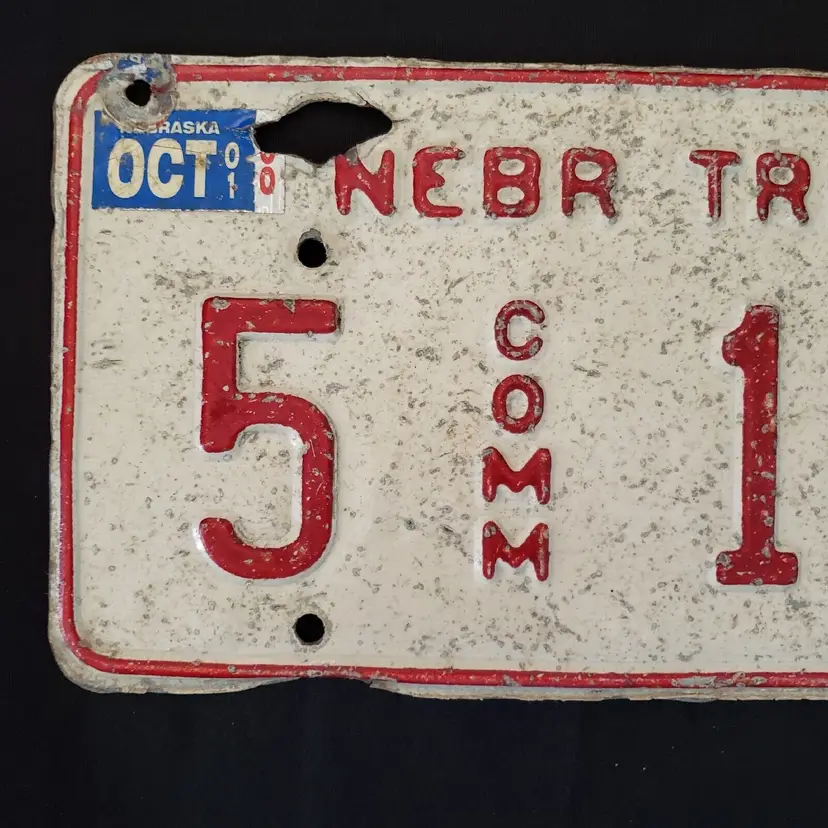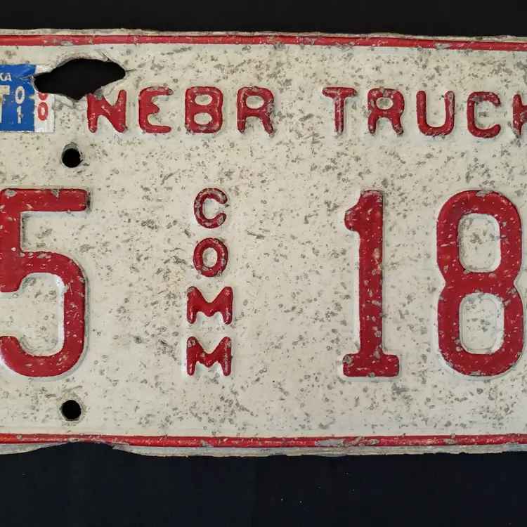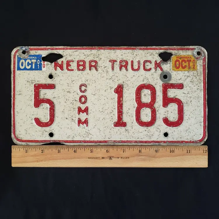 State: Nebraska Nebraska Truck License Plate Commercial 5 COMM 185 READ DESCRIPTION single plate. Used condition with holes, rust, bends, dirt, torn stickers, tarnish, etc. Please view all the photos and read the entire item description and please ask questions prior to purchase when possible.