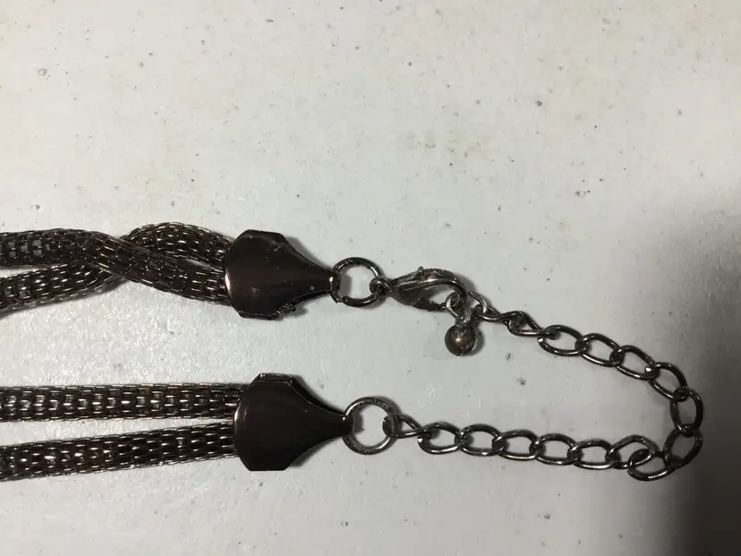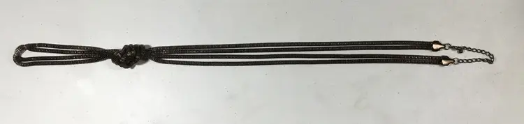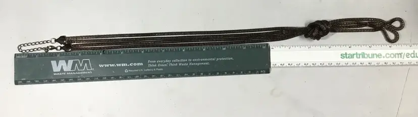 27 inch length from extension chain to knot, then 5 more inches below that. Dark copper colored metal mesh, double stranded. Large knot with extra mesh chain hanging below. Lobster clasp.
