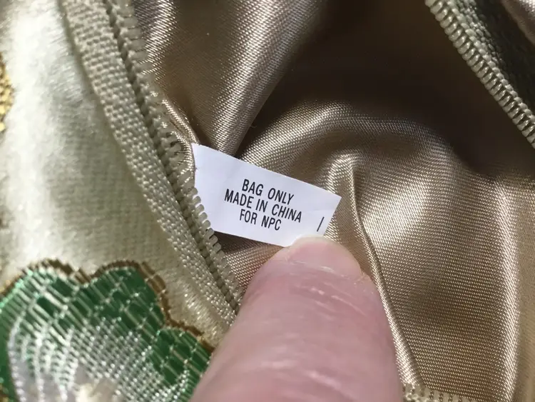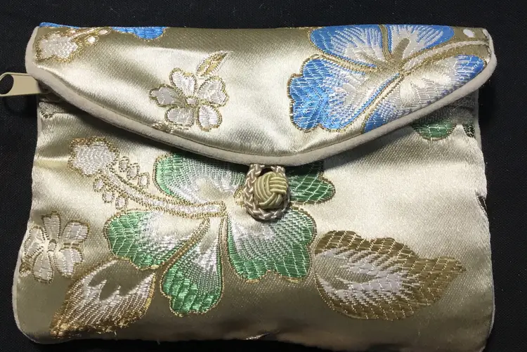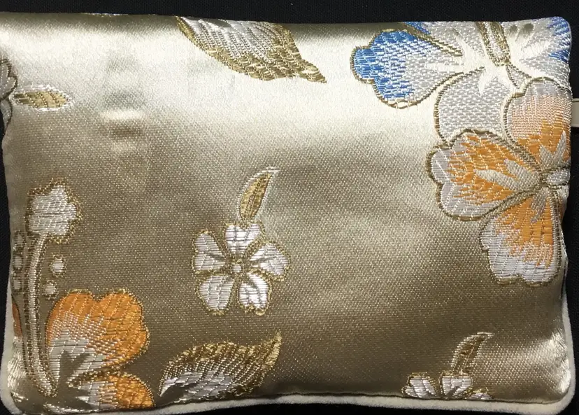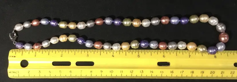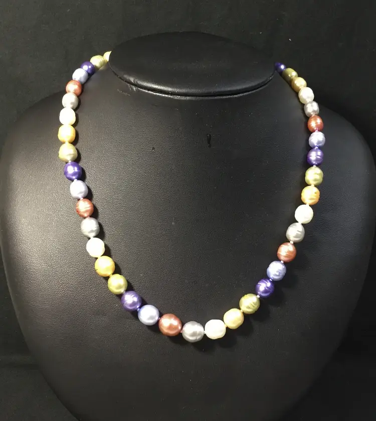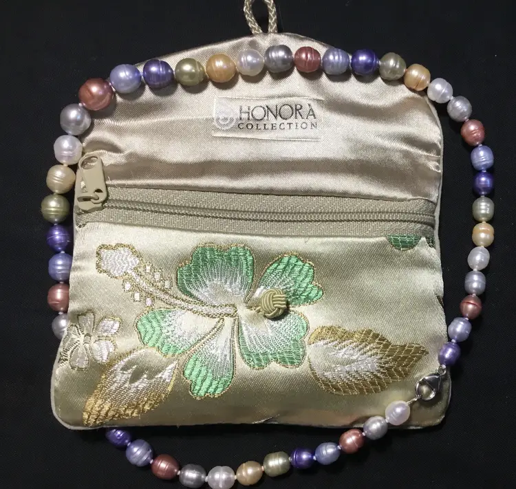 18 inches long, hand-knotted string between each pearl. Baroque, freshwater, cultured pearls, dyed colors, yellow, peach, white, gray, pale blue, purple, pale red. Comes with satin, brocade, zippered pouch, beige with blue, white, green, orange, gold flowers. Clasp is marked 925.