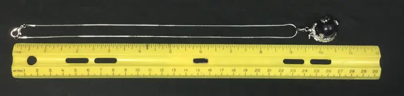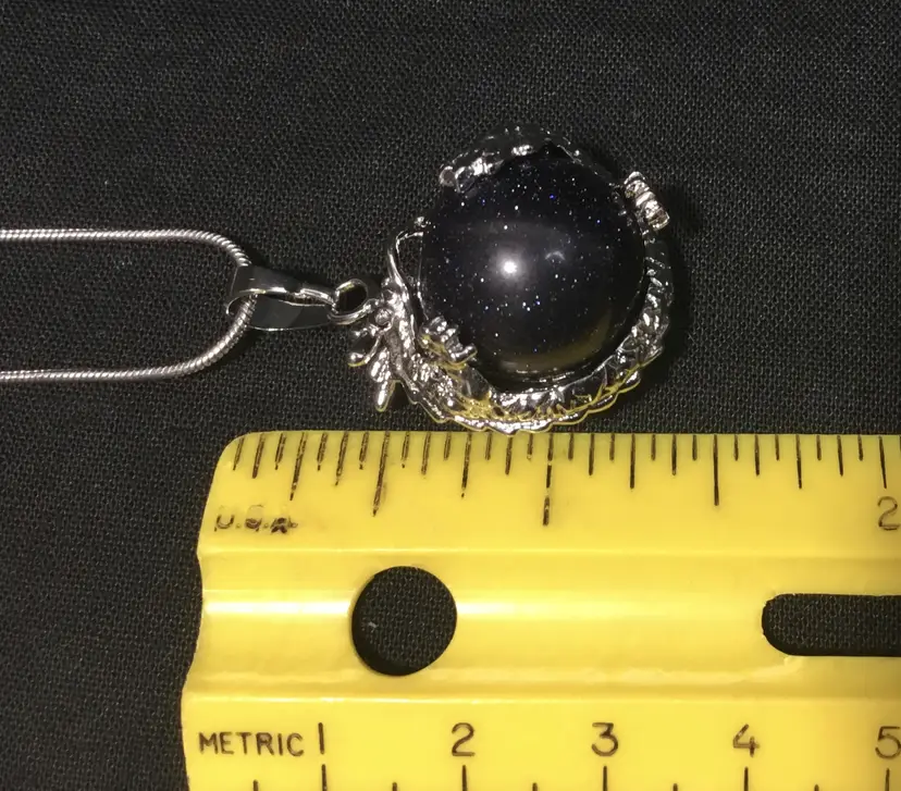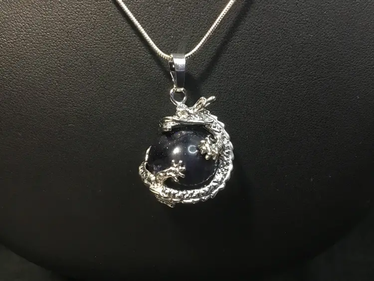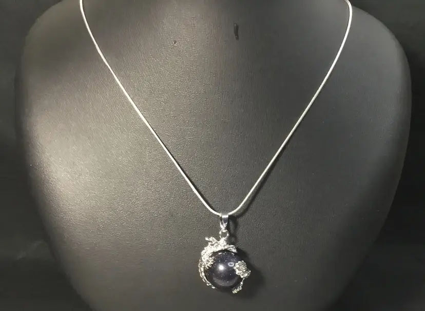 18 inch long snake chain, silver tone, with 1.5 inch long pendant. Very dark blue glass ball with sparkles embedded on half the ball. Silver tone dragon wrapped around the ball.