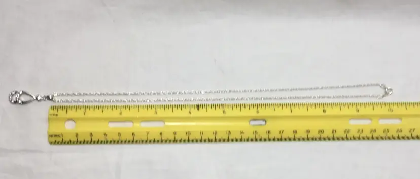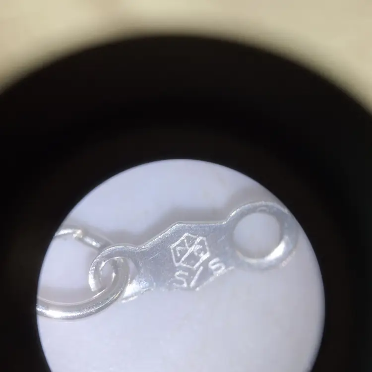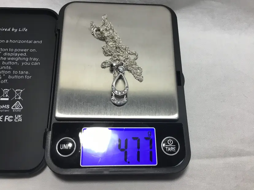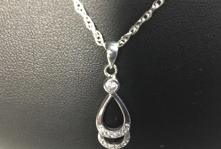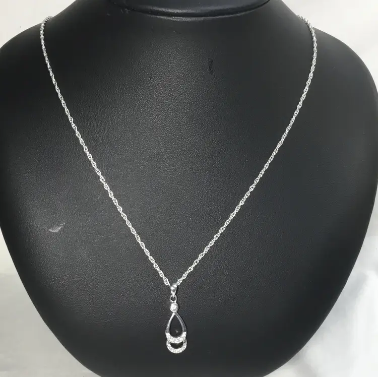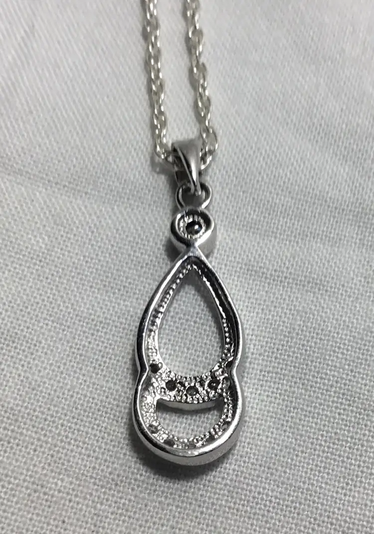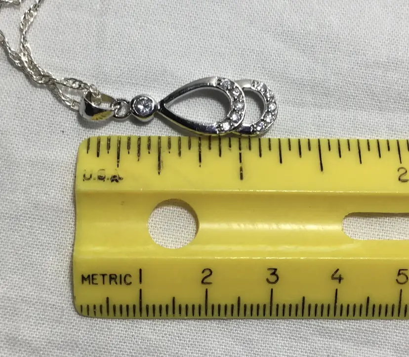20 inch long sterling silver rope chain is marked N/C and S/S on the clasping loop. Pendant is 1.25 inches long, double looped tear drop shape, marked NF 925 INSIDE the bale. Chain and pendant have been tested. At the top of the pendant is one larger crystal stone and there are 5 tiny crystals on each loop of tear drop. Spring ring clasp. See all photos. Total weight 4.77 grams.