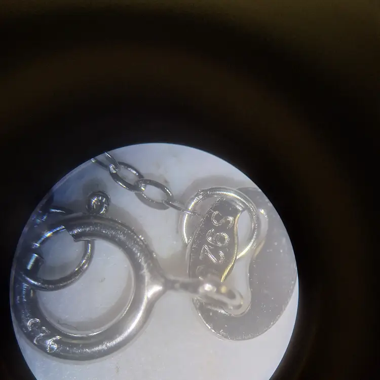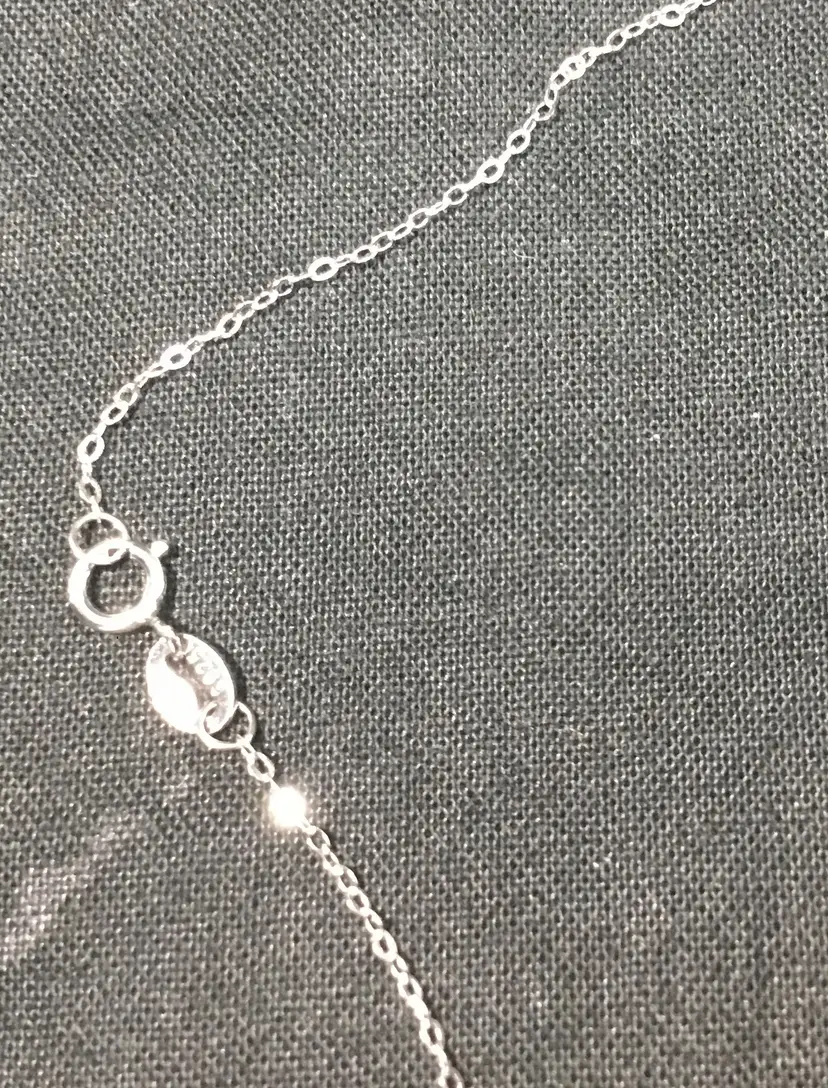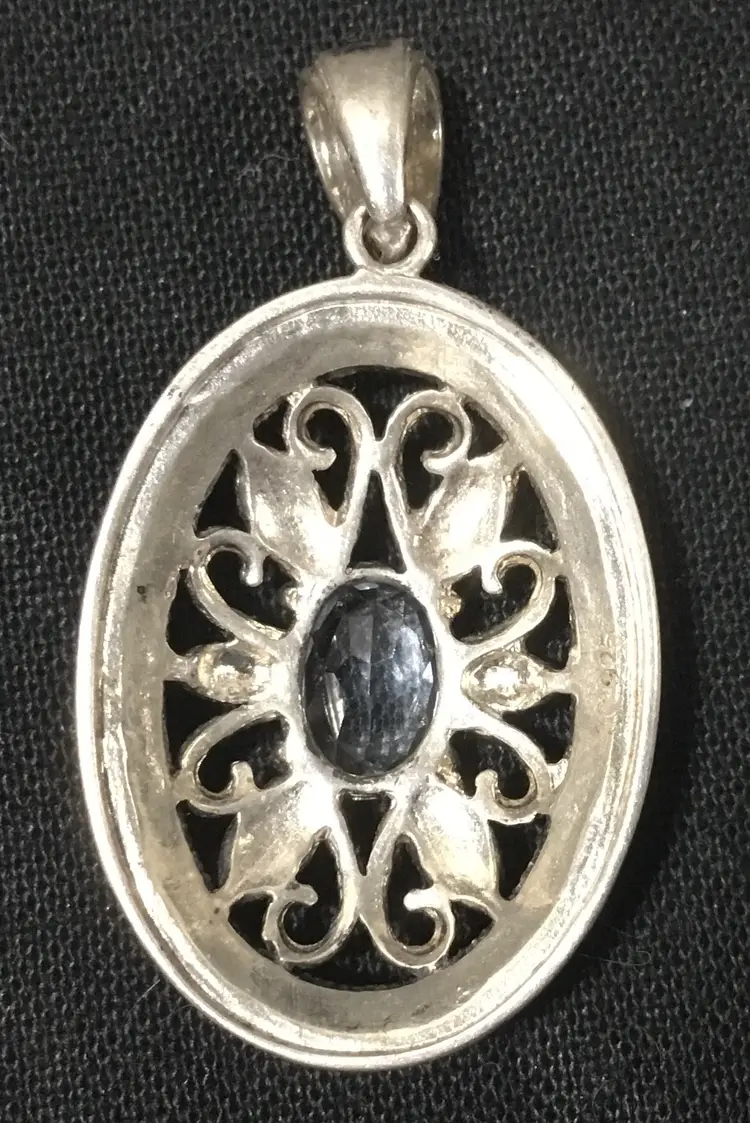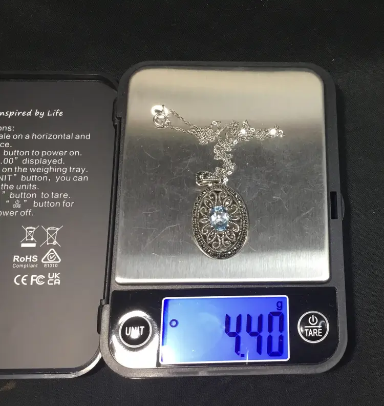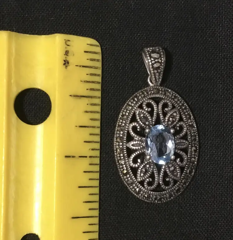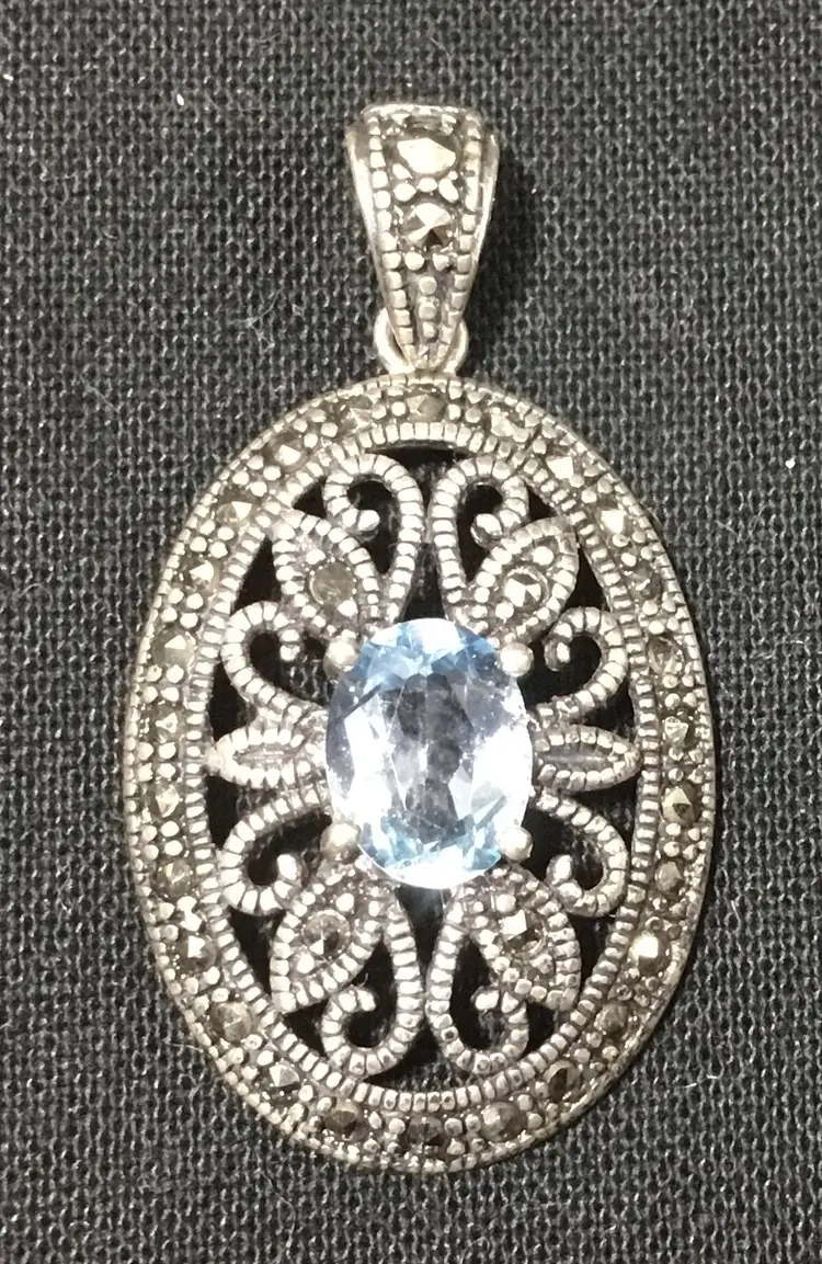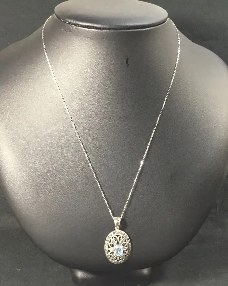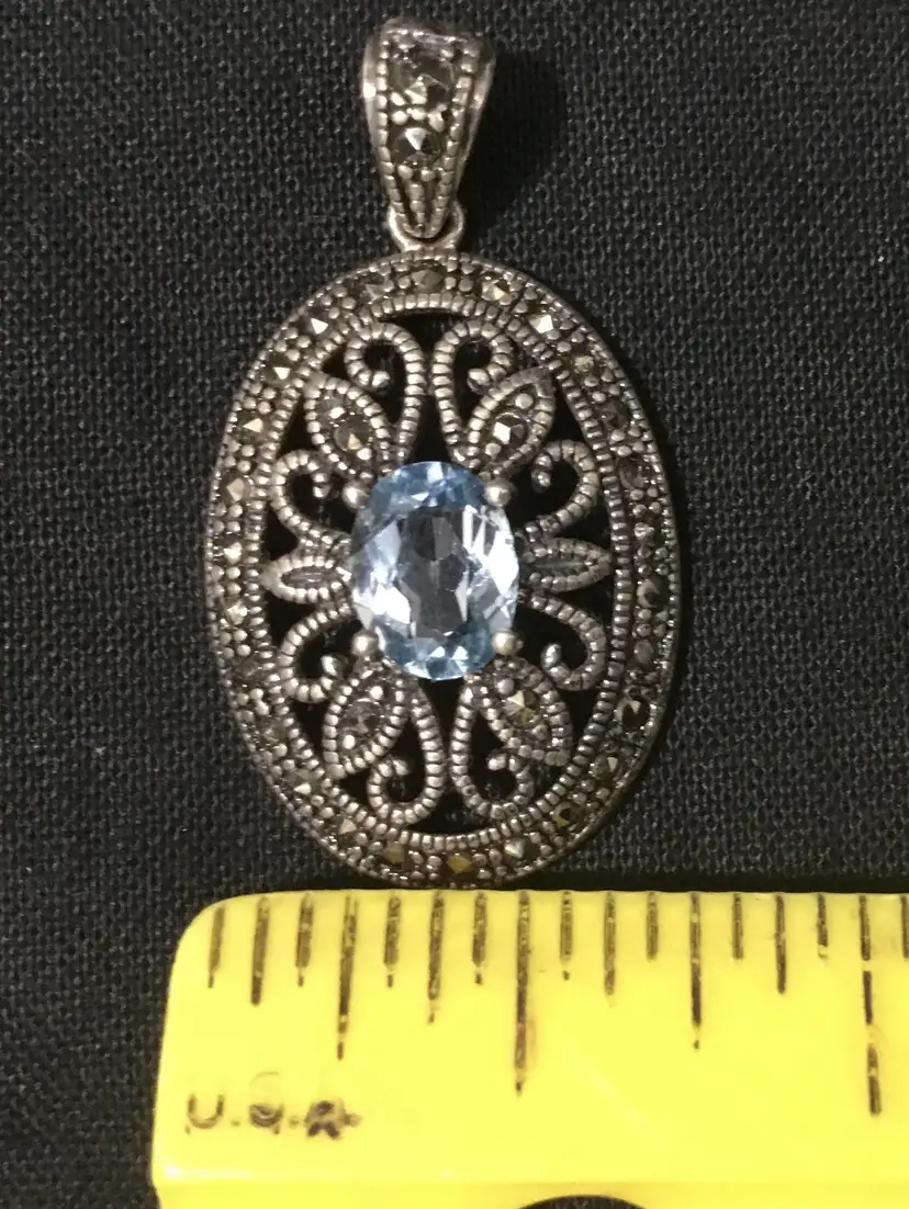 18 inch long NEW sterling rolo chain, with 1.5" by 3/4" sterling oval pendant. Pendant has openwork sterling setting, with light blue, approx. 2 carat, oval sapphire in the center. Two faceted 1.5mm marcasites are placed on the bail and 26 -1mm marcasites around edges of oval. Necklace weighs 4.40 grams. Very good condition except for tiny chip on right side of sapphire, so small can only be seen with microscope.