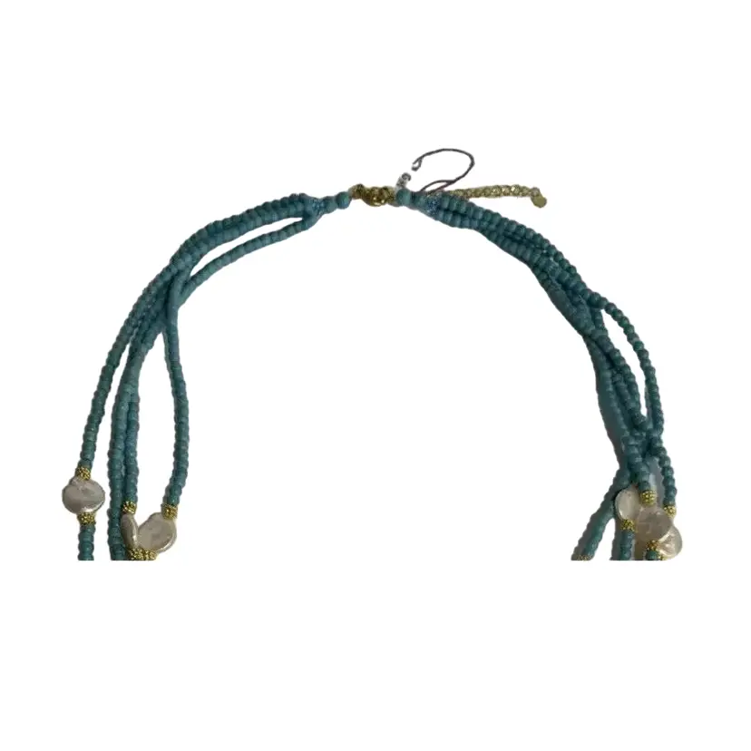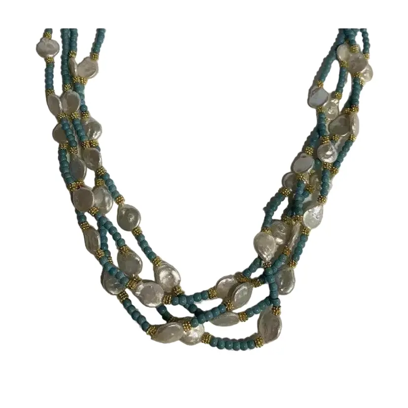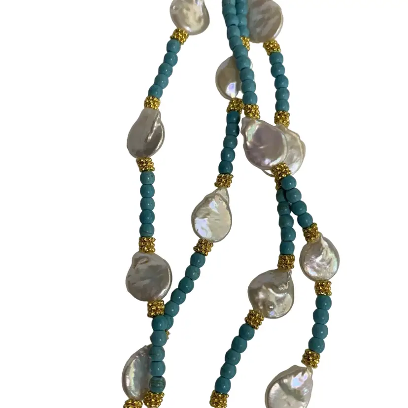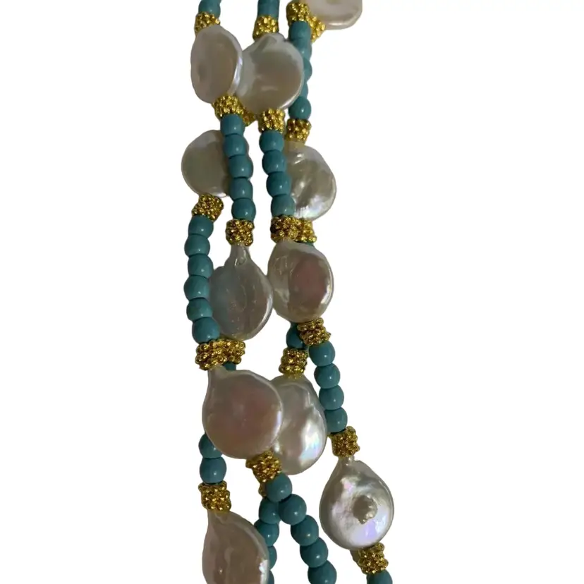 π Why You'll Love It This stunning multi-strand necklace is ideal for boho-chic outfits, beachy layers, or unique gifts. The blend of turquoise, pearl, and brass offers timeless appeal and handcrafted charm.