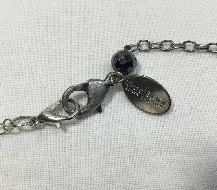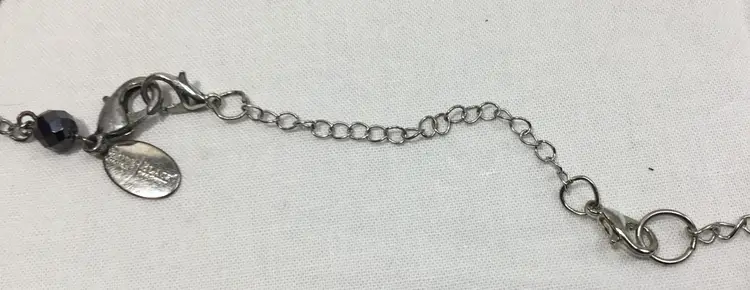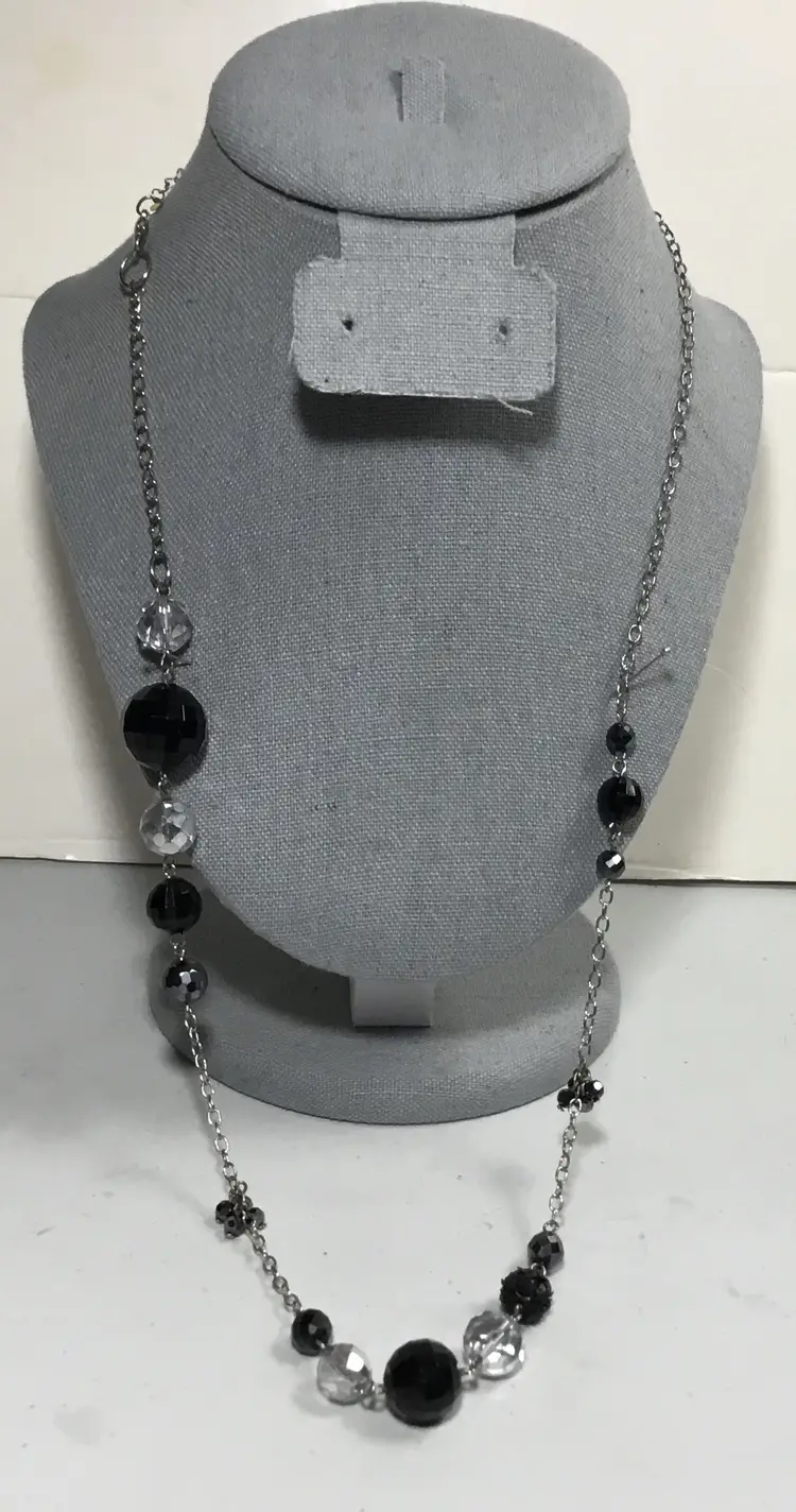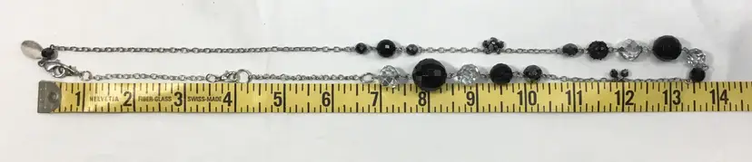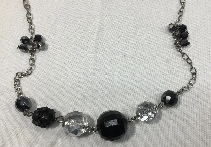 Asymmetrical beaded chain, 27 inches long, includes a 3.5 inch extra extender which can be removed. (see photos) Silver tone rolo chain with various beads along the chain. Beads are faceted, one bead has prong set, black rhinestones all over. Some beads are acrylic, many beads are crystal, some have AB coating, making them appear silver in color. Lobster claw clasp. Some wear on clasp (see photos.)