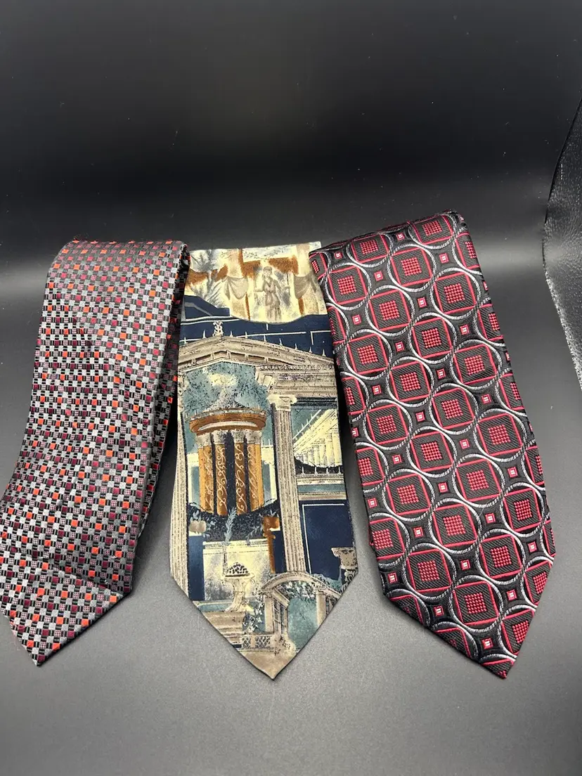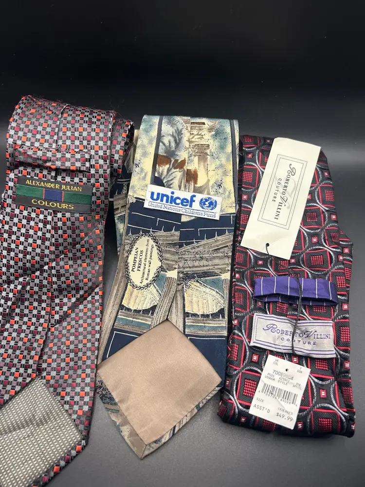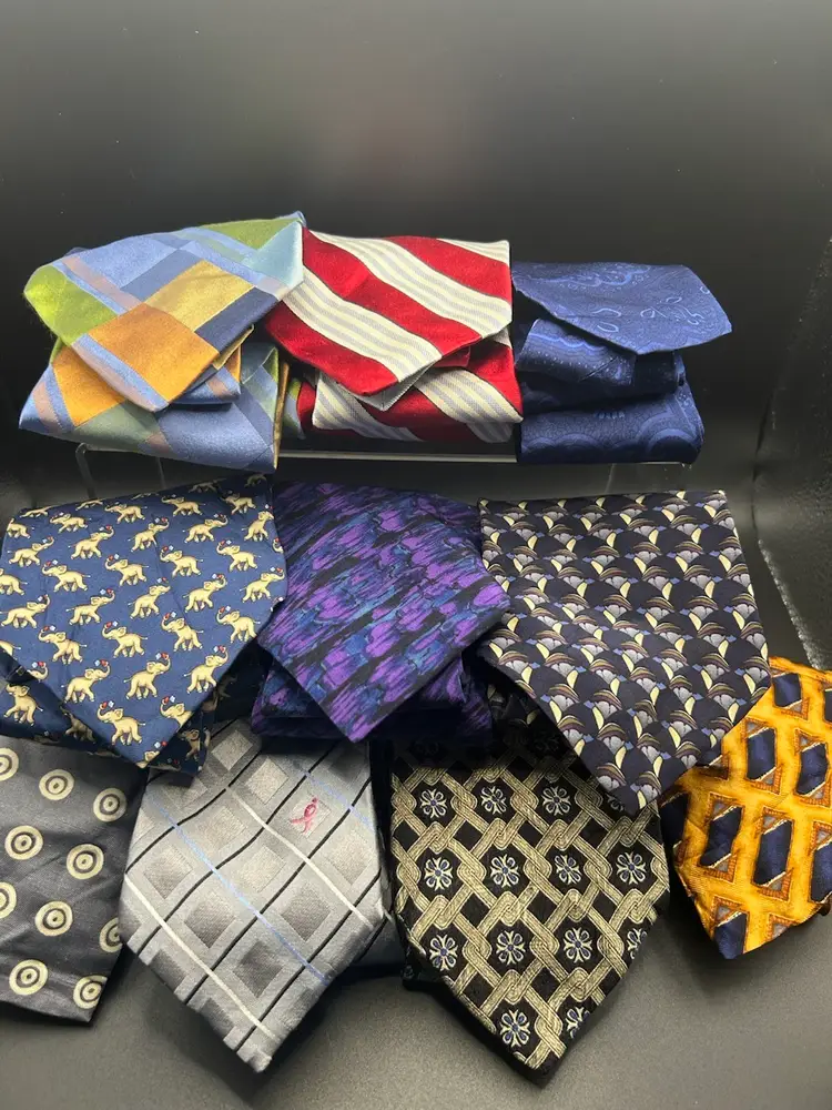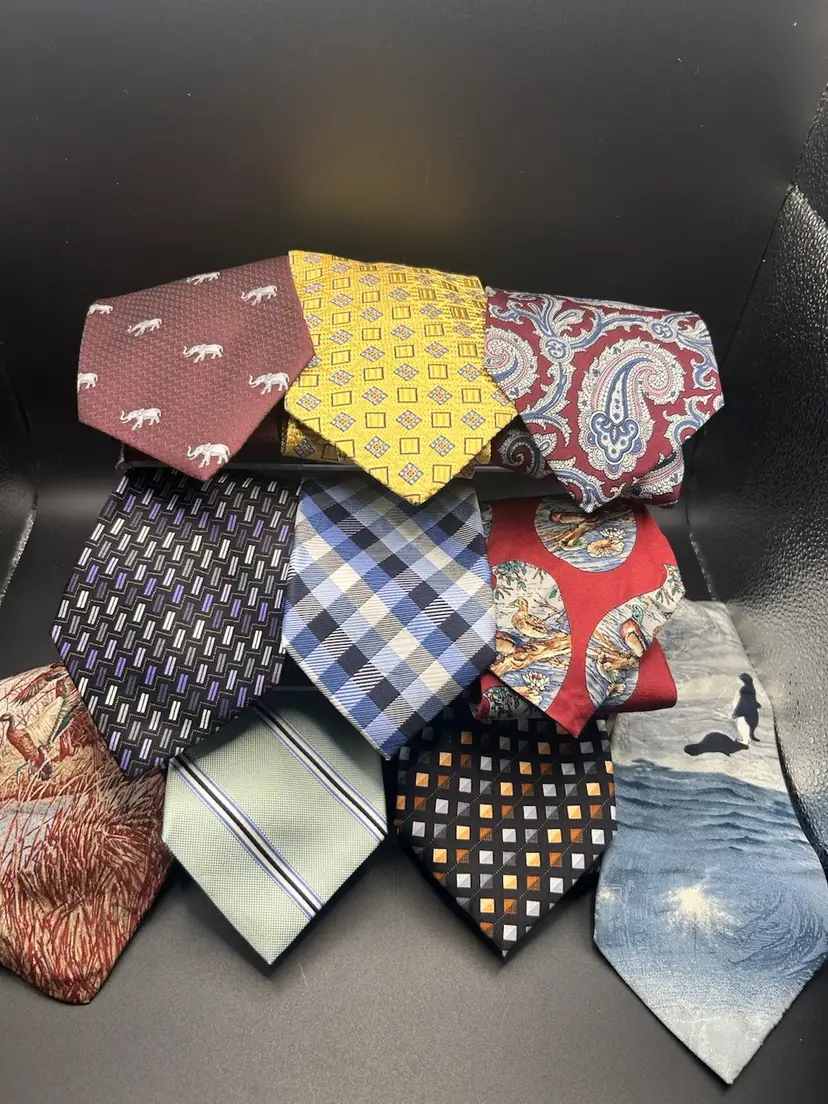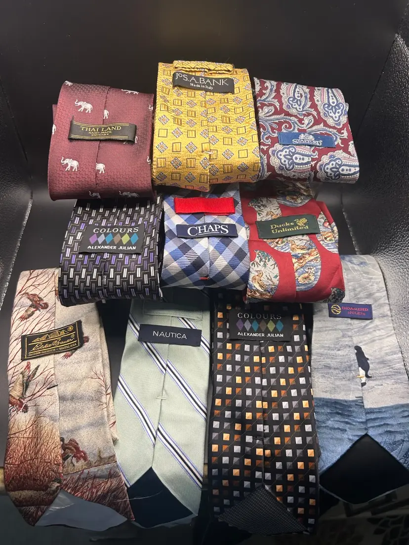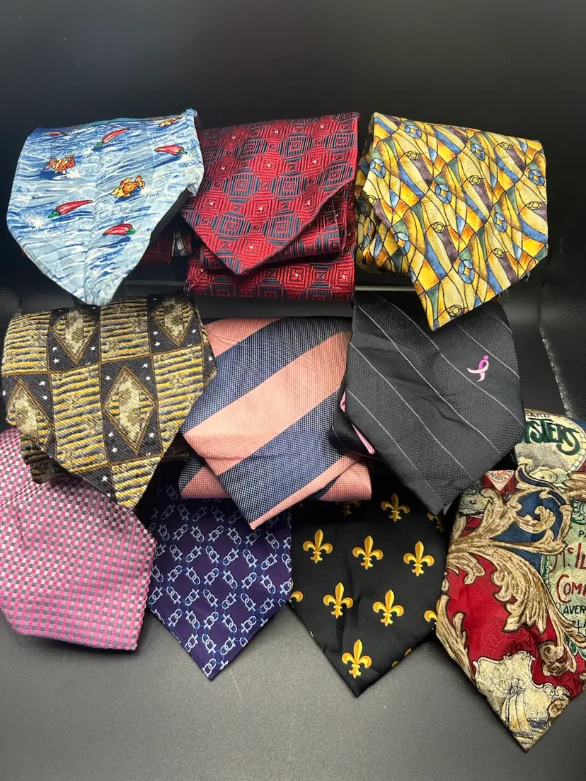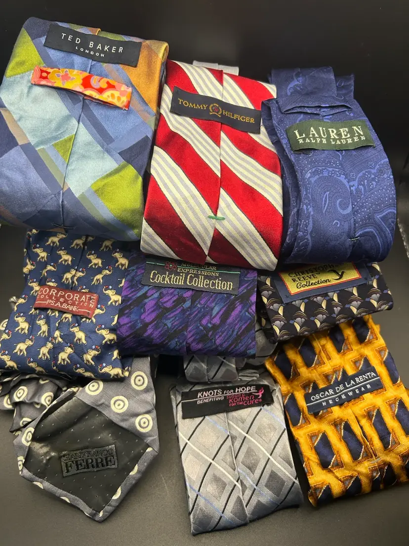 A variety of 33 vintage neckties in great condition. There may be a few that would need some ironing or steaming. Name brands such a Ralph Lauren, Jos A Banks, Susan Komen, Tommy Hilfinger, Oscar De La Renta, Eddie Bauer and more.