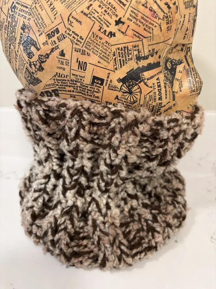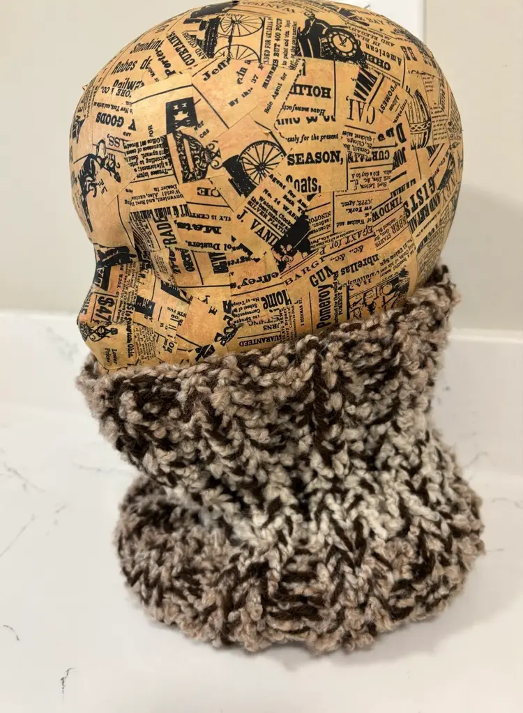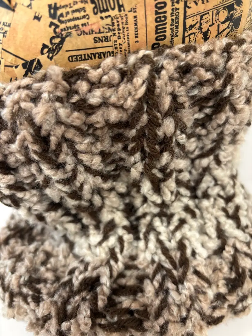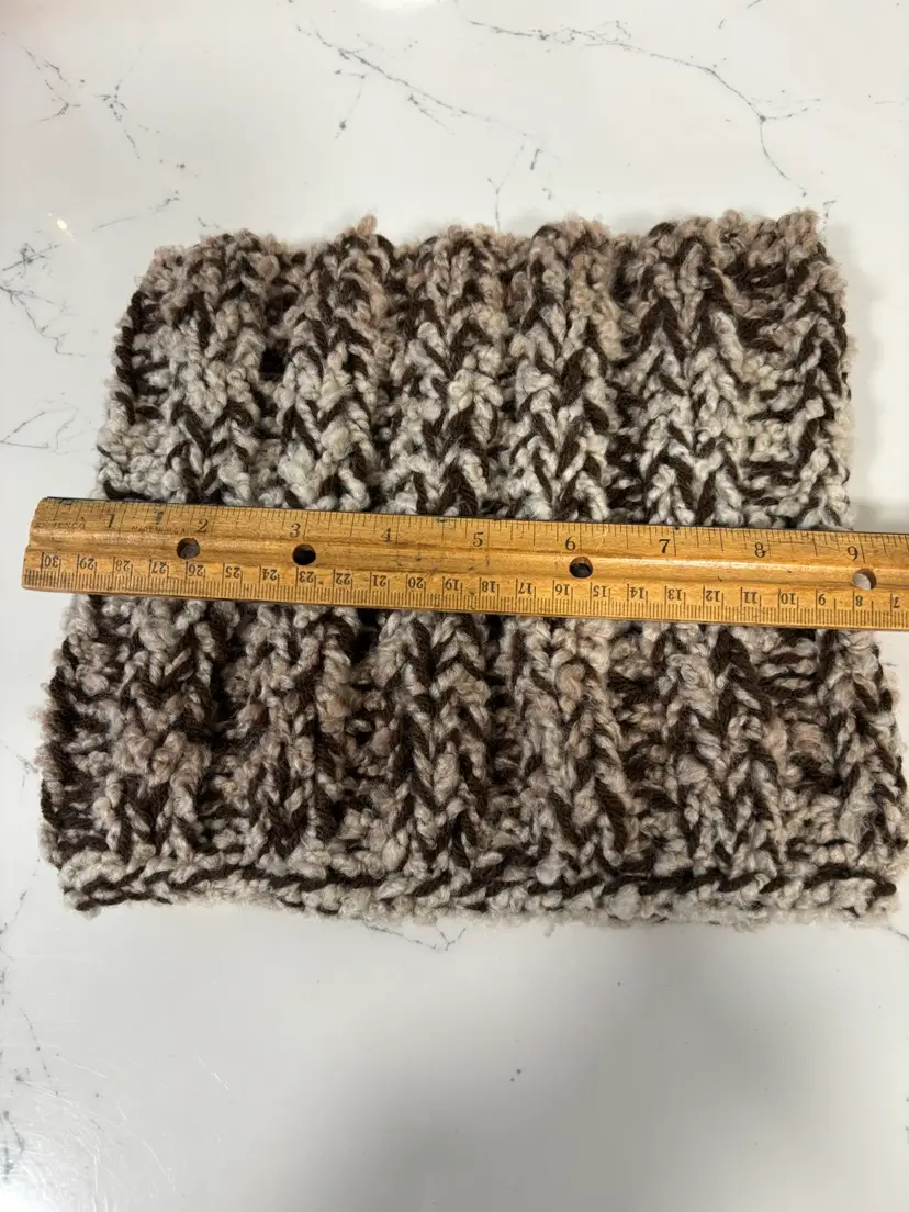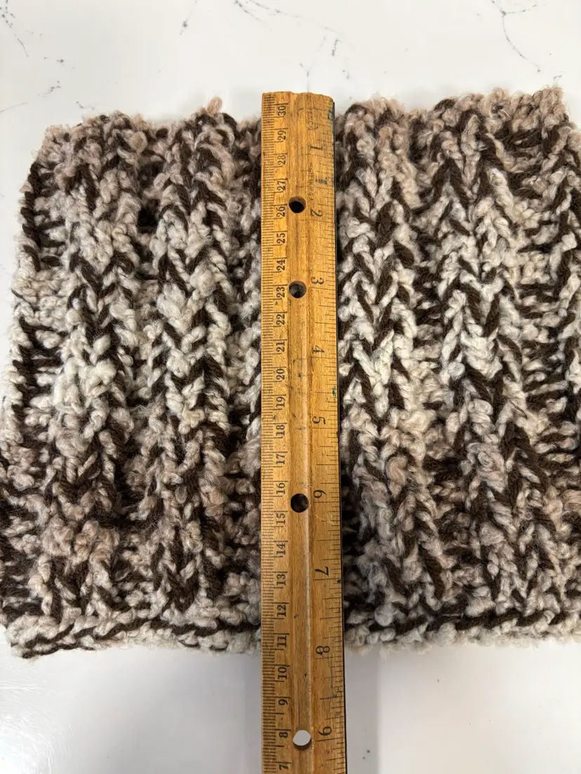 Neckwarmer, super soft double ply tan and brown yarn, 8” tall & 9” wide, stretchy. Hand made be me!! From a smoke and pet free home. Measurements in photos