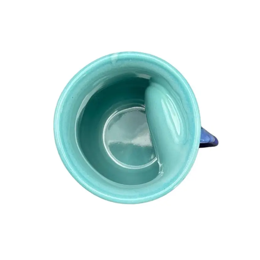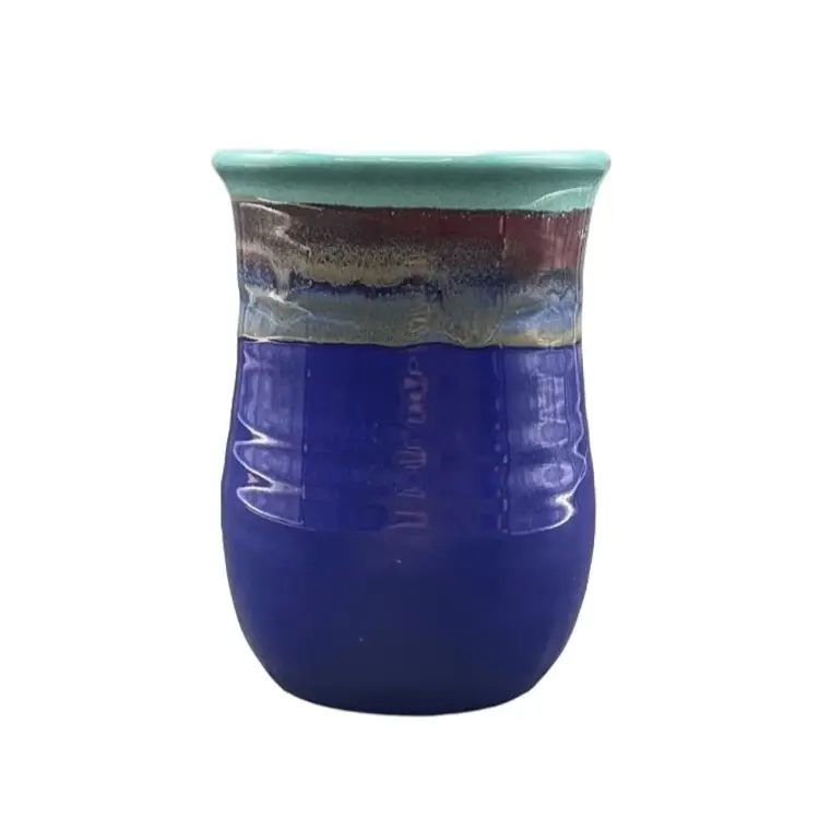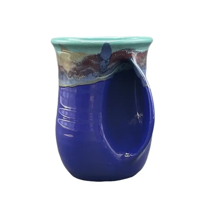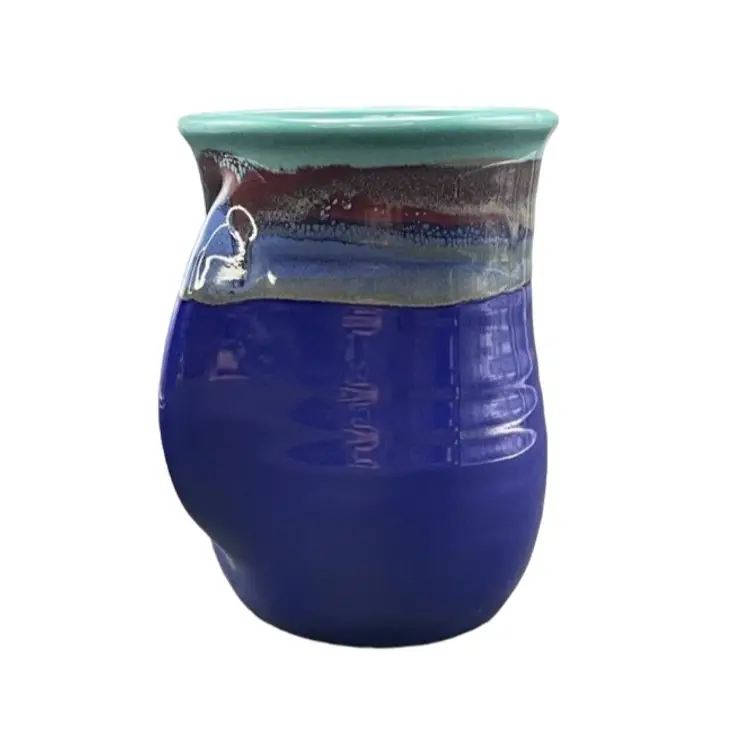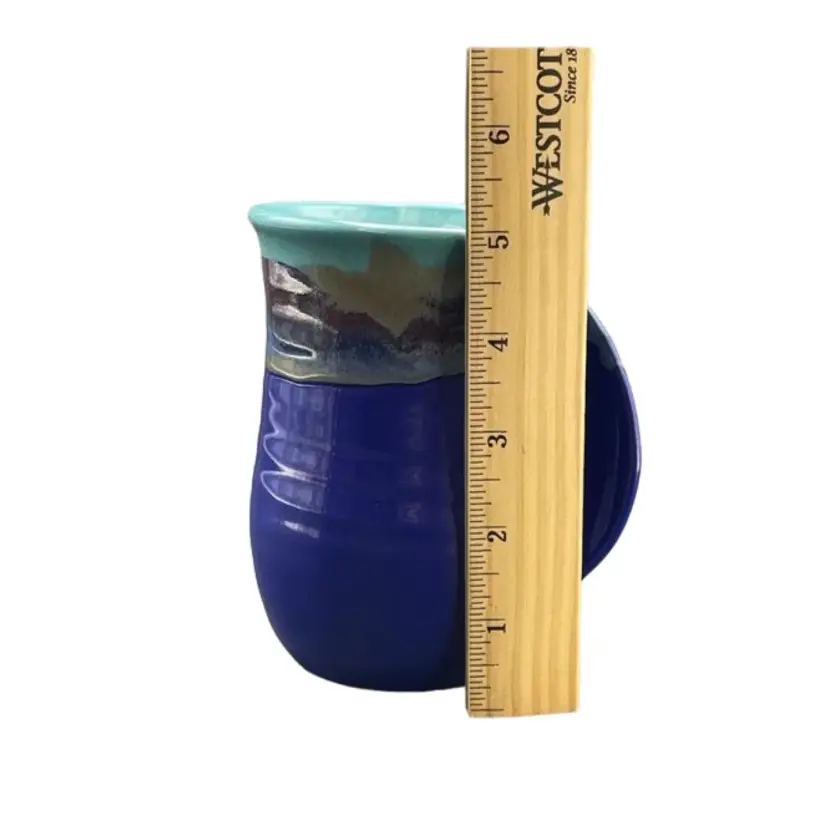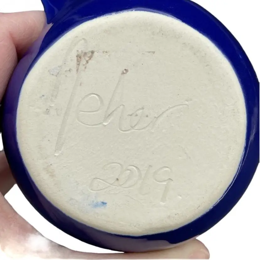 This is an art pottery right hand warmer style coffee mug signed and dated Neher 2019. Made in the USA. Measures approximately 5" tall x 3.5" across, and holds approximately 16fl oz. No major flaws.
