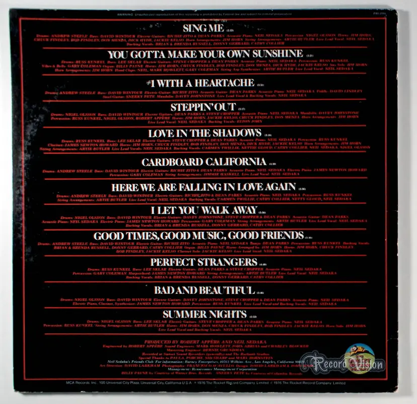 Steppin' Out, was Neil Sedaka's third and final album with The Rocket Record Company in the U.S., marking the end of his comeback trilogy that began with Sedaka's Back and The Hungry Years. The album, issued on Polydor outside the U.S., featured a mix of pop and soft rock, with Sedaka collaborating with lyricists Howard Greenfield and Phil Cody, and included backing vocals by Elton John on the title track. Historically significant for its role in Sedaka's 1970s resurgence, it was promoted with an NBC-TV primetime special titled Steppin' Out, though it received mixed reviews, with critics noting a lack of memorable tunes compared to his earlier work. Hit singles included Love in the Shadows, which peaked at No. 16 on the U.S. Billboard Hot 100, and You Gotta Make Your Own Sunshine, reaching No. 52 on the U.S. pop charts. The song Bad And Beautiful gained popularity among fans in Mexico and Latin America, and was notably reworked as the ending theme for the 1985 anime Mobile Suit Zeta Gundam.