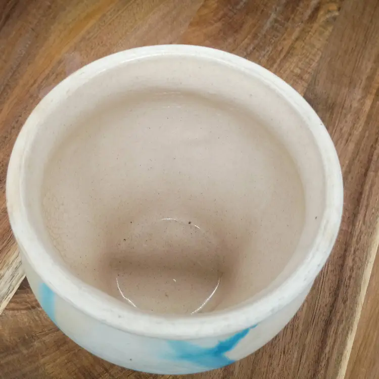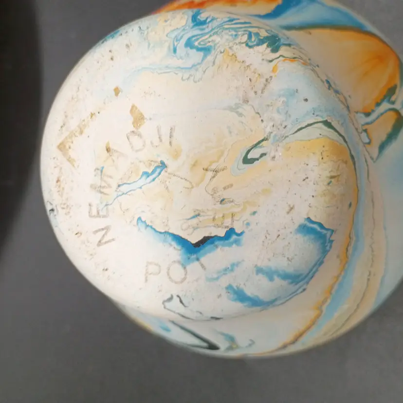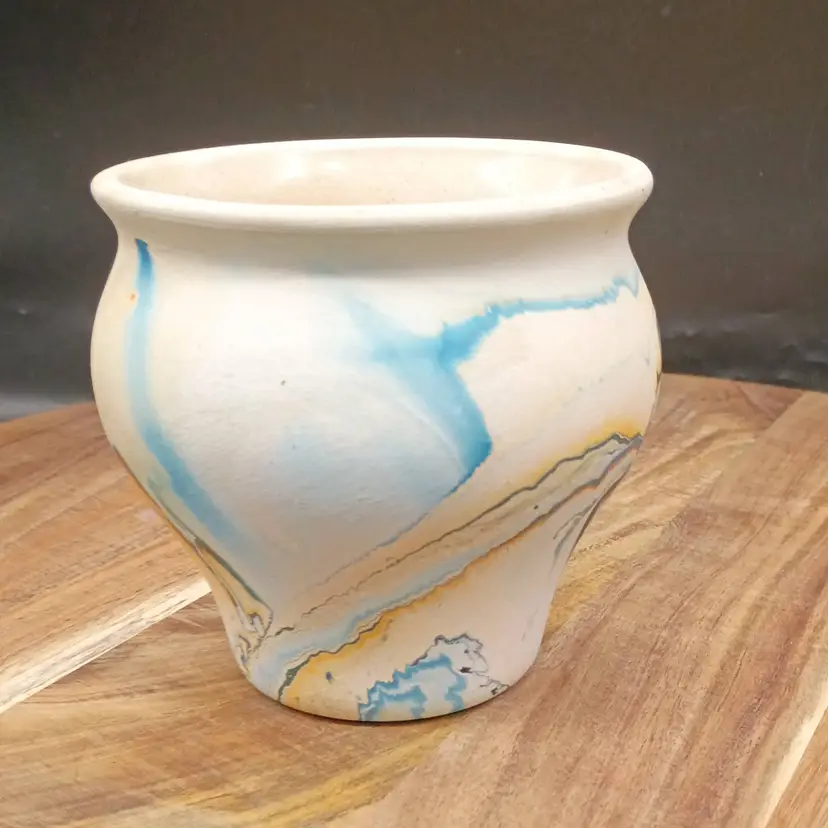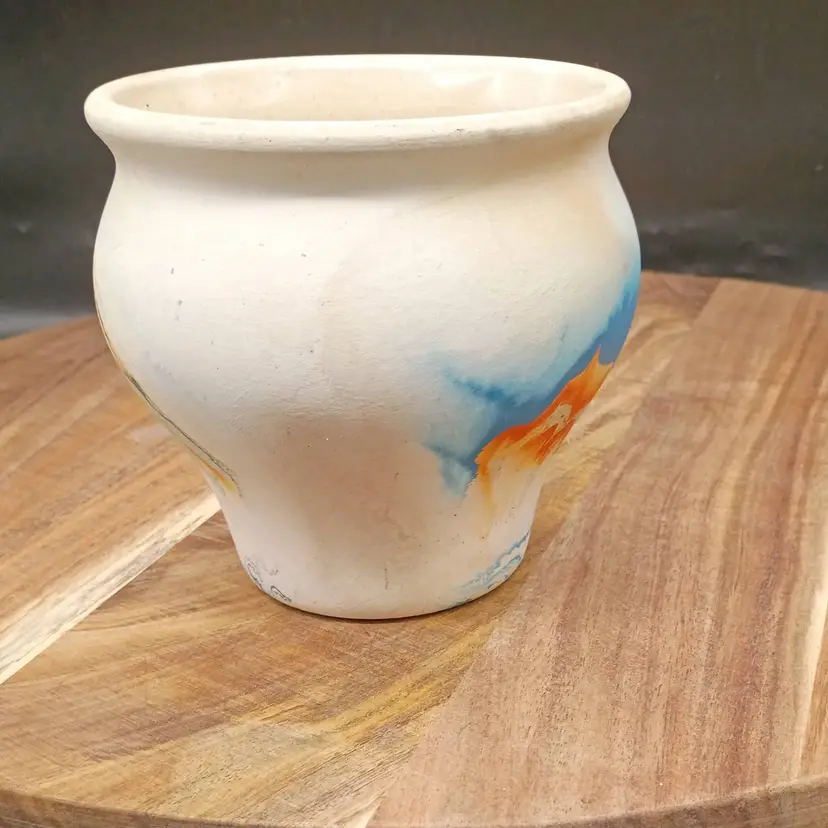 Nemadji Pottery Pot Planter Vase Blues Oranges 1928-1950 Vintage 4" Tall and 4.25 inches in diameter. This is really old Nemadji Pottery from their first 20 years you can tell by the faint Indian head in center of mark dates to prior to 1950. No chips cracks or flea bites. No stains or discoloration. Excellent Condition. Ships USPS,