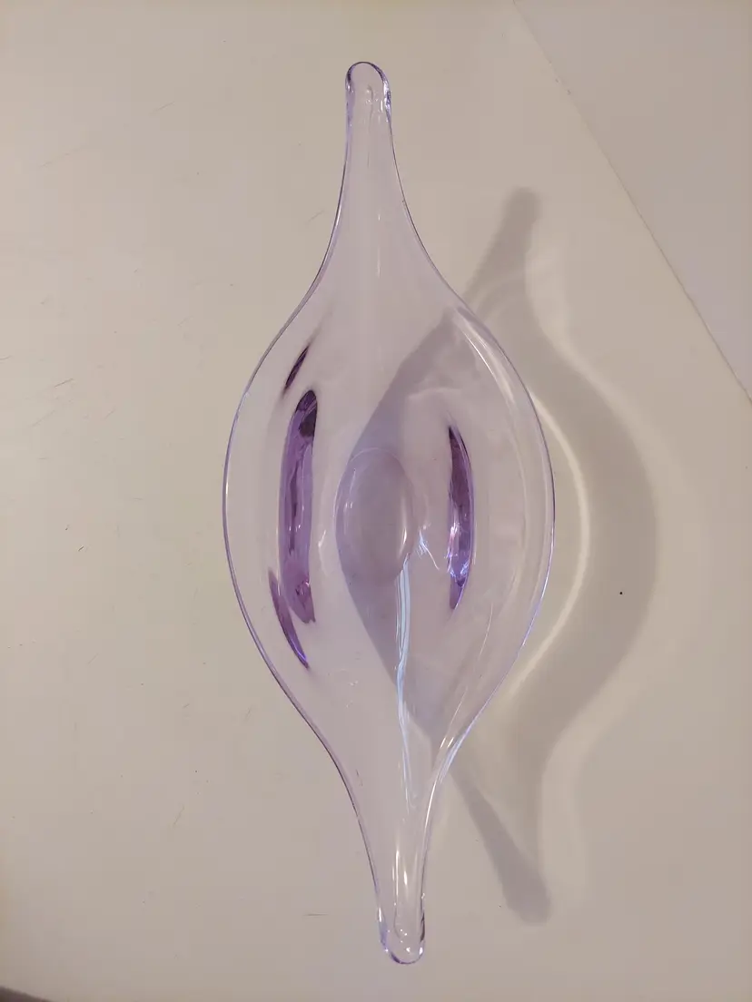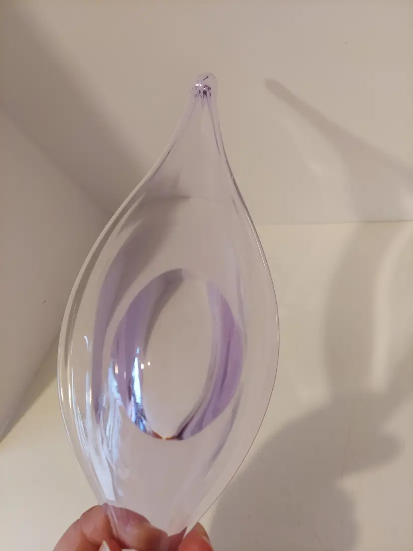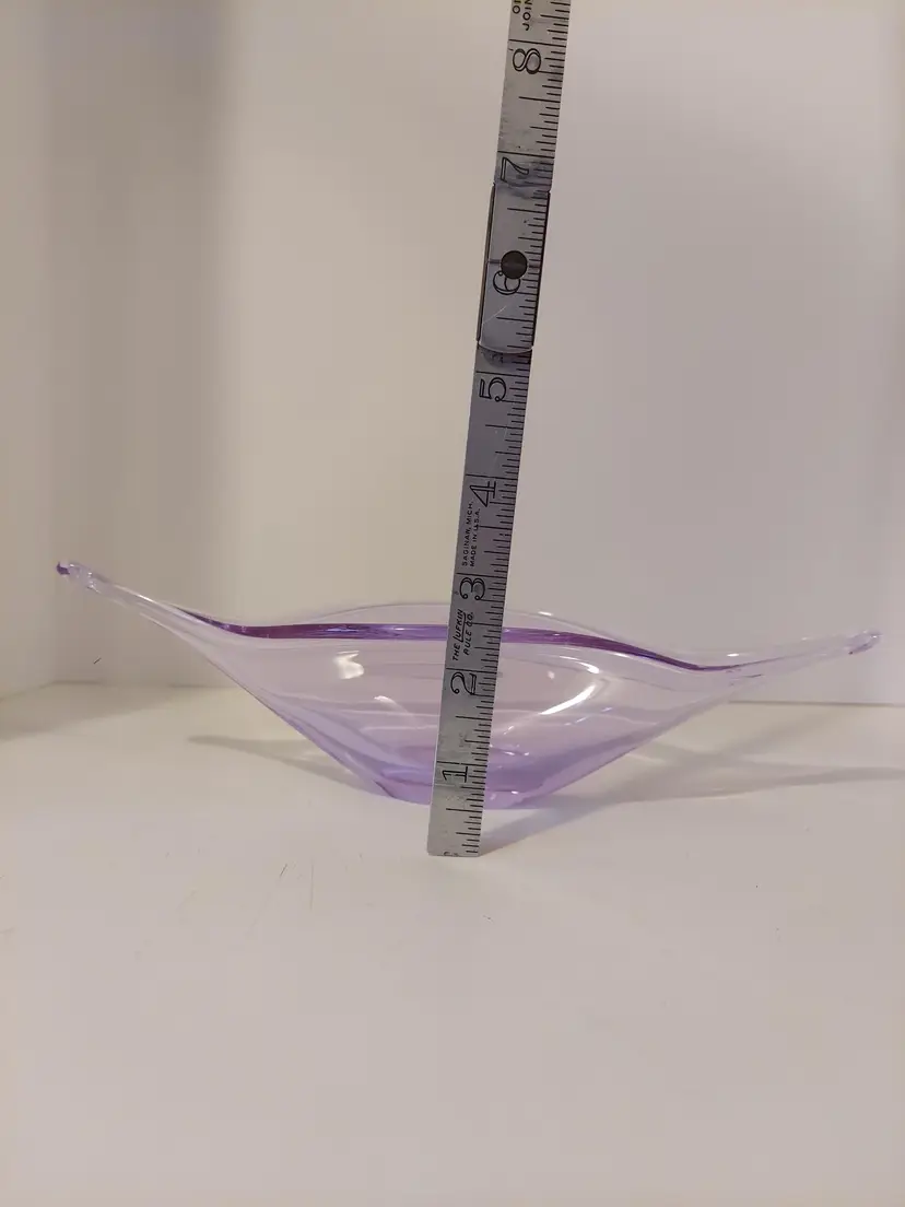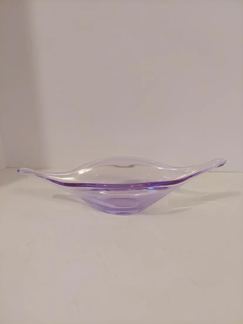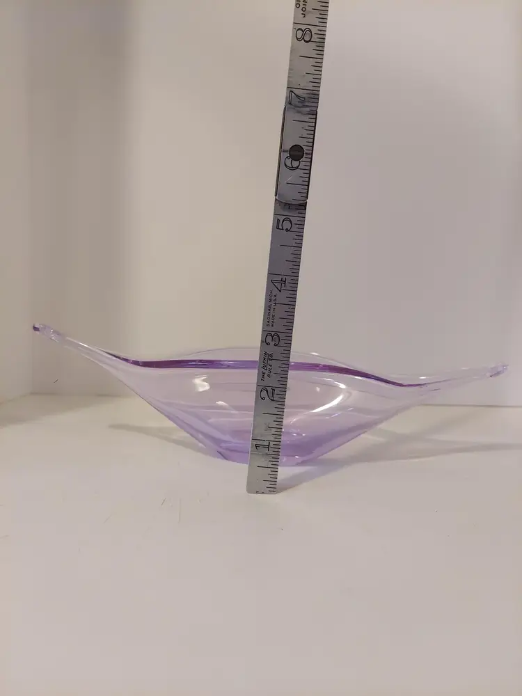 This gorgeous neodymium glass dish measures approximately 10.5×4×3 inches and is in good condition. It changes from a beautiful, pale lavender to an almost clear, pale blue depending on the light. There are no signatures or markings. There is a defect in the glass, please see second to last photo, and a few minor scratches that I could not get in photos.