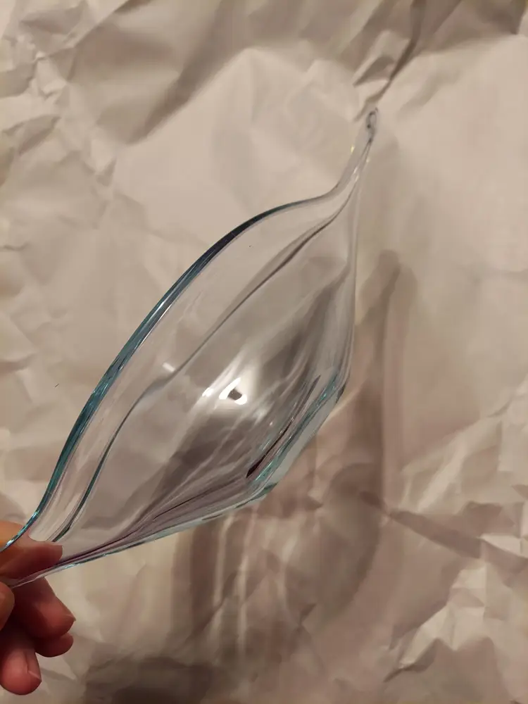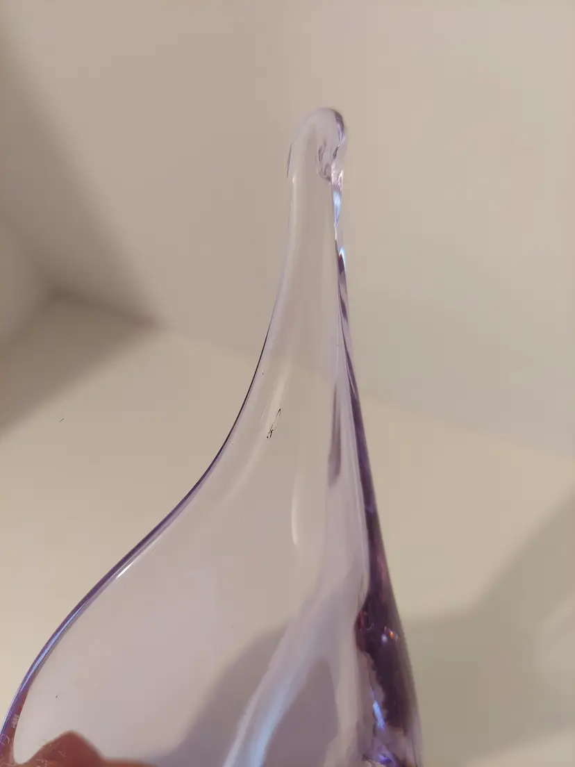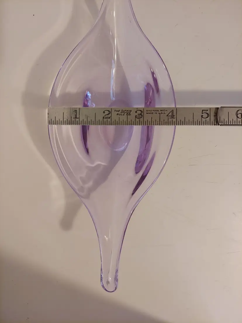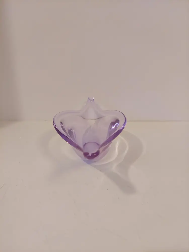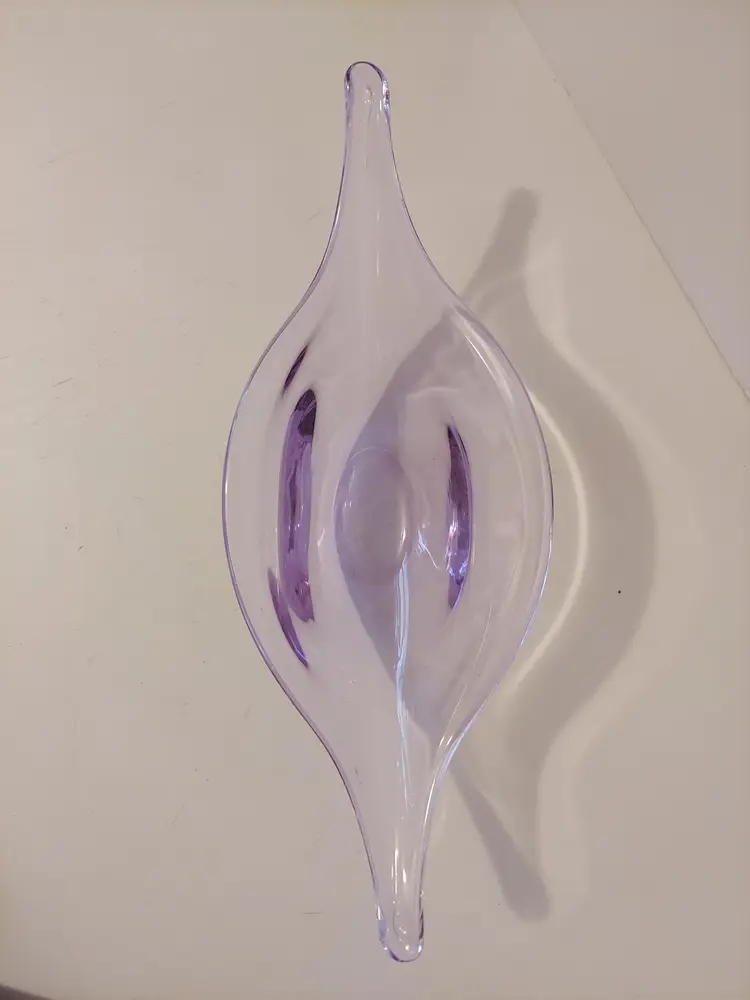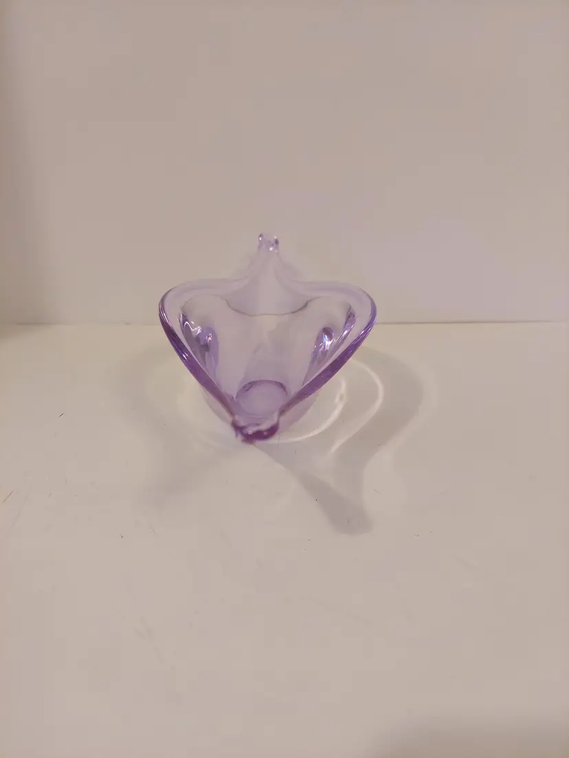 This gorgeous neodymium glass dish measures approximately 10.5×4×3 inches and is in good condition. It changes from a beautiful, pale lavender to an almost clear, pale blue depending on the light. There are no signatures or markings. There is a defect in the glass, please see second to last photo, and a few minor scratches that I could not get in photos.