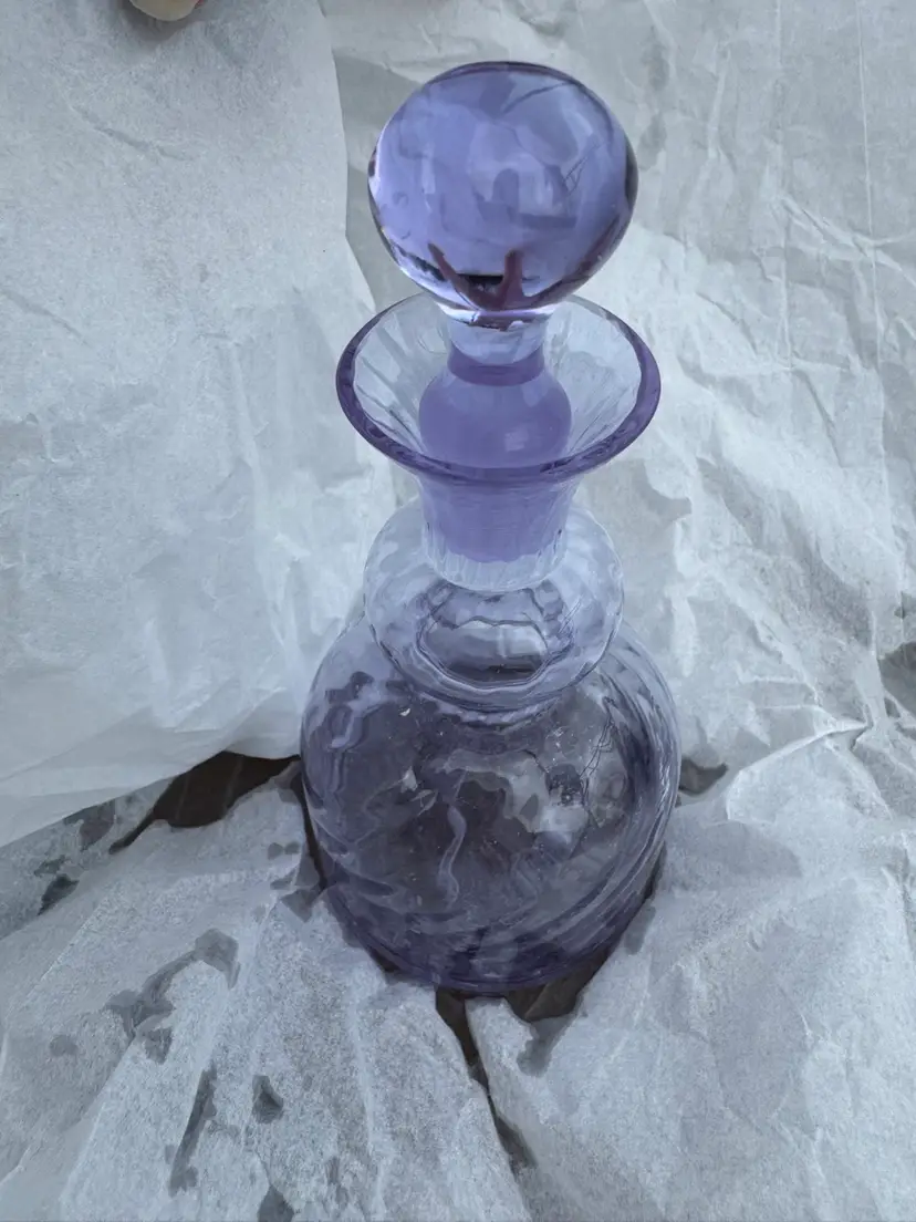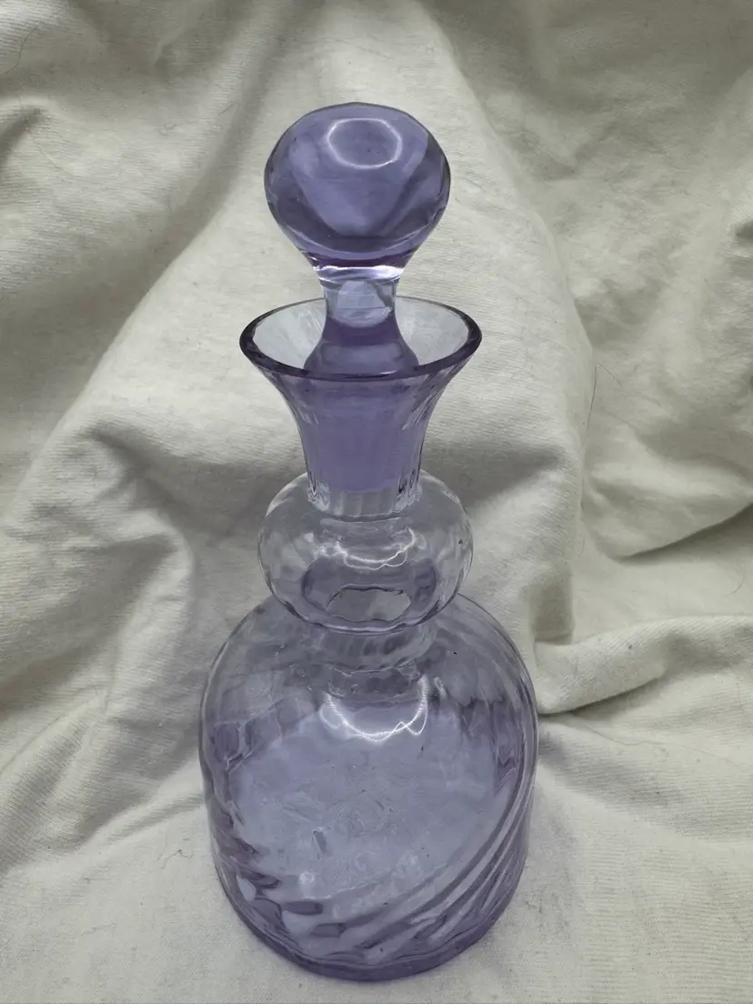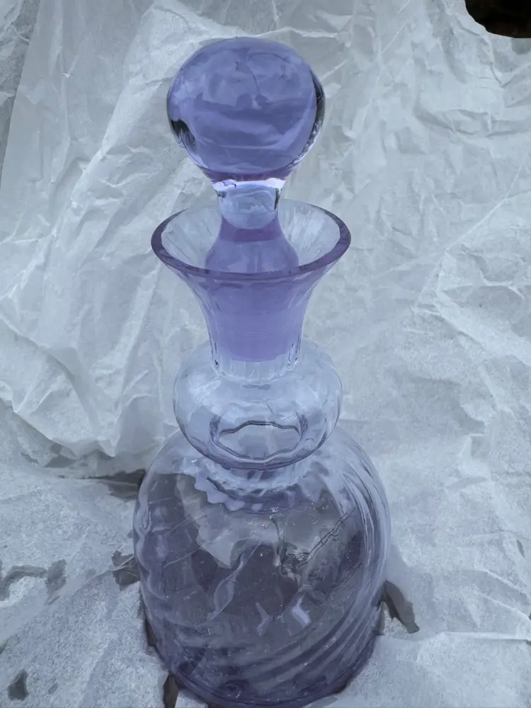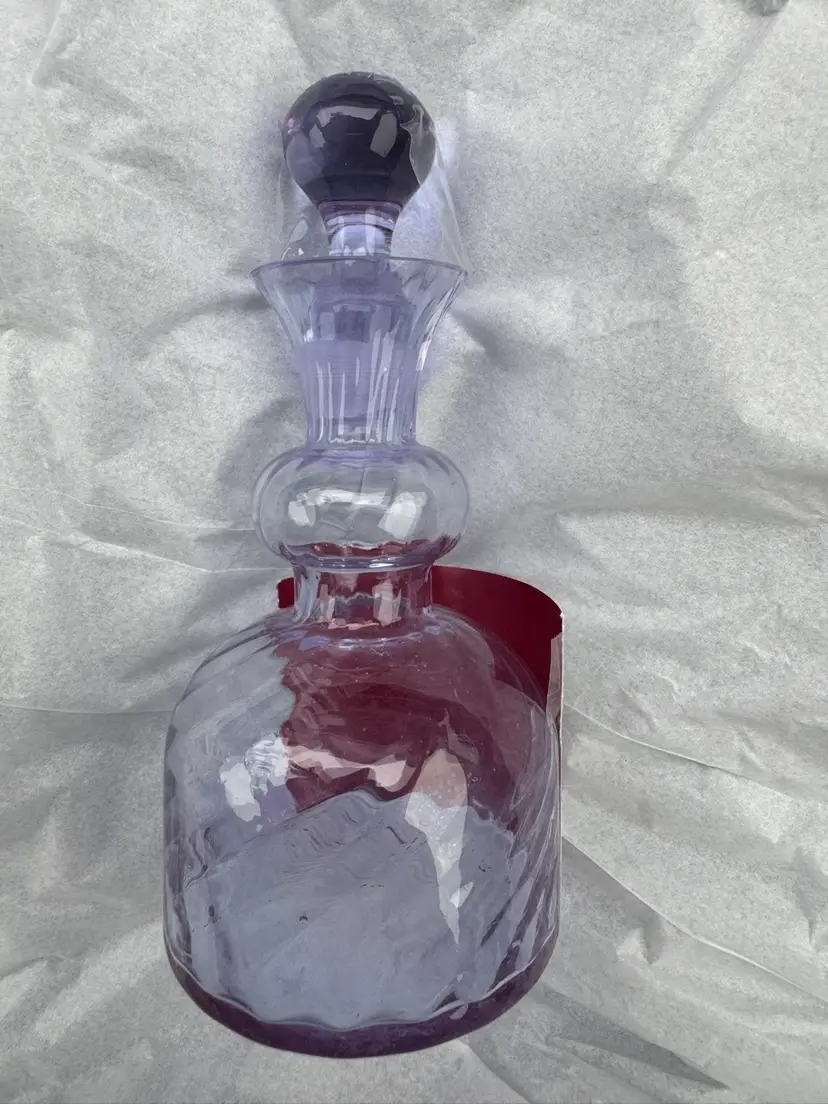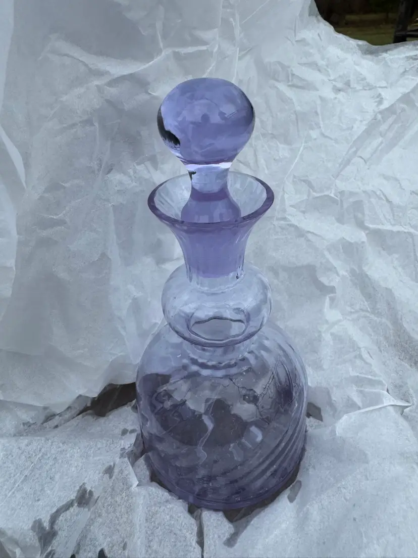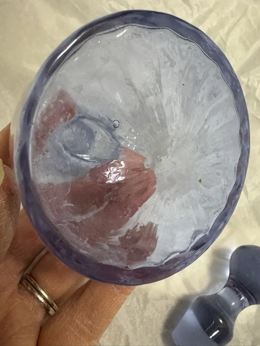 Beautiful neodymium glass bottle. Photos don’t do her justice. She does change color when moved between fluorescent light and daylight. I hope the photos show this well. There are no cracks, a few flea bites on the stopper. There are some little bubbles and minor imperfections within the glass. There are water spots in the bottom, looks more like dried water rather than damage. I will be washing it before it leaves my home so that and the little bits of “stuff” should be gone. She’s 6 1/4” tall with stopper in place, 5” without. Stopper is about 2 1/2”, base is 3”. Please message me if you have any questions. I’ll be happy to answer. Added pictures of day she came home with me.