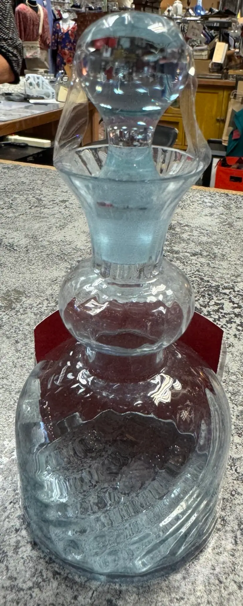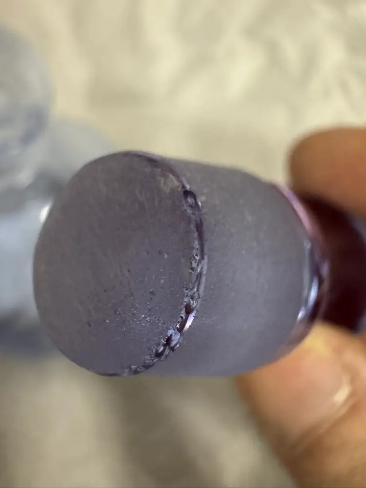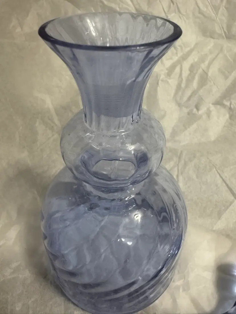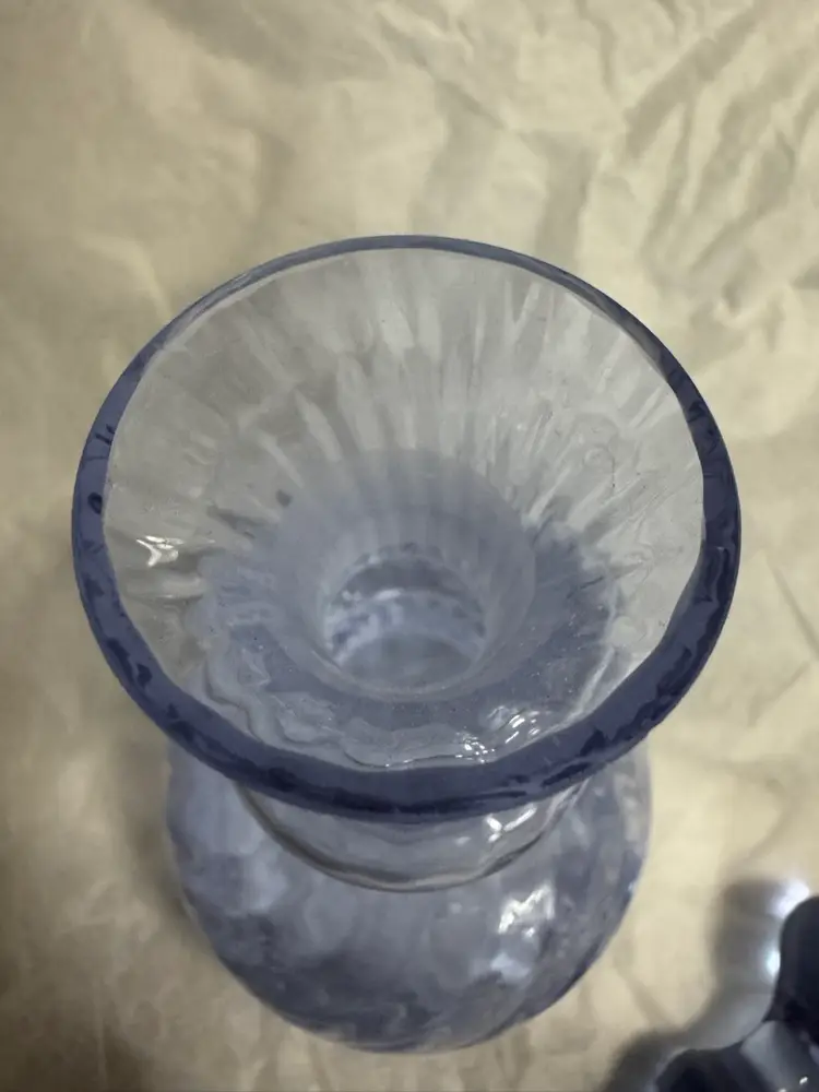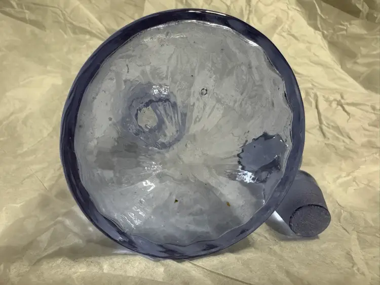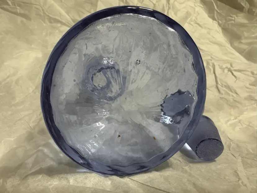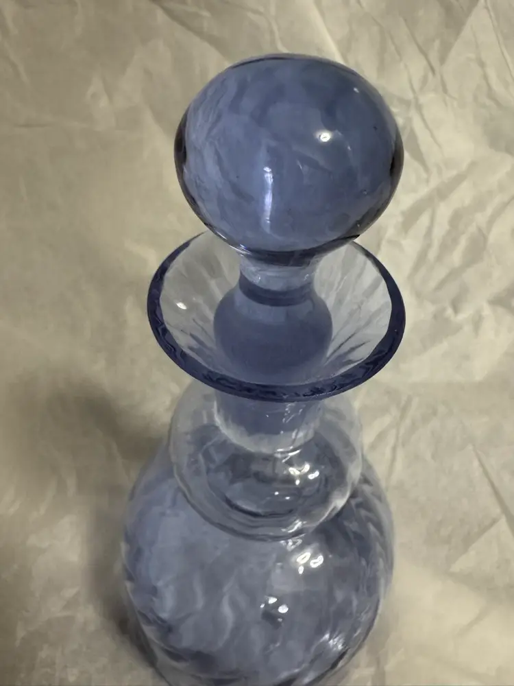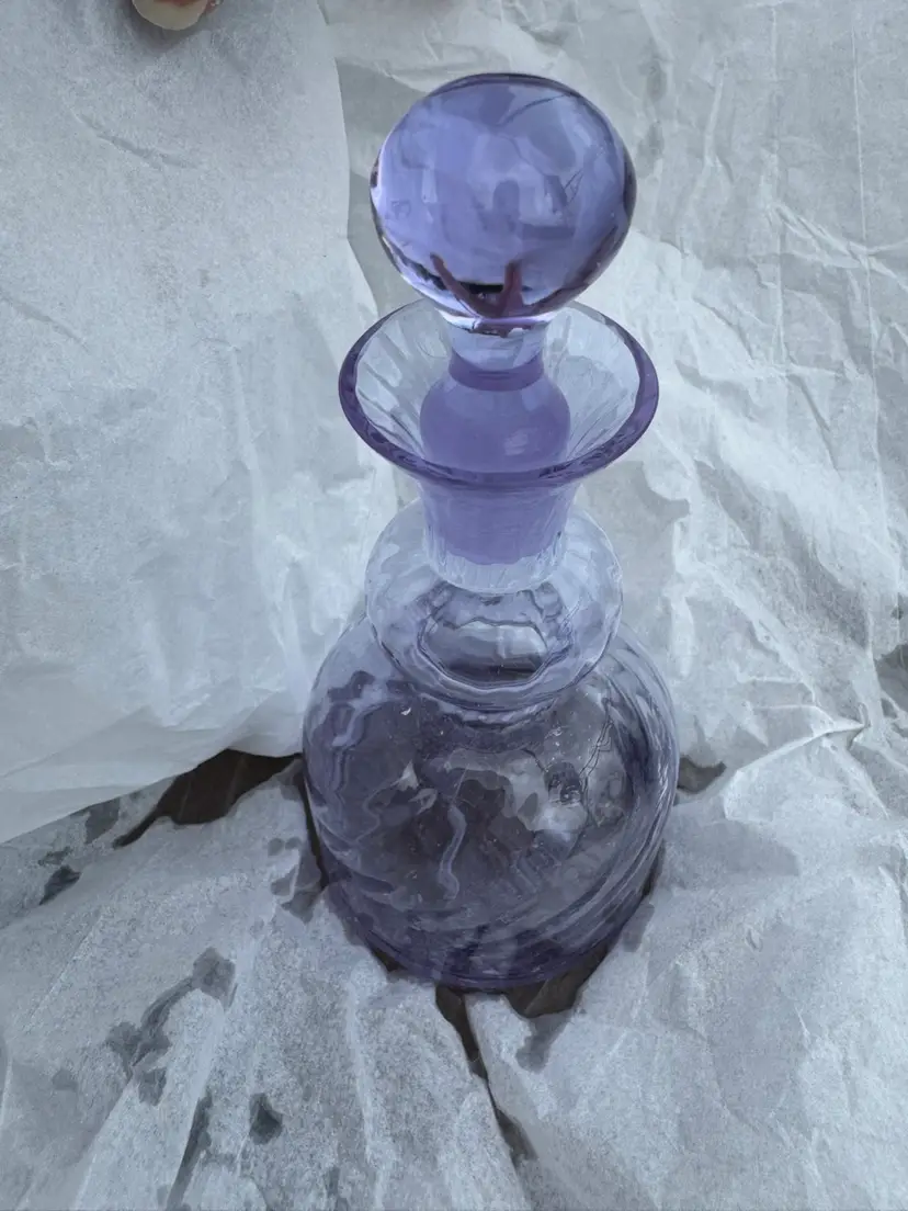 Beautiful neodymium glass bottle. Photos don’t do her justice. She does change color when moved between fluorescent light and daylight. I hope the photos show this well. There are no cracks, a few flea bites on the stopper. There are some little bubbles and minor imperfections within the glass. There are water spots in the bottom, looks more like dried water rather than damage. I will be washing it before it leaves my home so that and the little bits of “stuff” should be gone. She’s 6 1/4” tall with stopper in place, 5” without. Stopper is about 2 1/2”, base is 3”. Please message me if you have any questions. I’ll be happy to answer. Added pictures of day she came home with me.