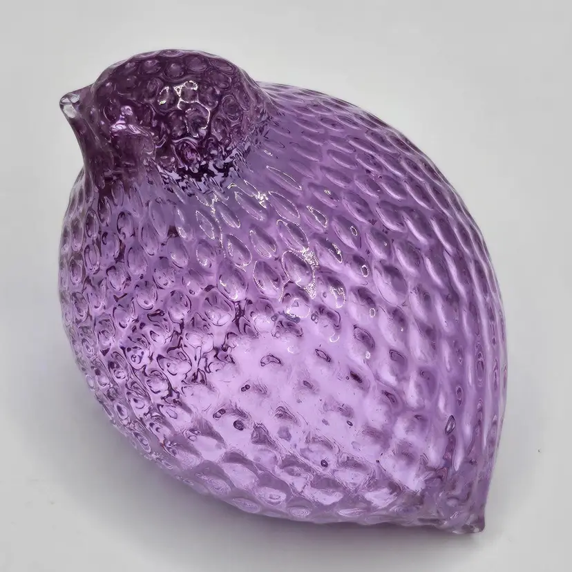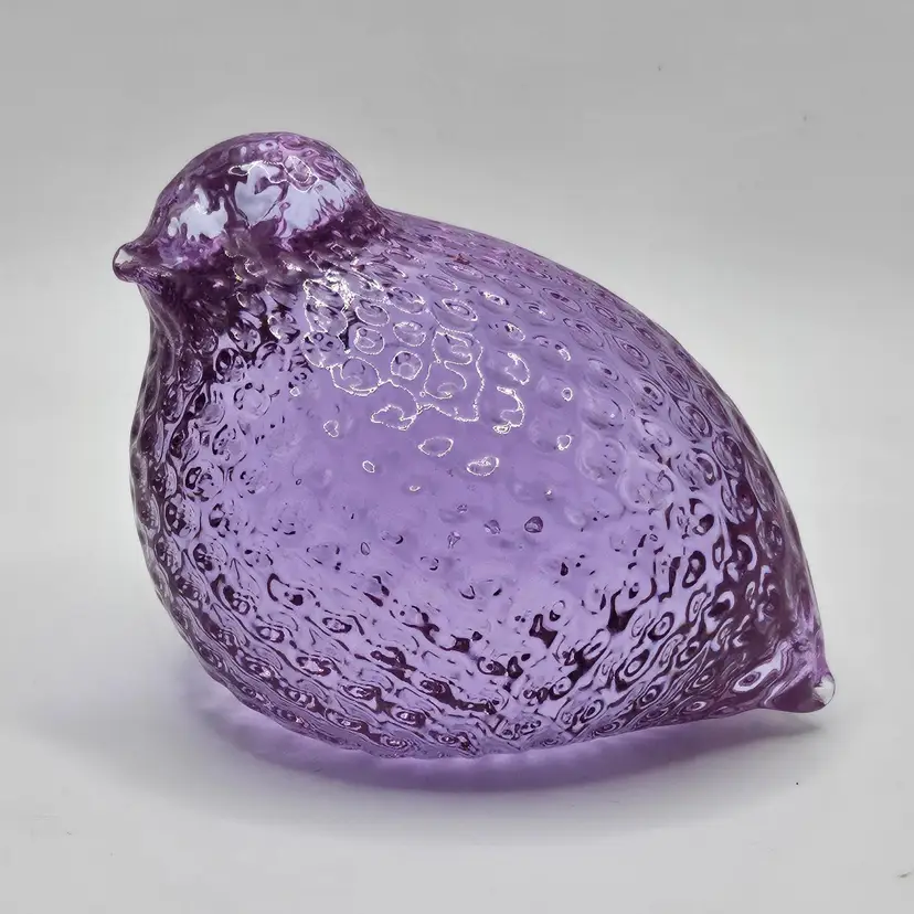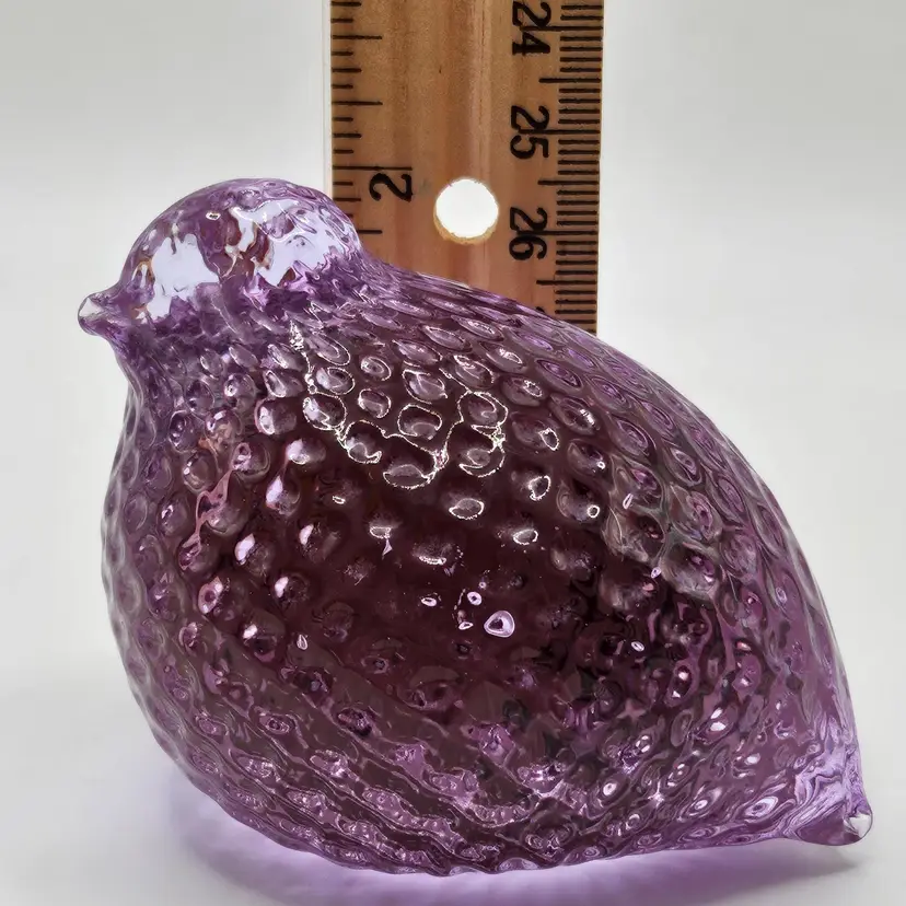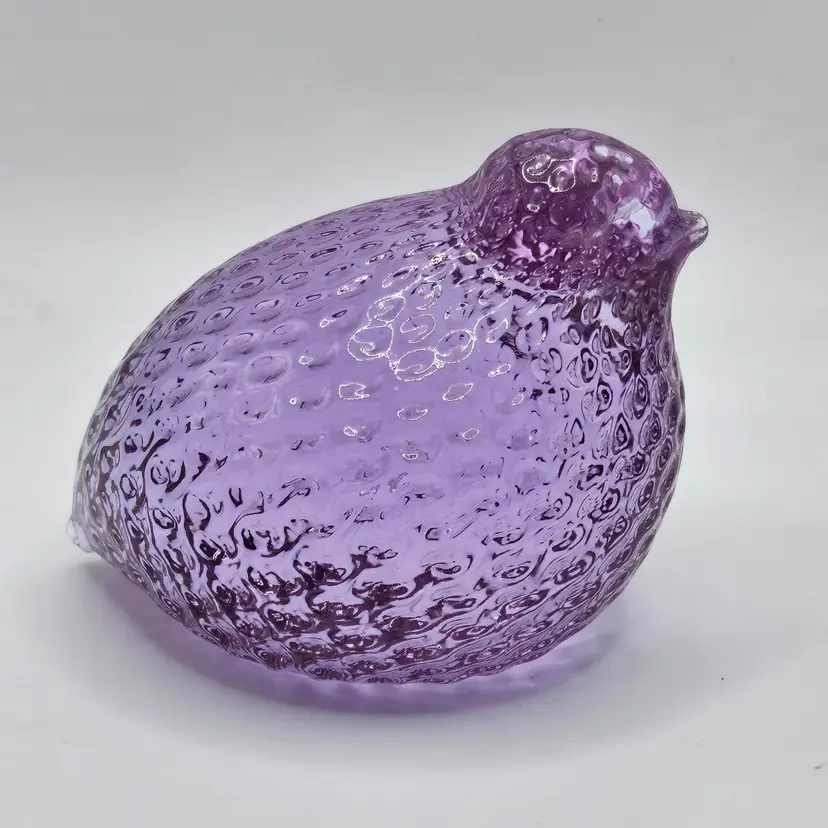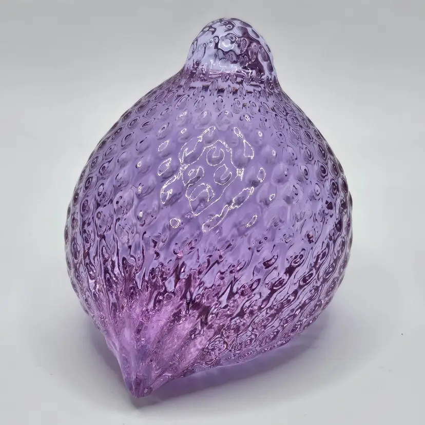 Absolutely GORGEOUS eye catching Chunky little quail/bird paperweight figurine! Unknown maker/artist and unsigned. Has a stunning optic like texture to it that adds to its appeal. The base is finished off with a nice smooth sand blasted finish. Appears to have had a sticker on the base at one point. Made of the amazing neodymium or alexandrite glass and changes color from a periwinkle blue to a gorgeous lavender purple! I did not notice any damage on this item, but there are a few very small scratches on the base due to sliding on furniture and surfaces. Nothing major or super noticeable.