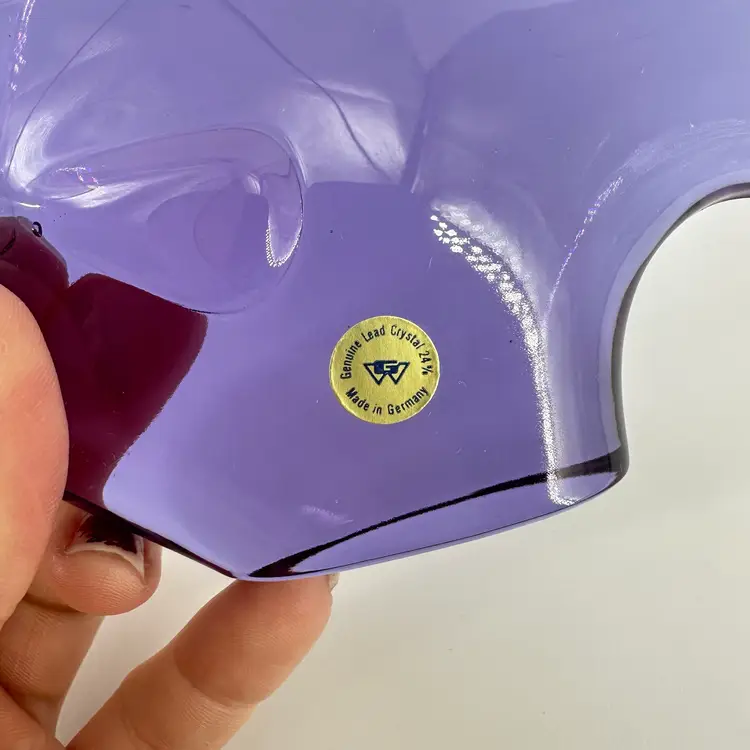 Neodymium fish made of 24% lead crystal glass in Germany. No chips, cracks, or signatures. There is a sticker on fish stating “Genuine Leas Crystal 24% Made In Germany”. See photos. Fish measures approximately 4” tall and 4.75” long.