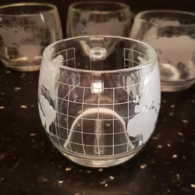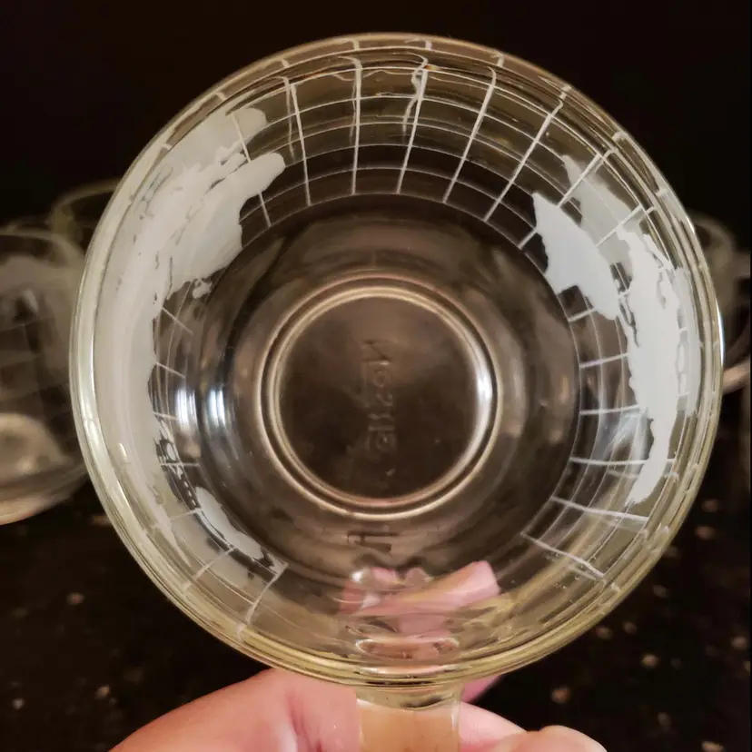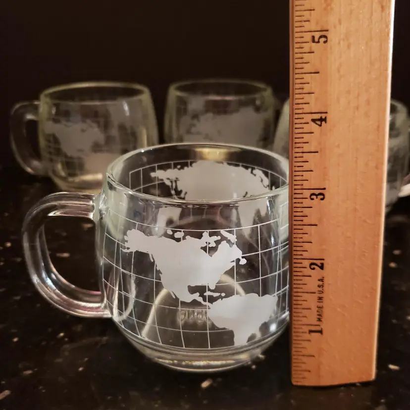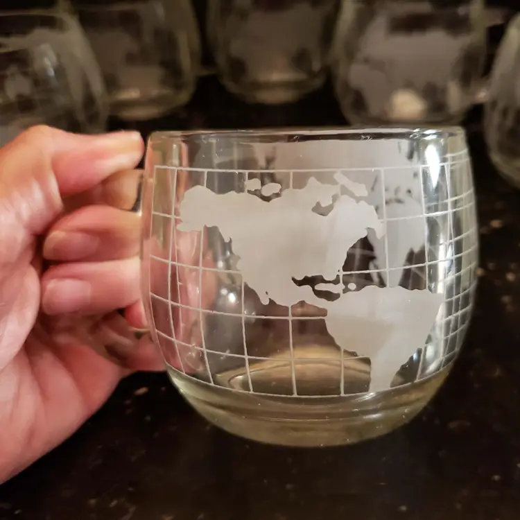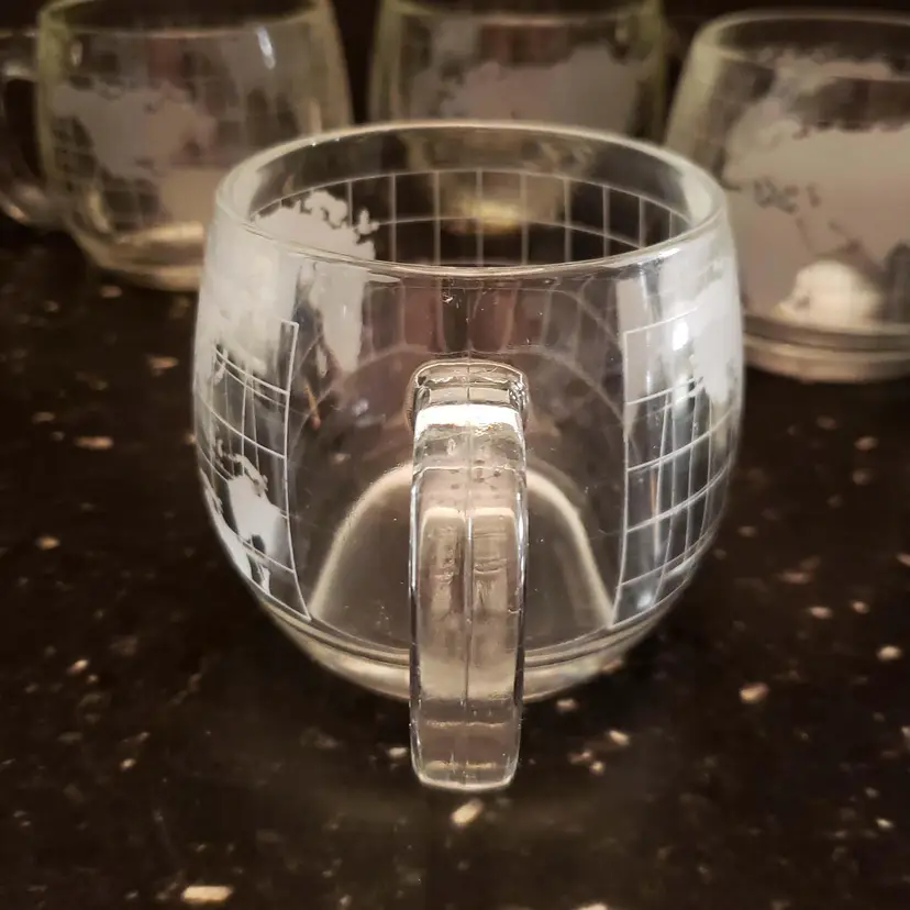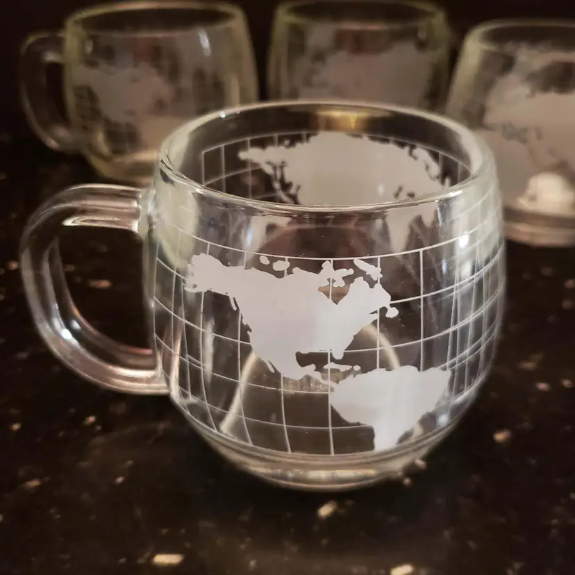 Nestle Nescafe Coffee Cups Mugs World Map Globe Clear Etched Glass Vintage 1970s