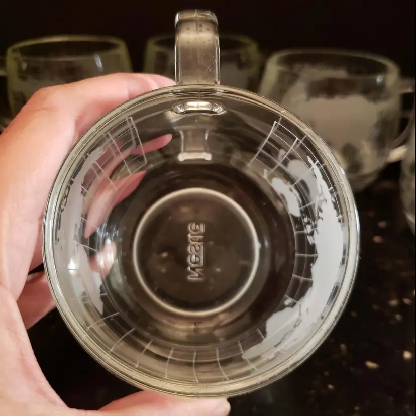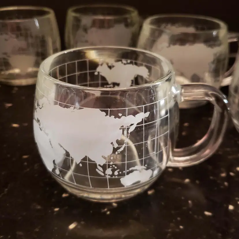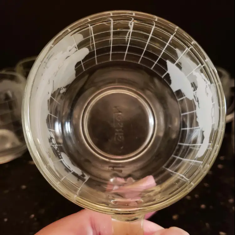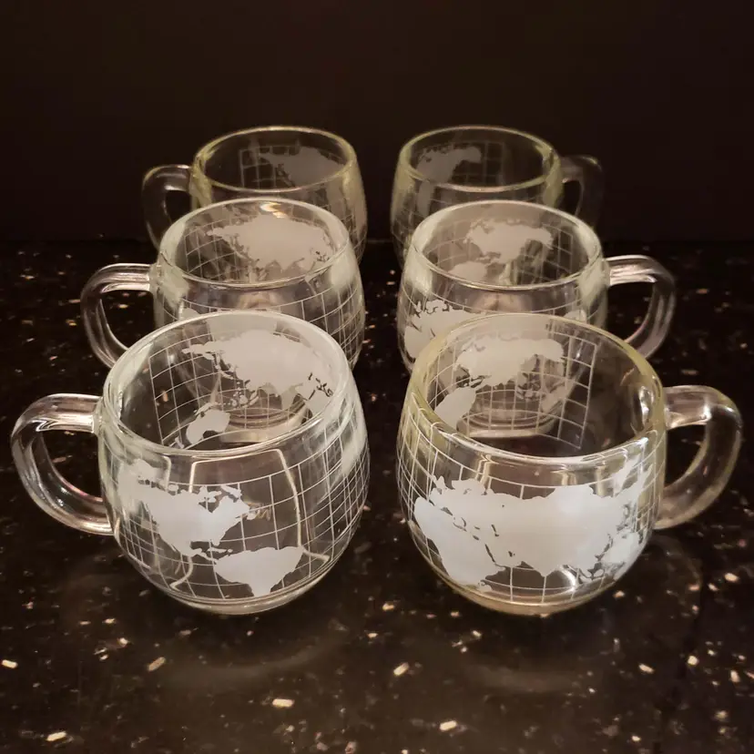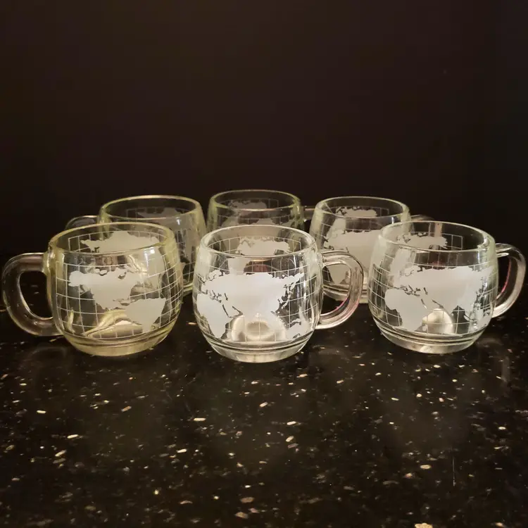 Set of 6 Nestle Nescafe Coffee Cups Mugs Etched World Map Globe Clear Glass Vintage 1970s